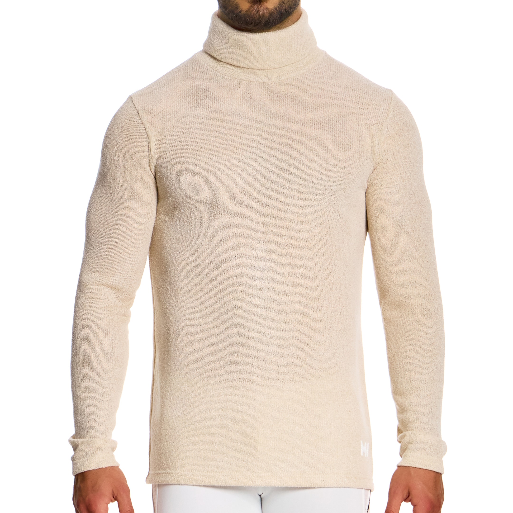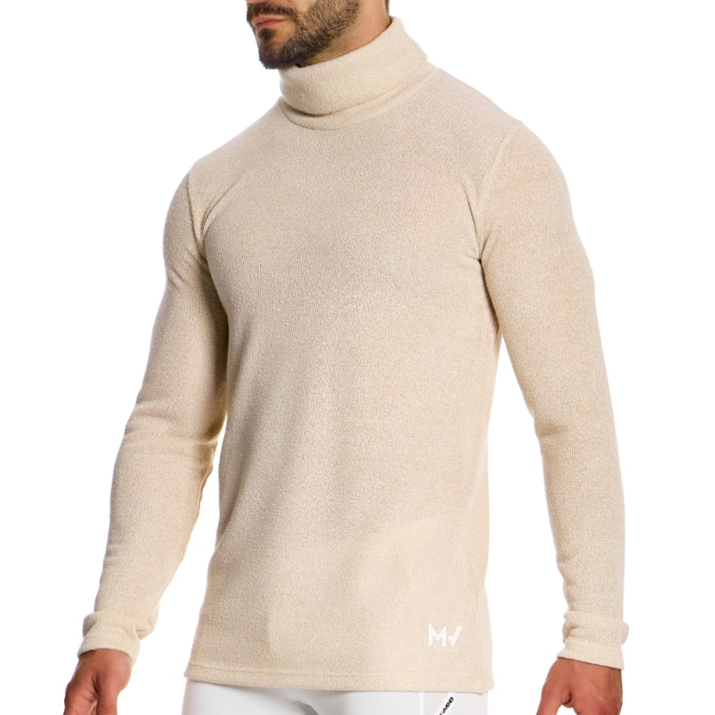T-shirt minimaliste, simple et élégant, réalisé en maille tricotée monochomatique lisse. Manches longues et col roulé. Logo MV sur la hanche gauche.