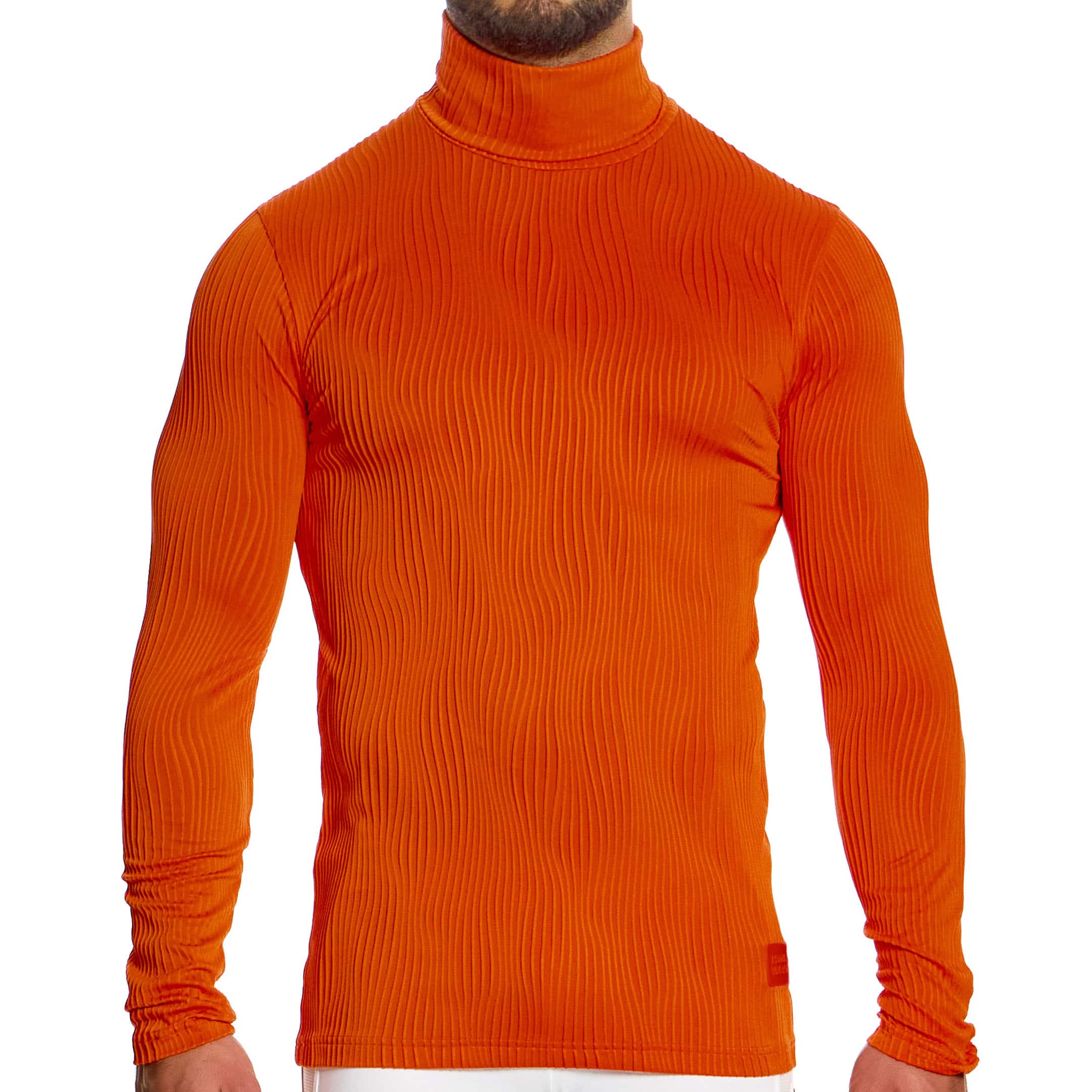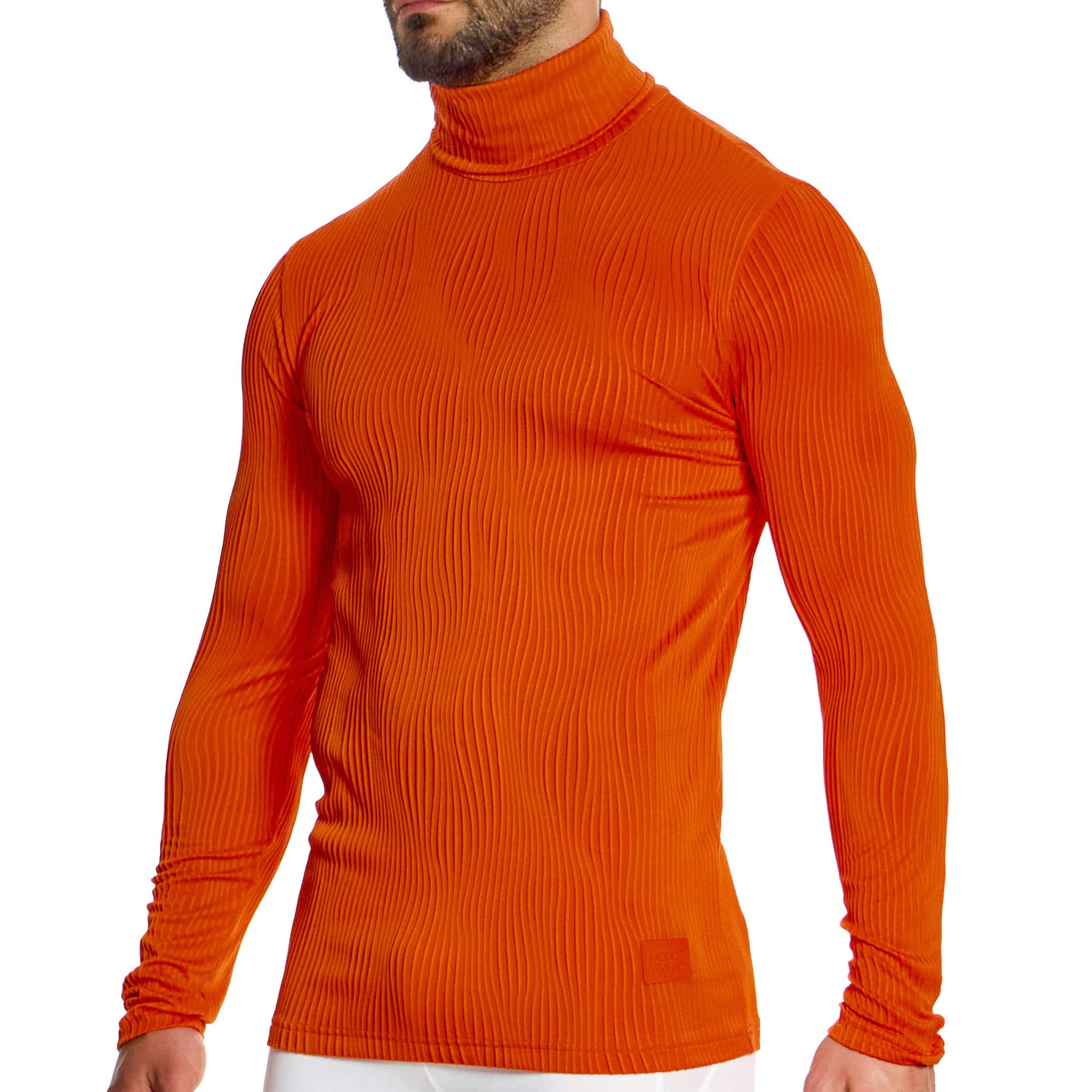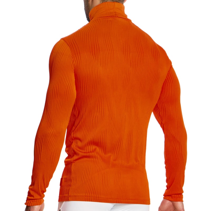 T-shirt luxueux et futuriste en microfibre extensible super douce. Motif jacquard texturé et ondulé. Col roulé et manches longues. Logo Modus Vivendi à la taille.