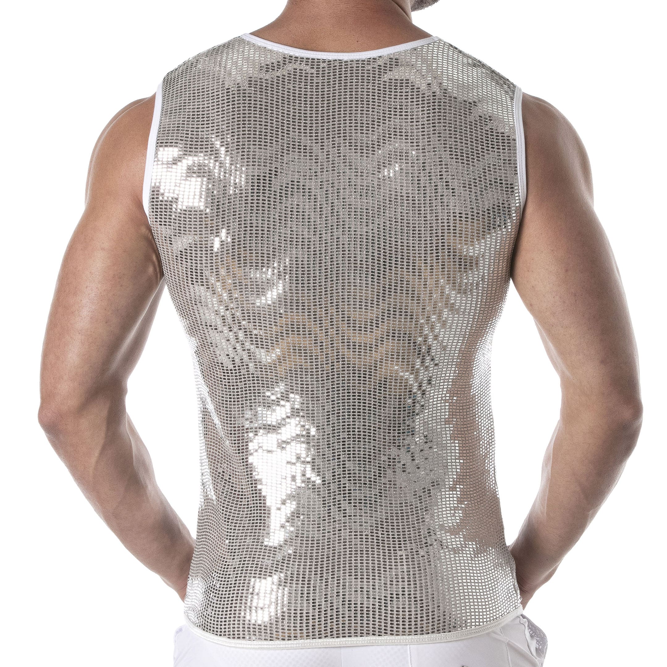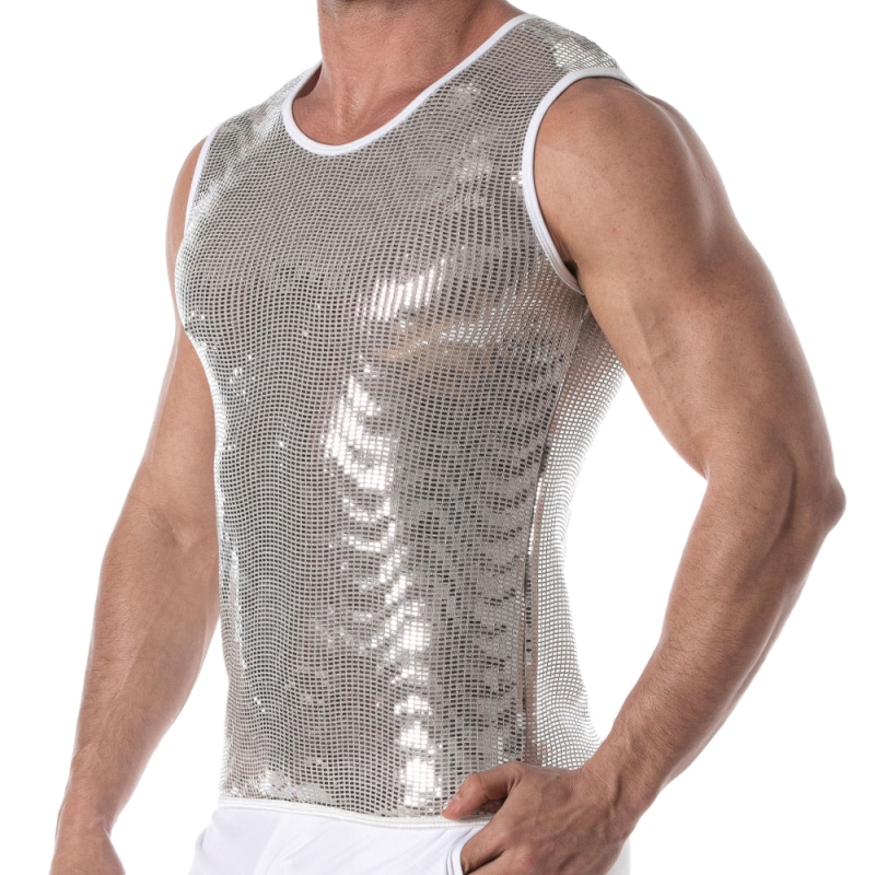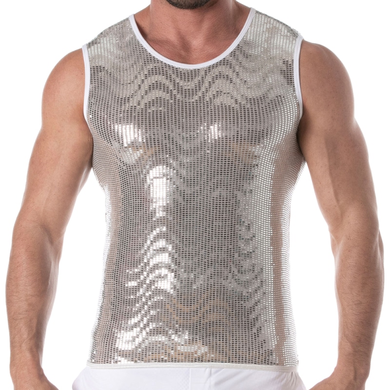 Débardeur sexy en microfibre recouverte de carreaux scintillants pour un effet boule à facette. Bordures contrastées. Col rond. Logo TOF Paris sur la poitrine. Fabrication française. Conseils d'entretien : laver à la main, ne pas sécher en machine, ne pas repasser.