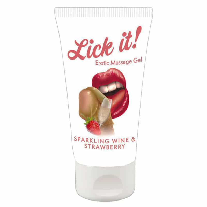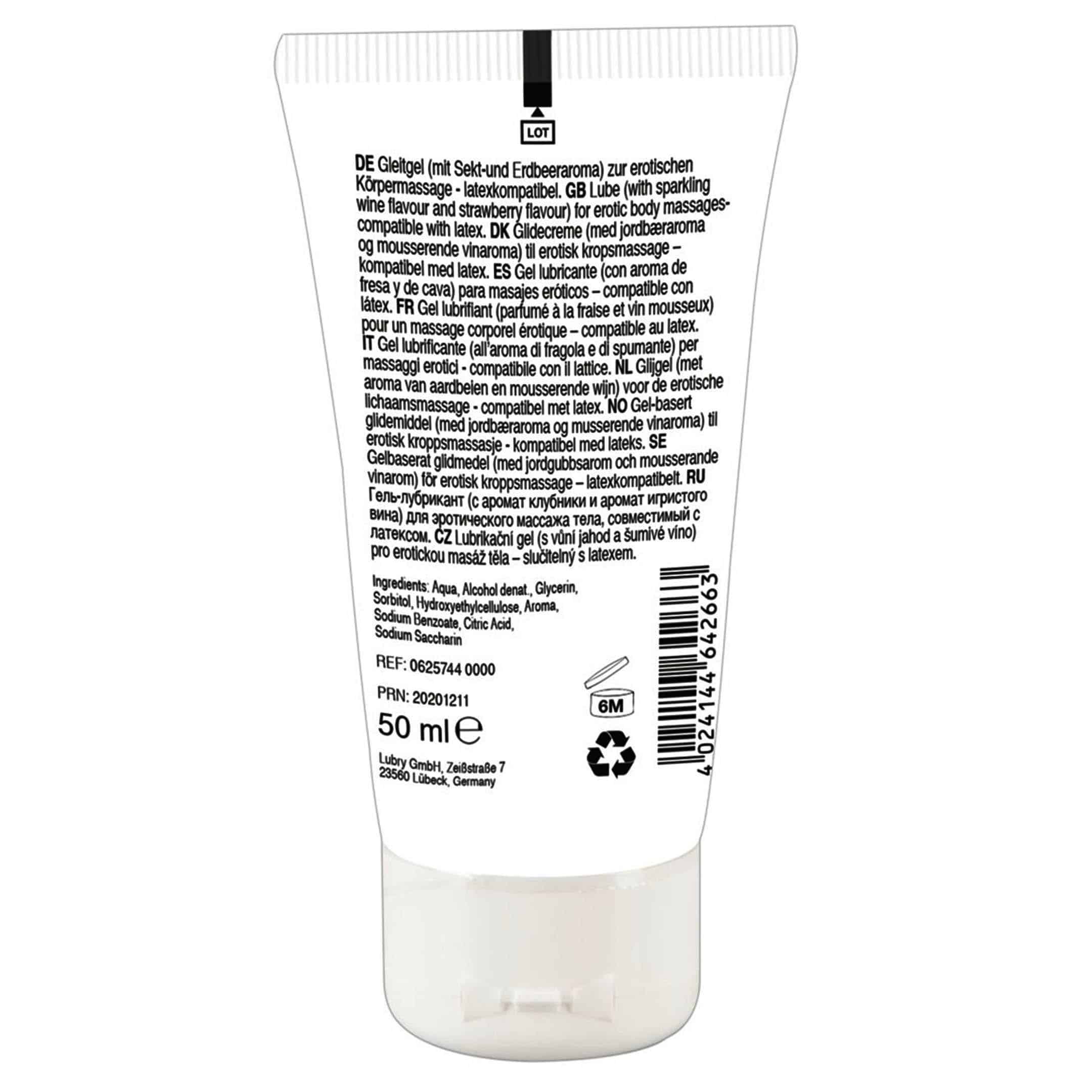 Gel de massage érotique comestible à l'arôme de fraise et de vin pétillant. Formule végétalienne à base d'eau. Tube de 50 ml.