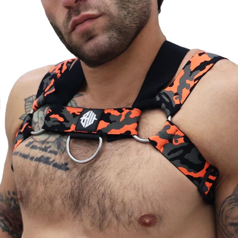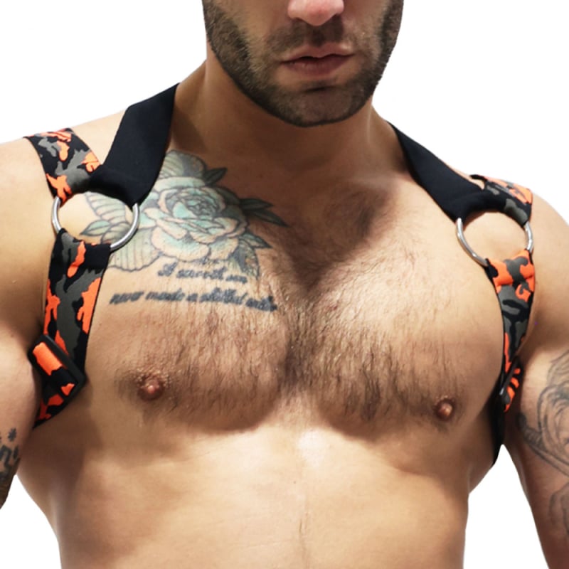 Harnais sexy et original qui peut se porter de 3 façons pour 3 looks totalement différents (harnais simple, bulldog ou bretelles). Bandes élastiques ajustables imprimées d'un motif graphique d'inspiration camouflage, qui brille à la lumière noire. 5 anneaux métalliques. Sangles amovibles sur la poitrine et dans le dos. Peut être attaché par 3 mousquetons au jock strap, au boxer jock chock ou au string Neo Camo (vendus séparément).