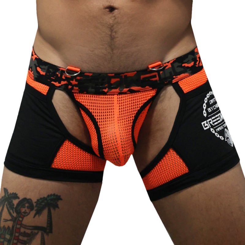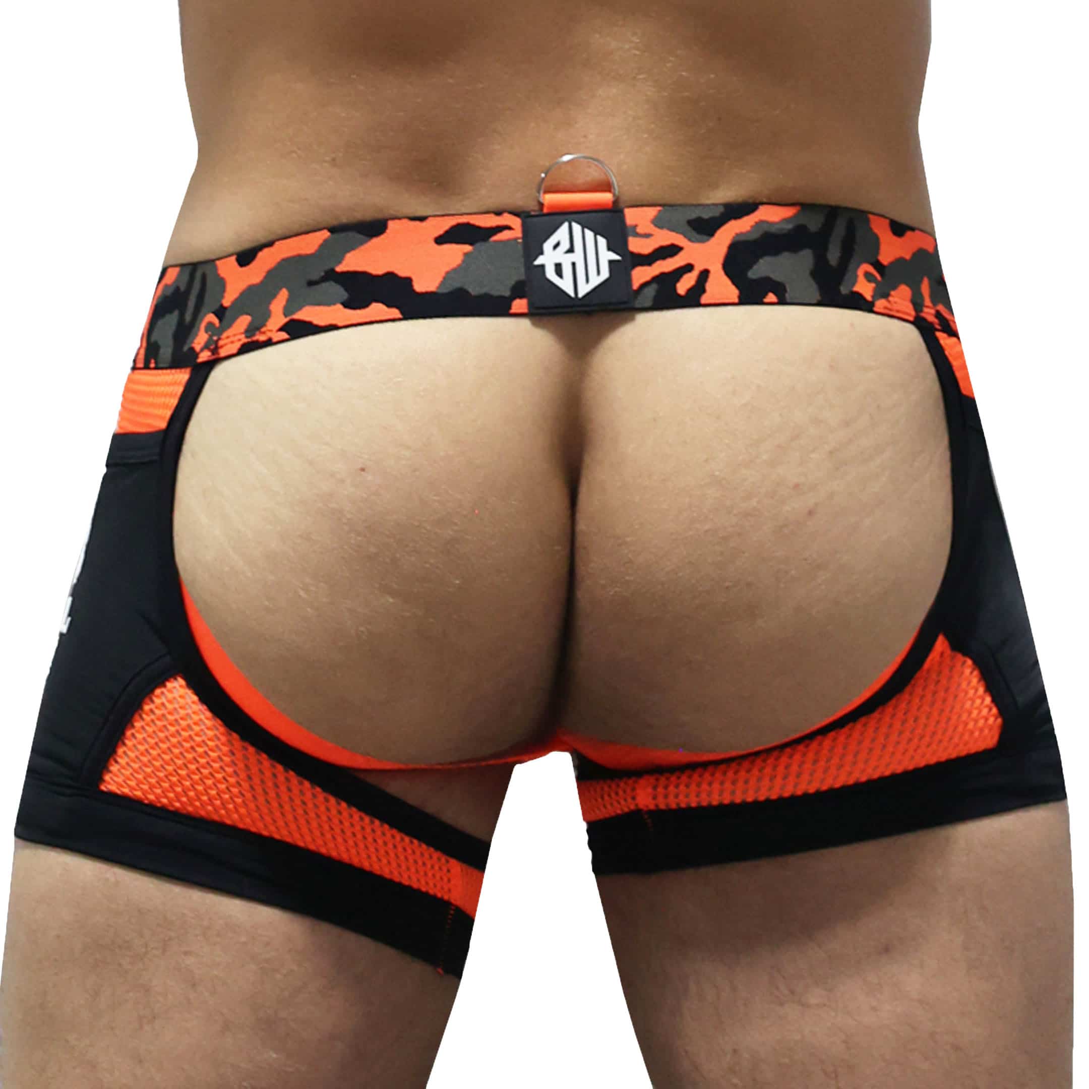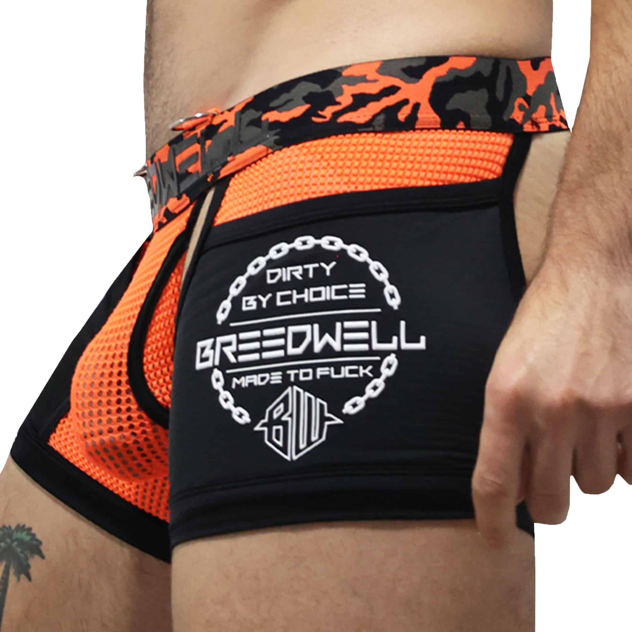 Sous-vêtement au design original et provocant combinant un jockstrap et un boxer. Conçu en mesh léger et respirant. Bandes contrastées soulignant le volume de la poche frontale non doublée. Poches latérales opaques, avec logo sur celle de gauche. Ceinture élastique camouflage signée Breedwell. 3 anneaux métalliques permettent d'attacher le harnais Neo Camo (vendu séparément).