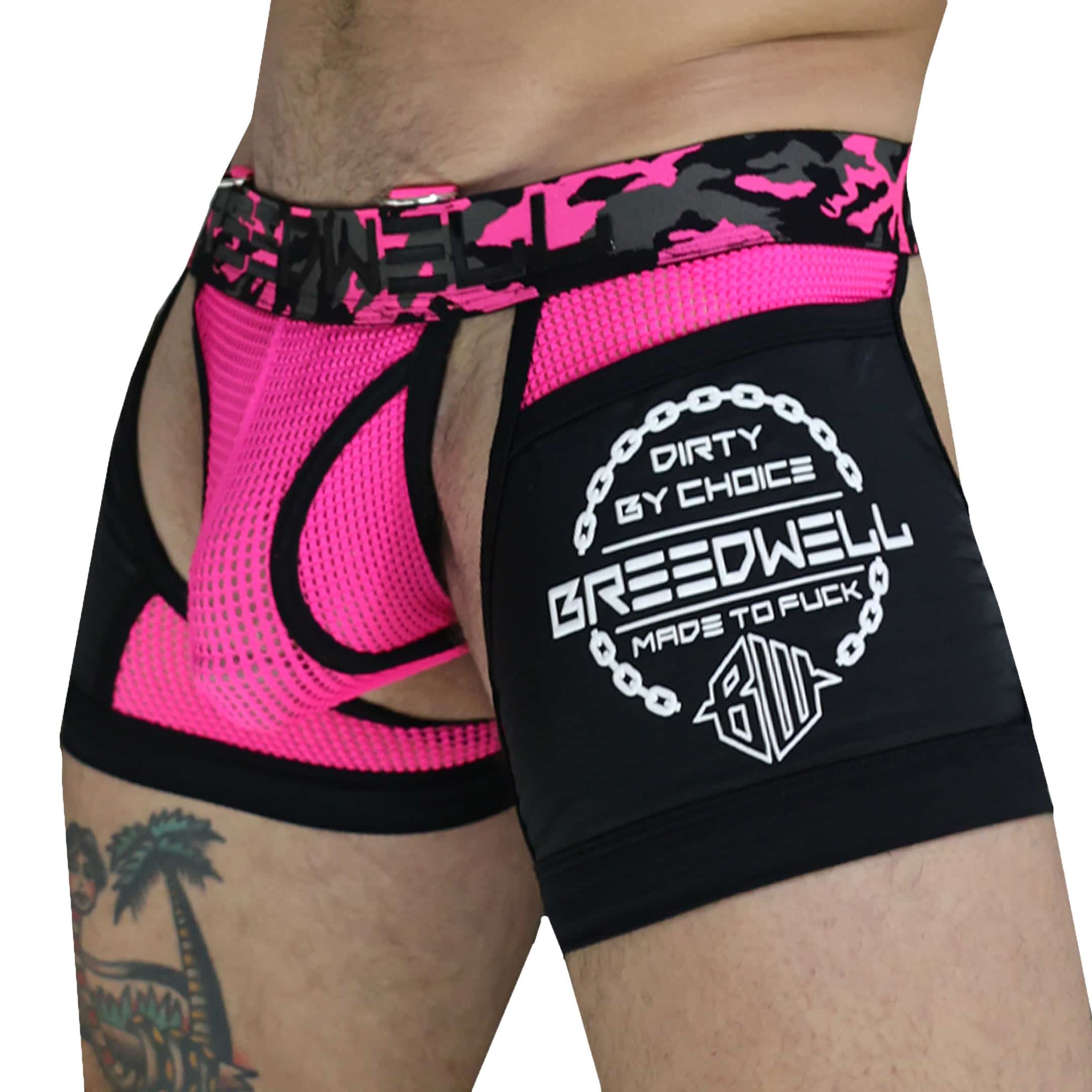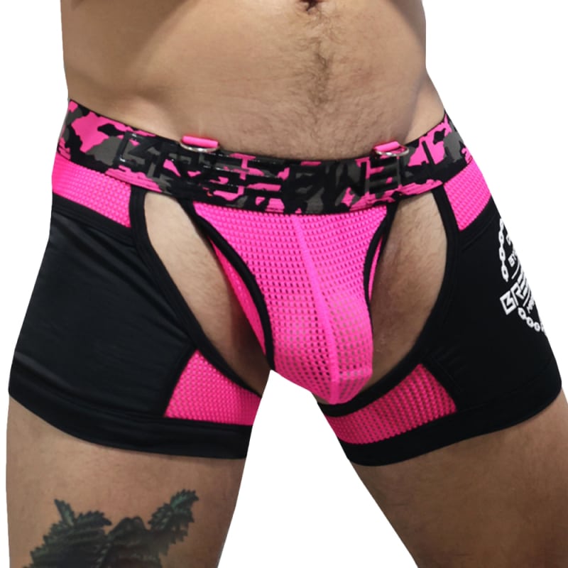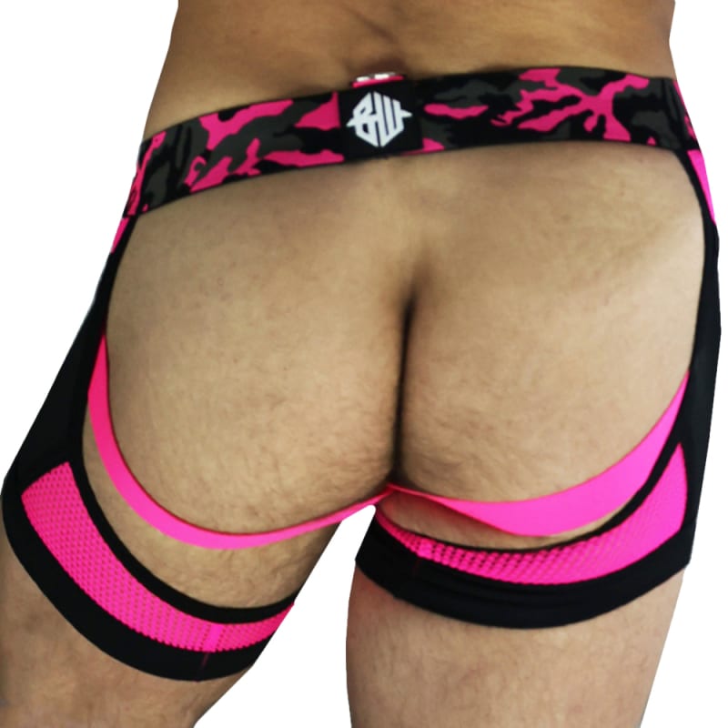 Sous-vêtement au design original et provocant combinant un jockstrap et un boxer. Conçu en mesh léger et respirant. Bandes contrastées soulignant le volume de la poche frontale non doublée. Poches latérales opaques, avec logo sur celle de gauche. Ceinture élastique camouflage signée Breedwell. 3 anneaux métalliques permettent d'attacher le harnais Neo Camo (vendu séparément).