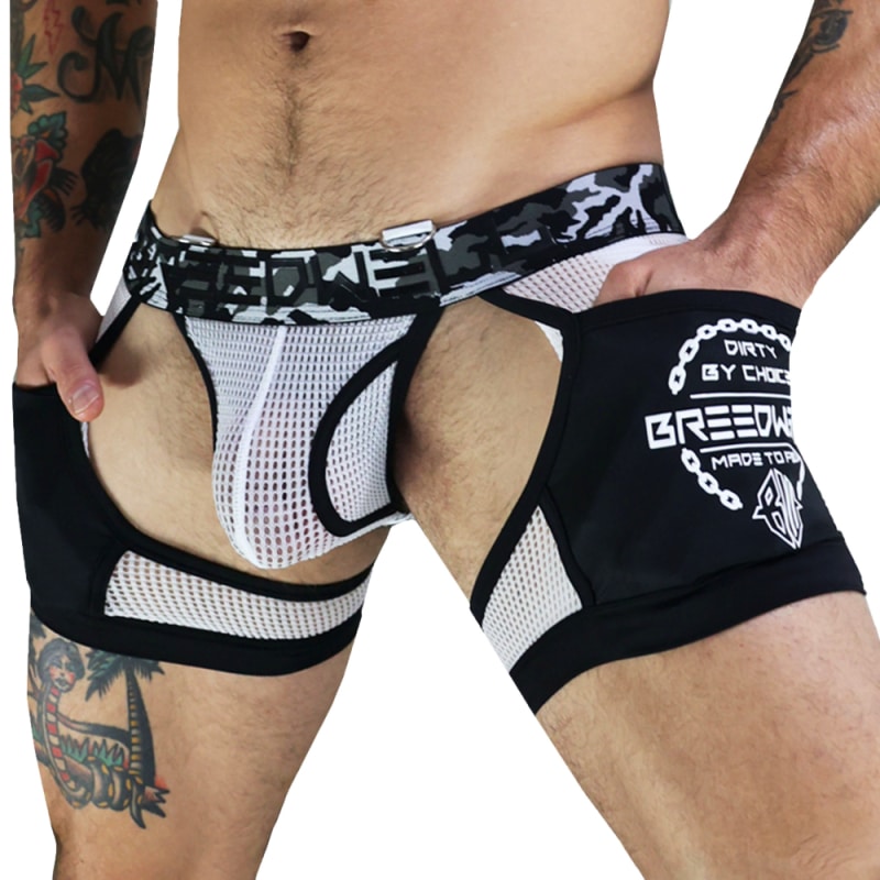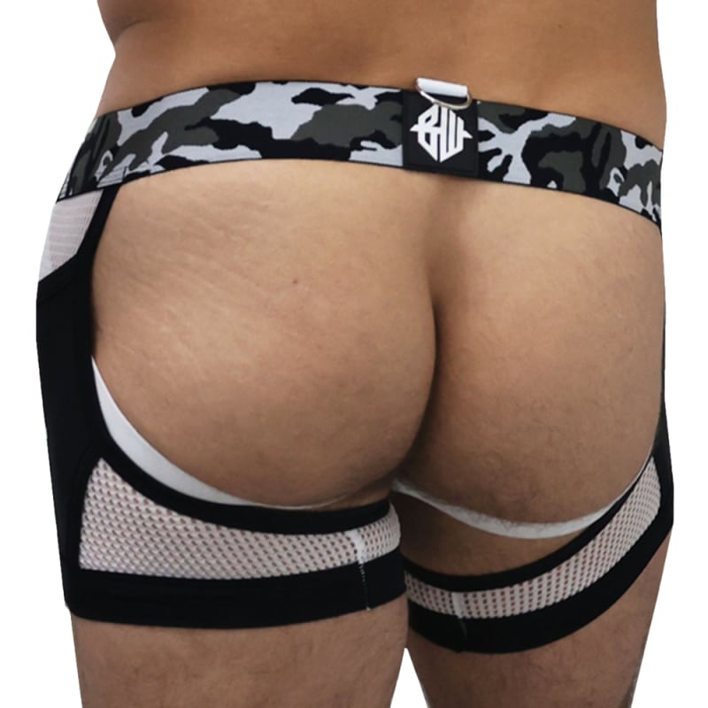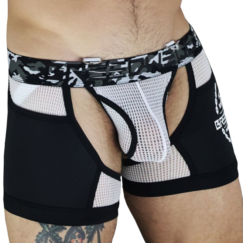 Sous-vêtement au design original et provocant combinant un jockstrap et un boxer. Conçu en mesh léger et respirant. Bandes contrastées soulignant le volume de la poche frontale non doublée. Poches latérales opaques, avec logo sur celle de gauche. Ceinture élastique camouflage signée Breedwell. 3 anneaux métalliques permettent d'attacher le harnais Neo Camo (vendu séparément).
