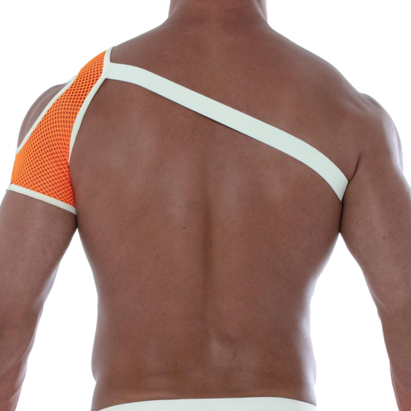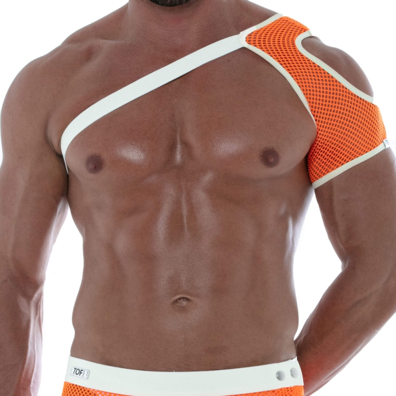 Harnais d'épaule très sexy en résille ajourée, légère et respirante de couleur fluo. Peut se porter à gauche comme à droite. Bande élastique et bordures contrastées. Logo TOF cousu sur l'épaule. Fabrication française.