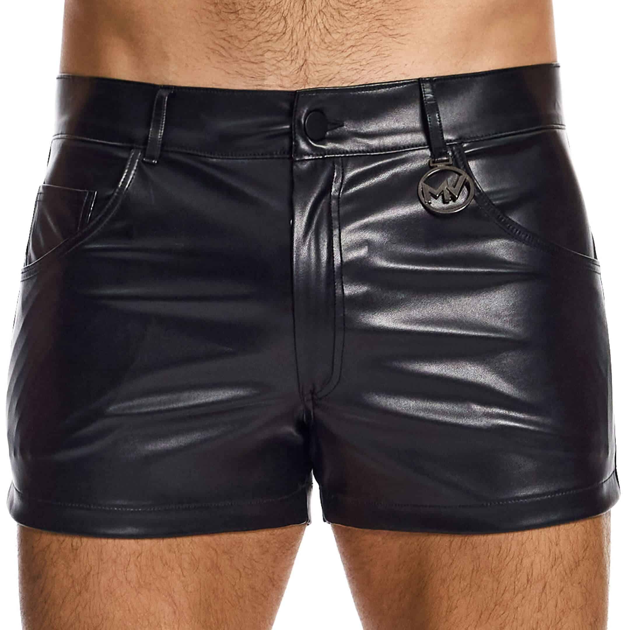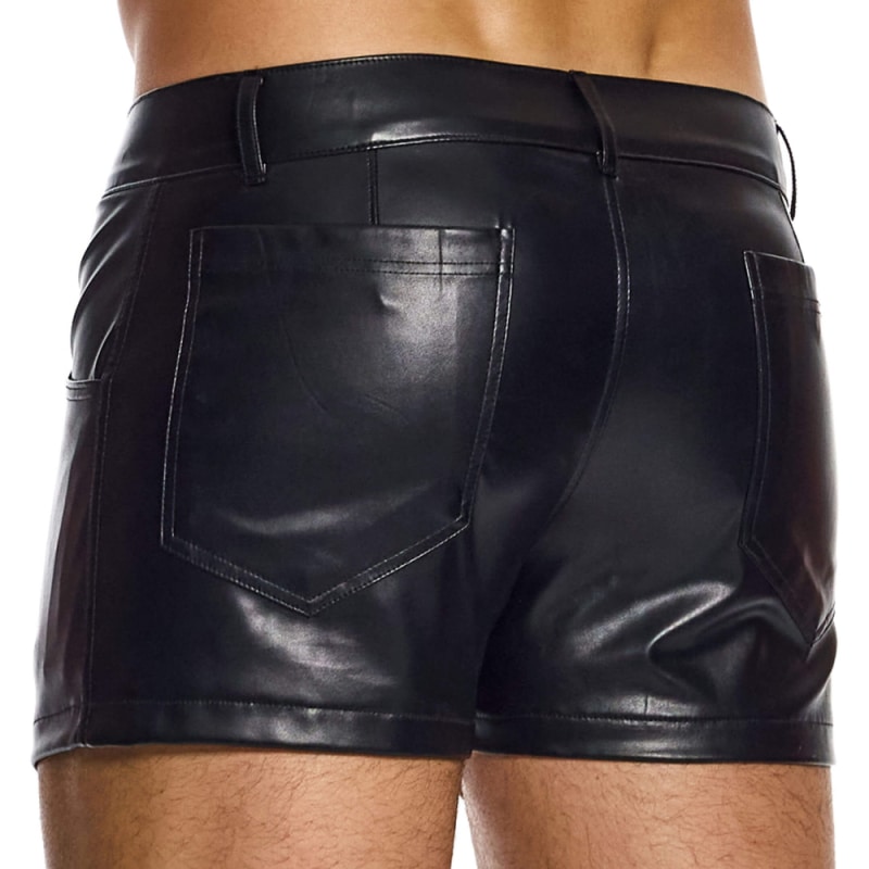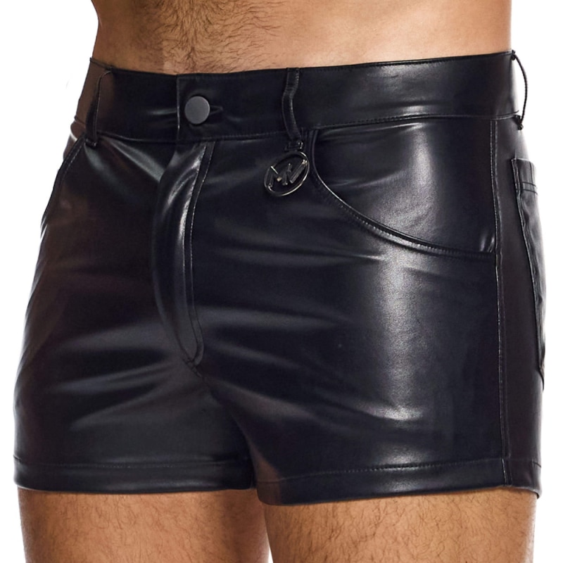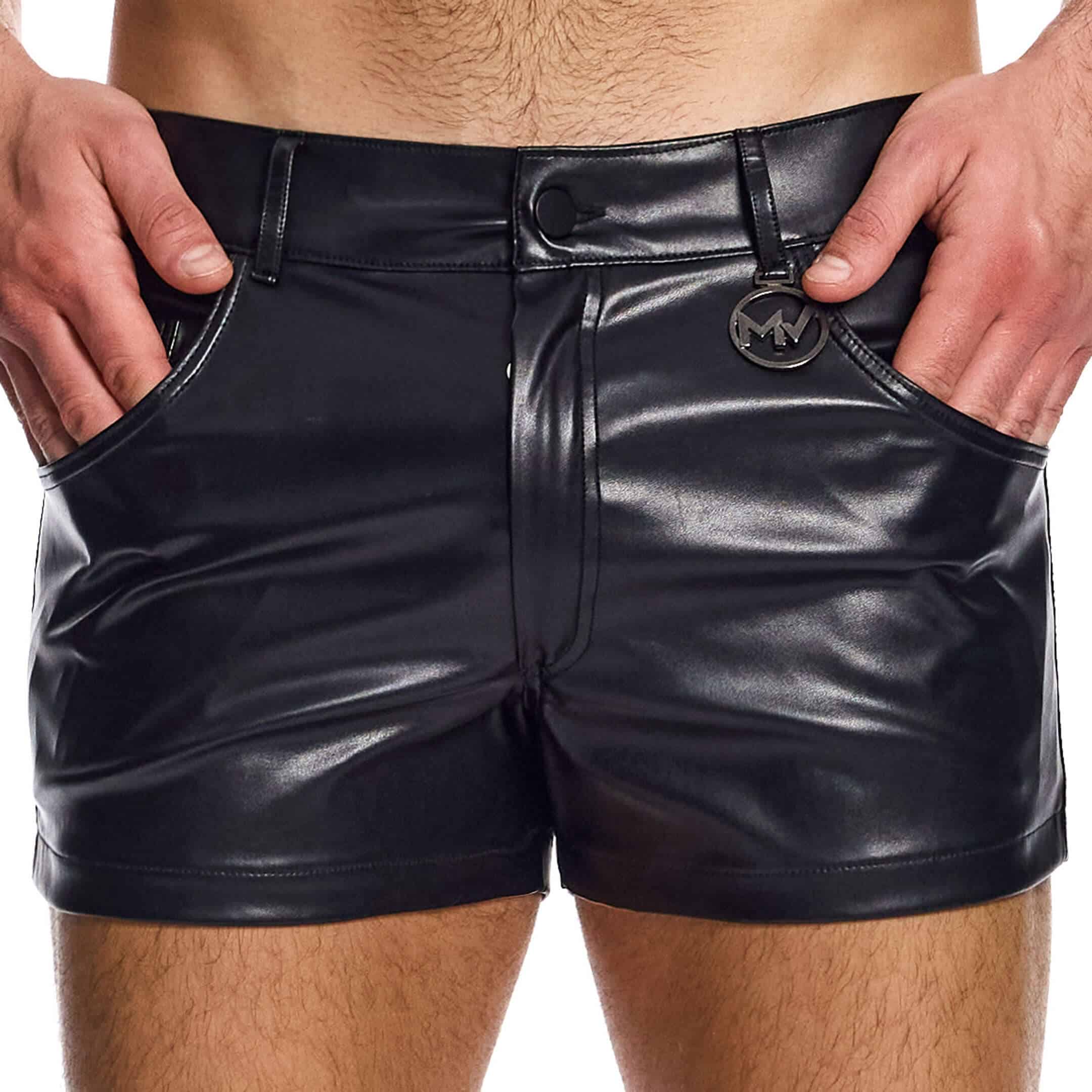 Short en microfibre imitant le cuir. Coupe slim taille basse. 5 poches. Braguette à bouton et fermeture Eclair. 5 passants de ceinture. Plaque métalique Modus Vivendi sur la hanche gauche.