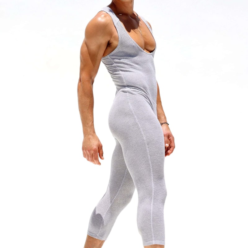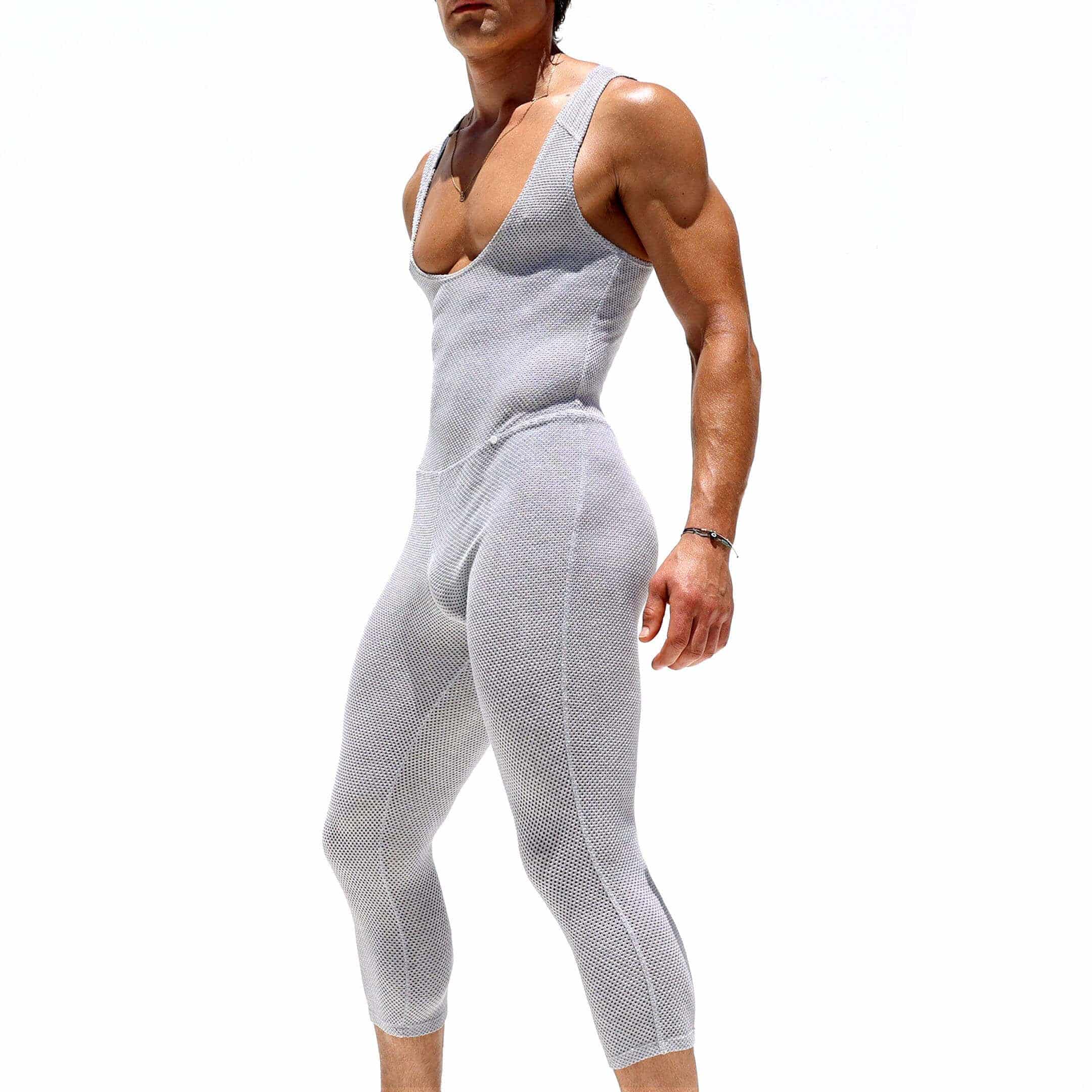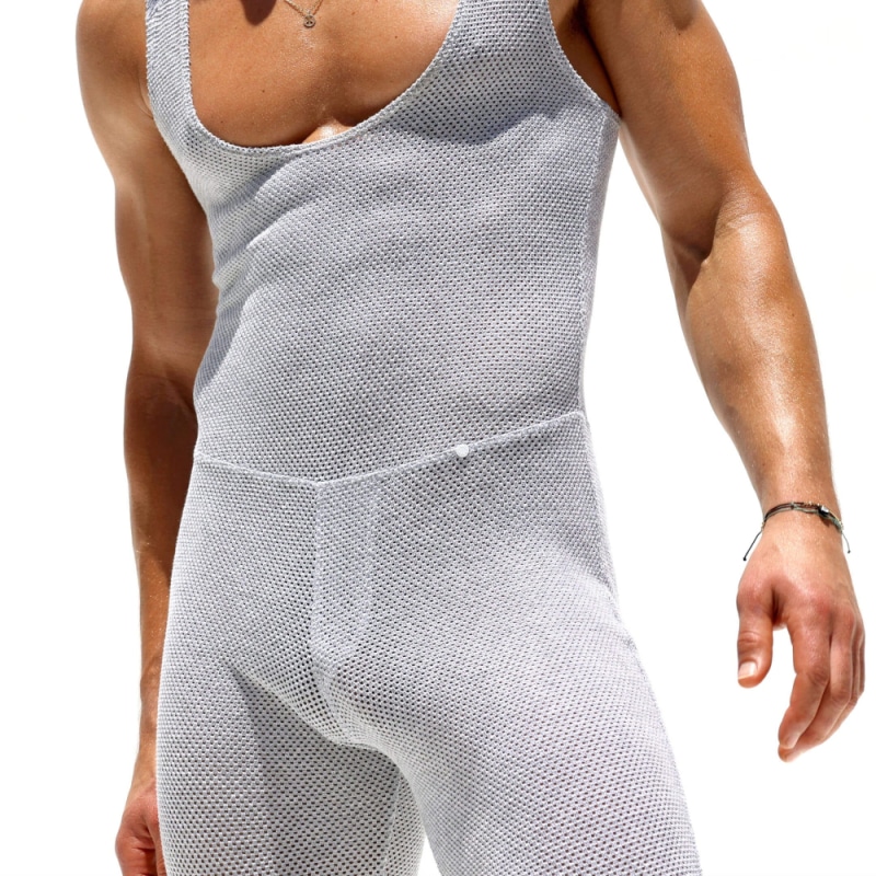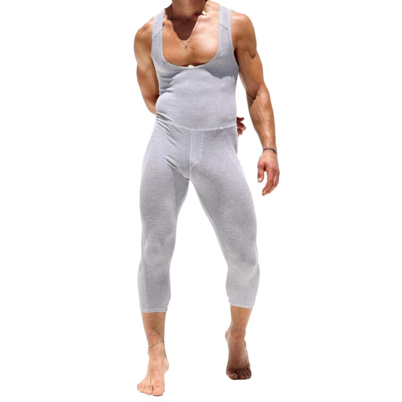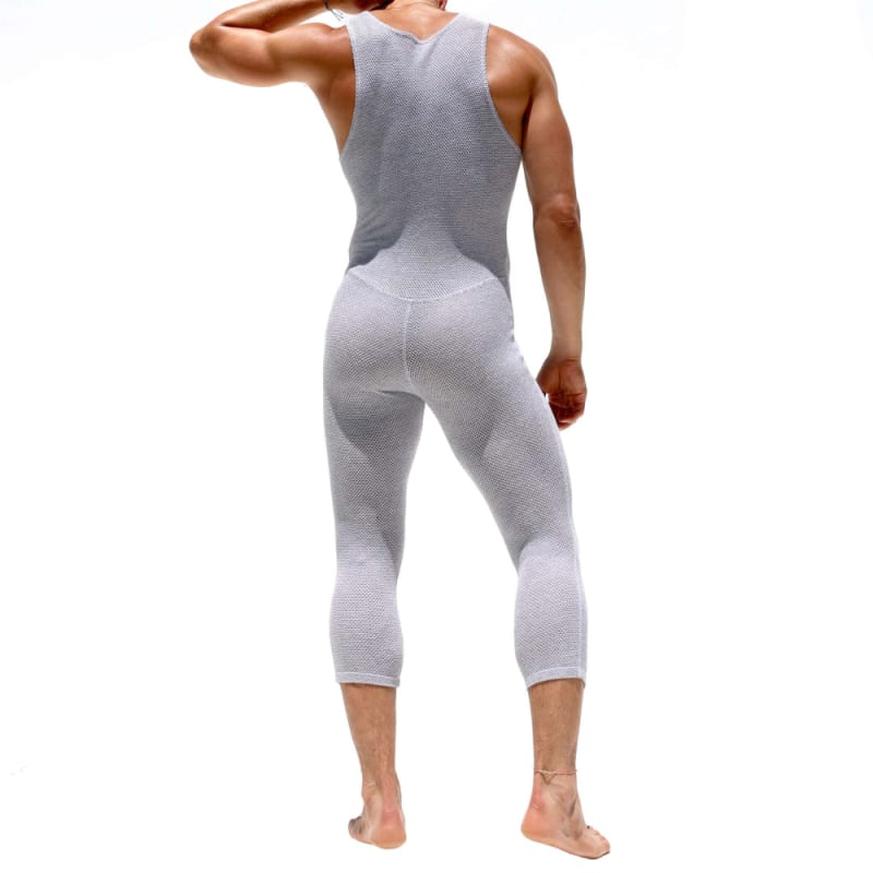 Body intégral en coton extensible perforé, léger et respirant, dévoilant le corps en transparence. Coupe très ajustée, longueur mi-mollet. Col carré profond pour mettre en avant vos pectoraux. Braguette factice. Rivet mat blanc signé Rufskin à la taille. Fabriqué en Californie.