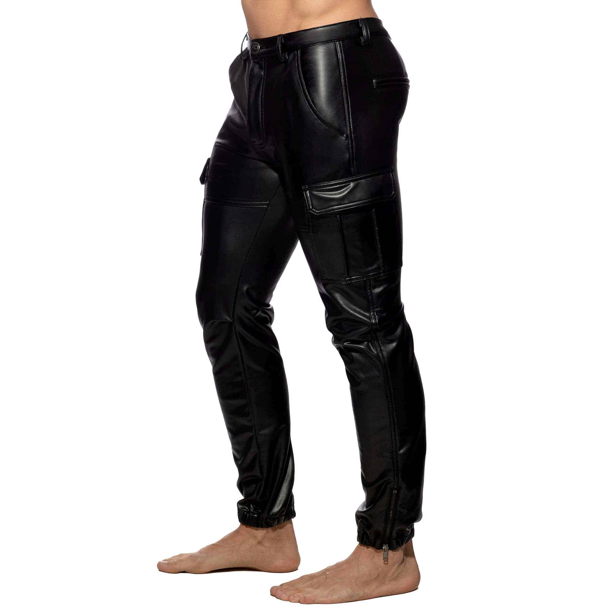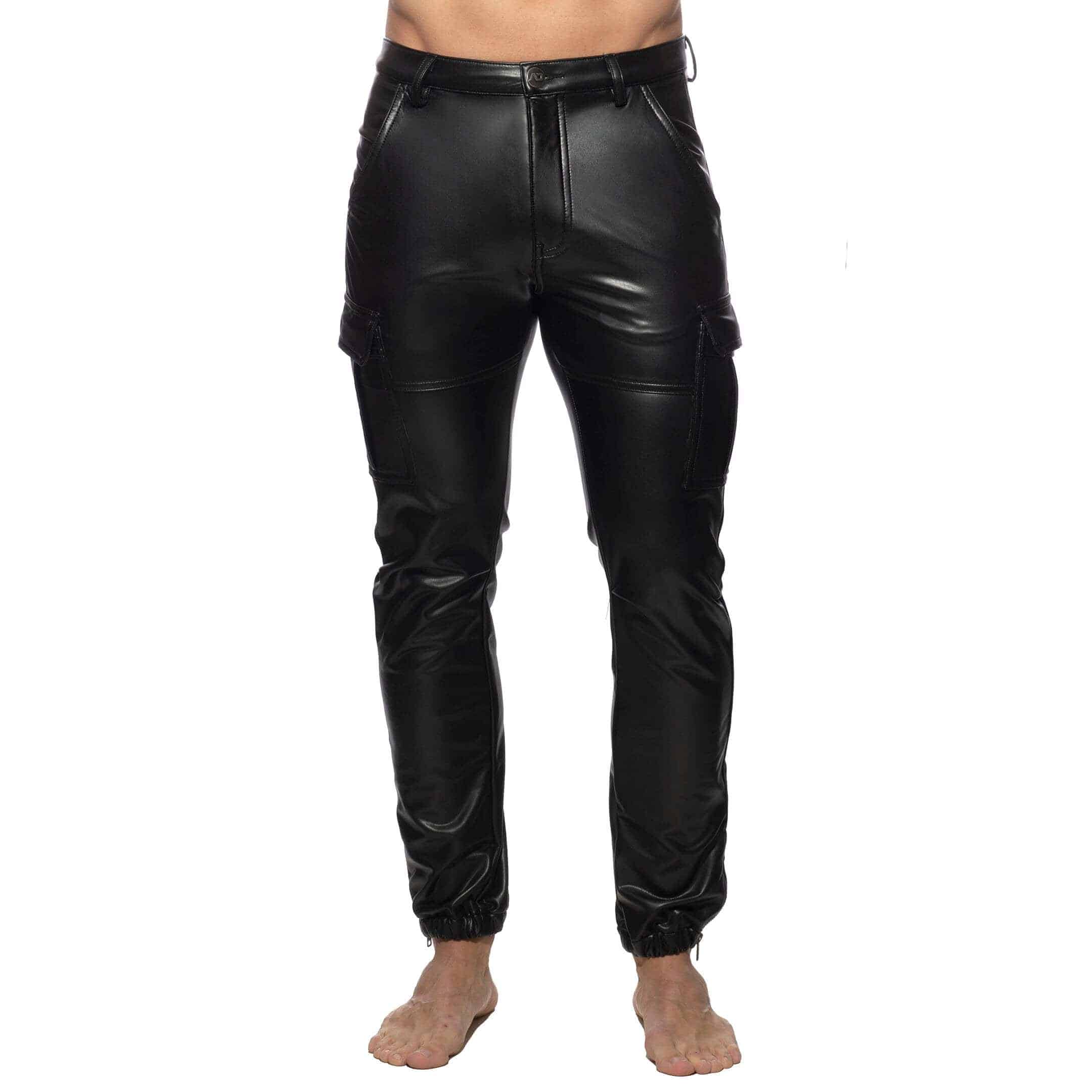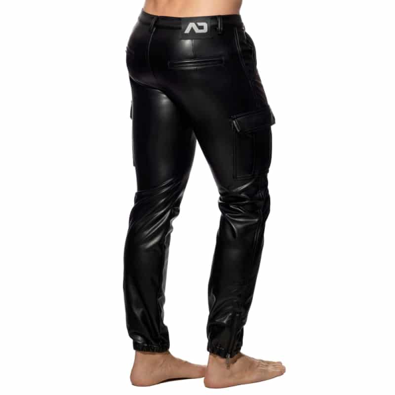 Pantalon taille basse en simili-cuir extensible, parfait pour un look fetish. Coupe très ajustée, avec deux poches cargo à rabats sur les cuisses, et 2 poches classiques. Poches factices à l'arrière. Braguette à fermeture Eclair et 1 bouton. Passants de ceinture. Etiquette AD Fetish en silicone. Bande élastiquée et fermeture Eclair sur la cheville.