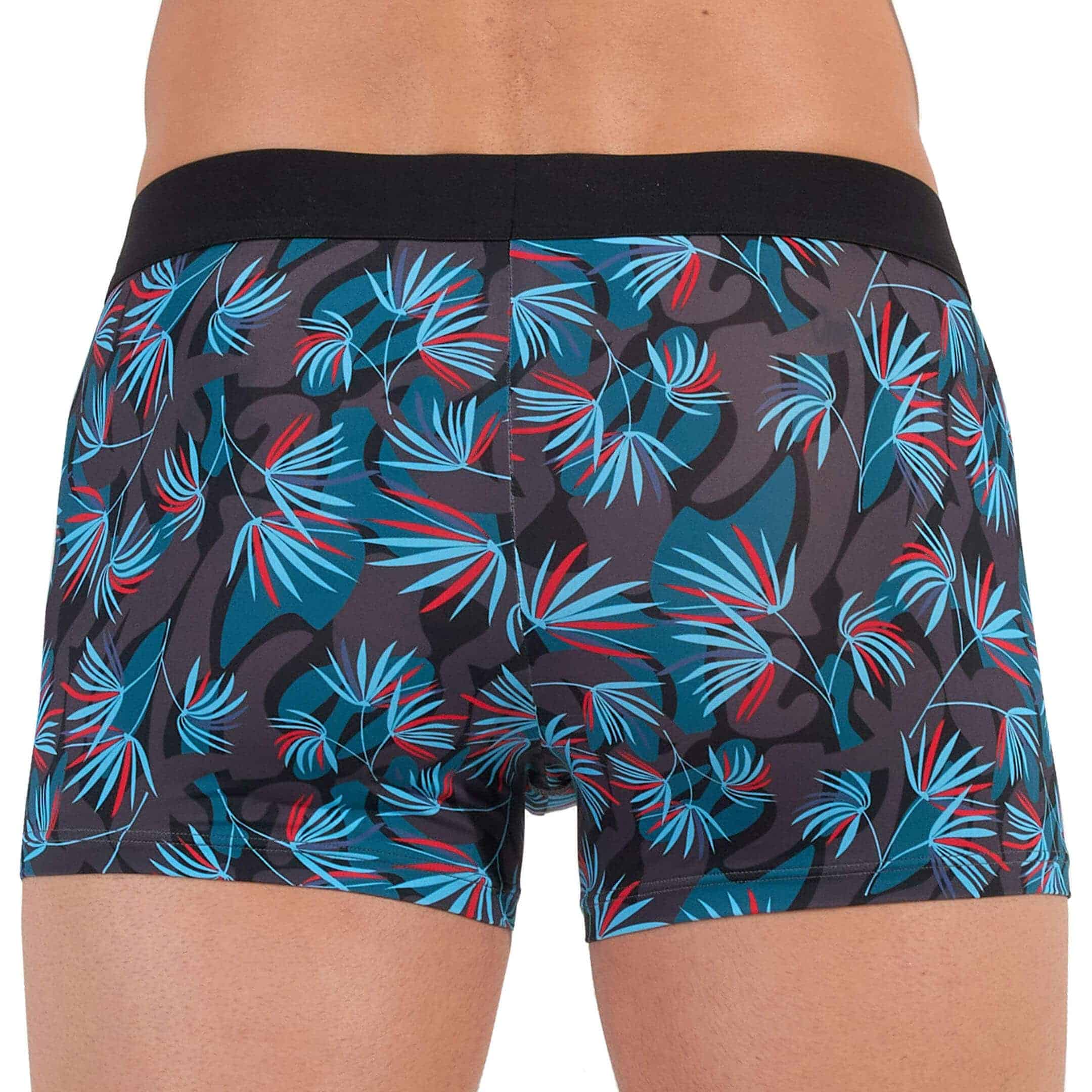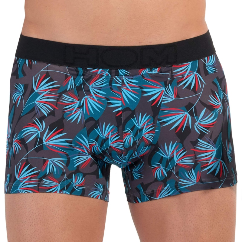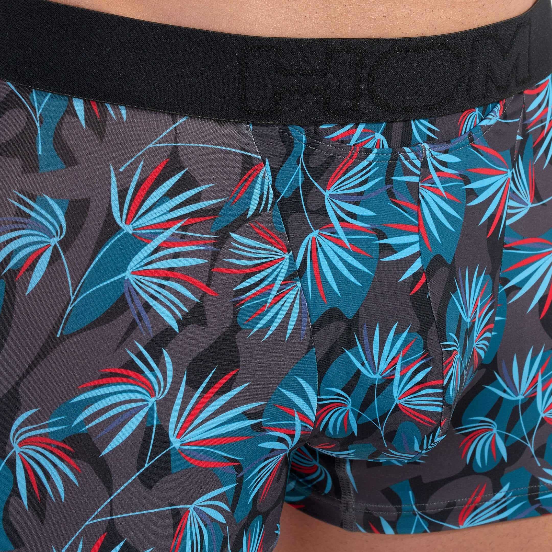 Boxer en microfibre extensible ultra douce et confortable. Tissu de qualité supérieure certifié Oeko-Tex. Imprimé exotique dans les tons bleus, gris et rouges. Ouverture horizontale HO1 brevetée - aussi pratique pour les droitiers que pour les gauchers. Poche frontale doublée. Ceinture élastique contrastée signée HOM.