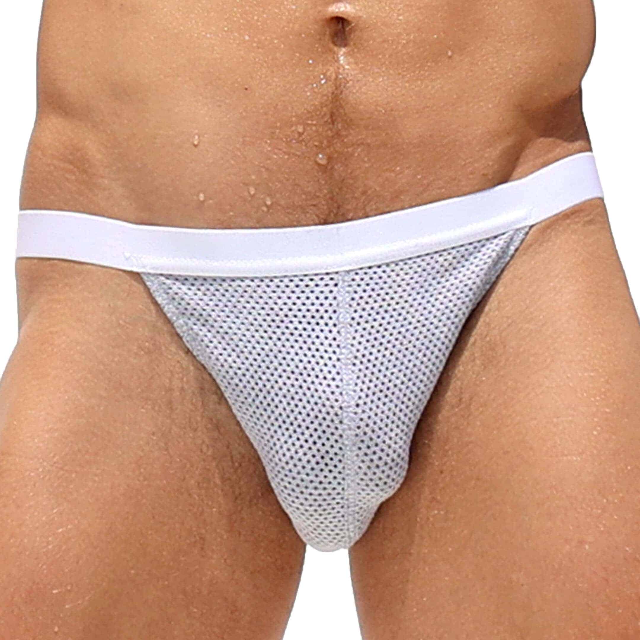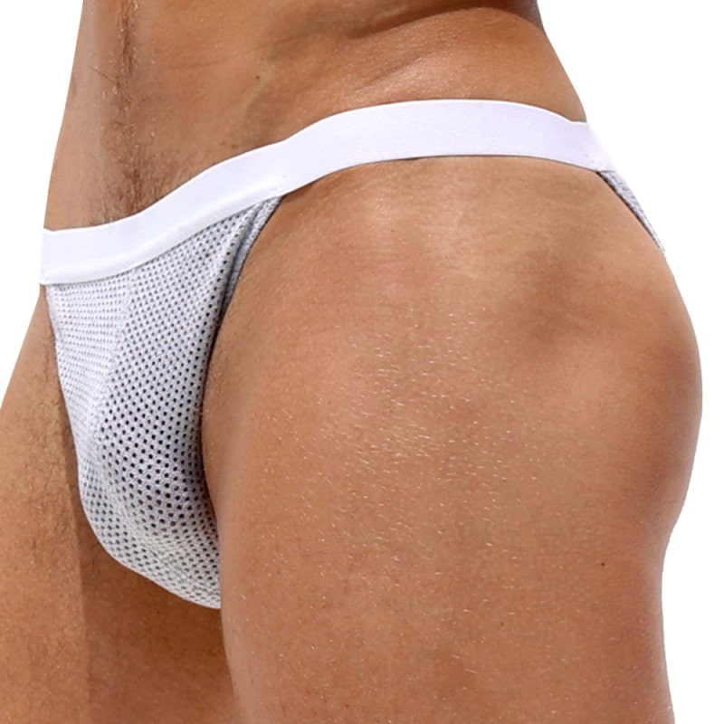 Slip taille basse en coton extensible perforé, léger et respirant, dévoilant le corps en transparence. Coupe tanga minimaliste et ajustée. Poche frontale enveloppante non doublée. Ceinture élastique avec rivet mat blanc signé Rufskin à l'arrière. Fabriqué en Californie.