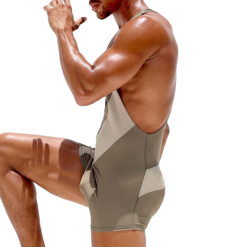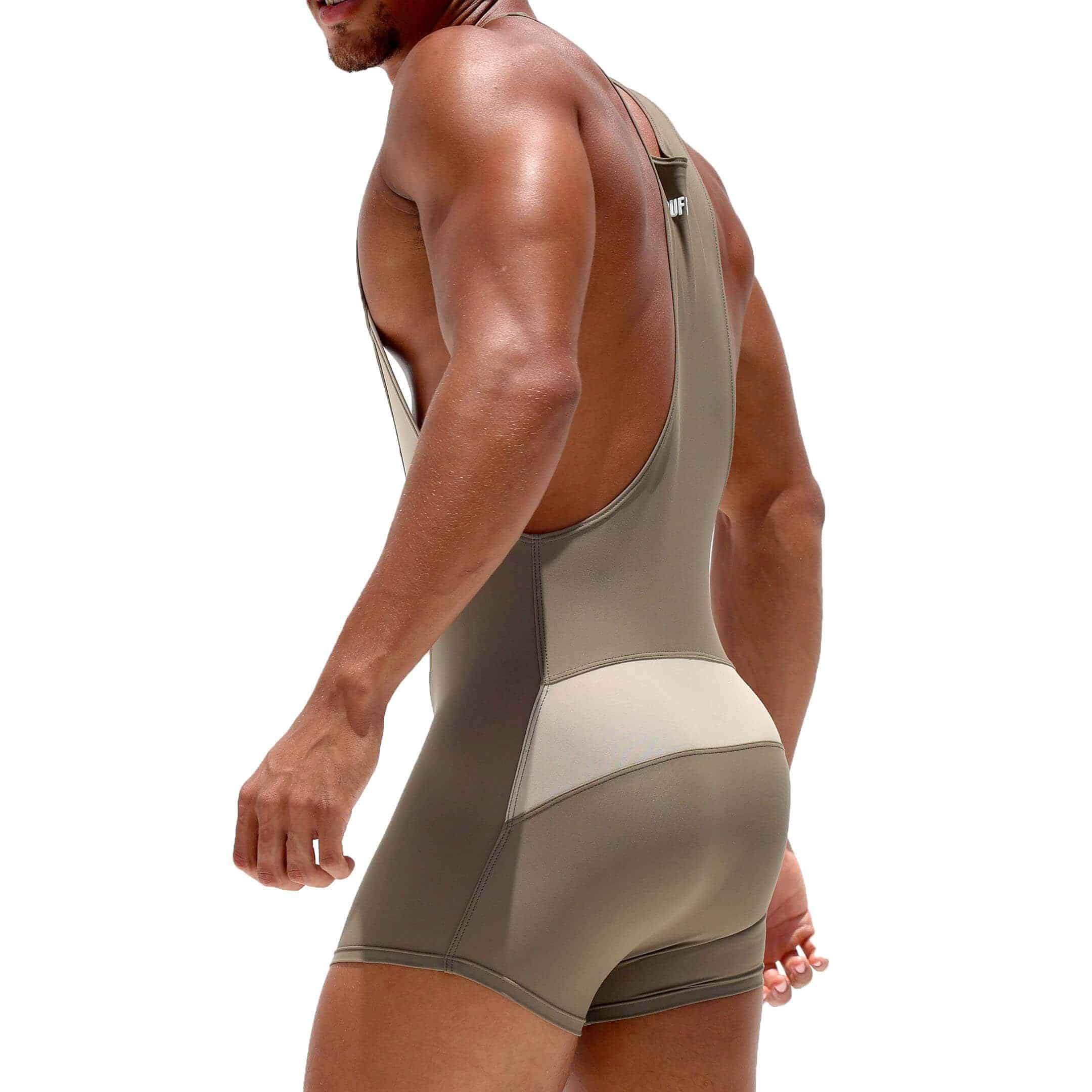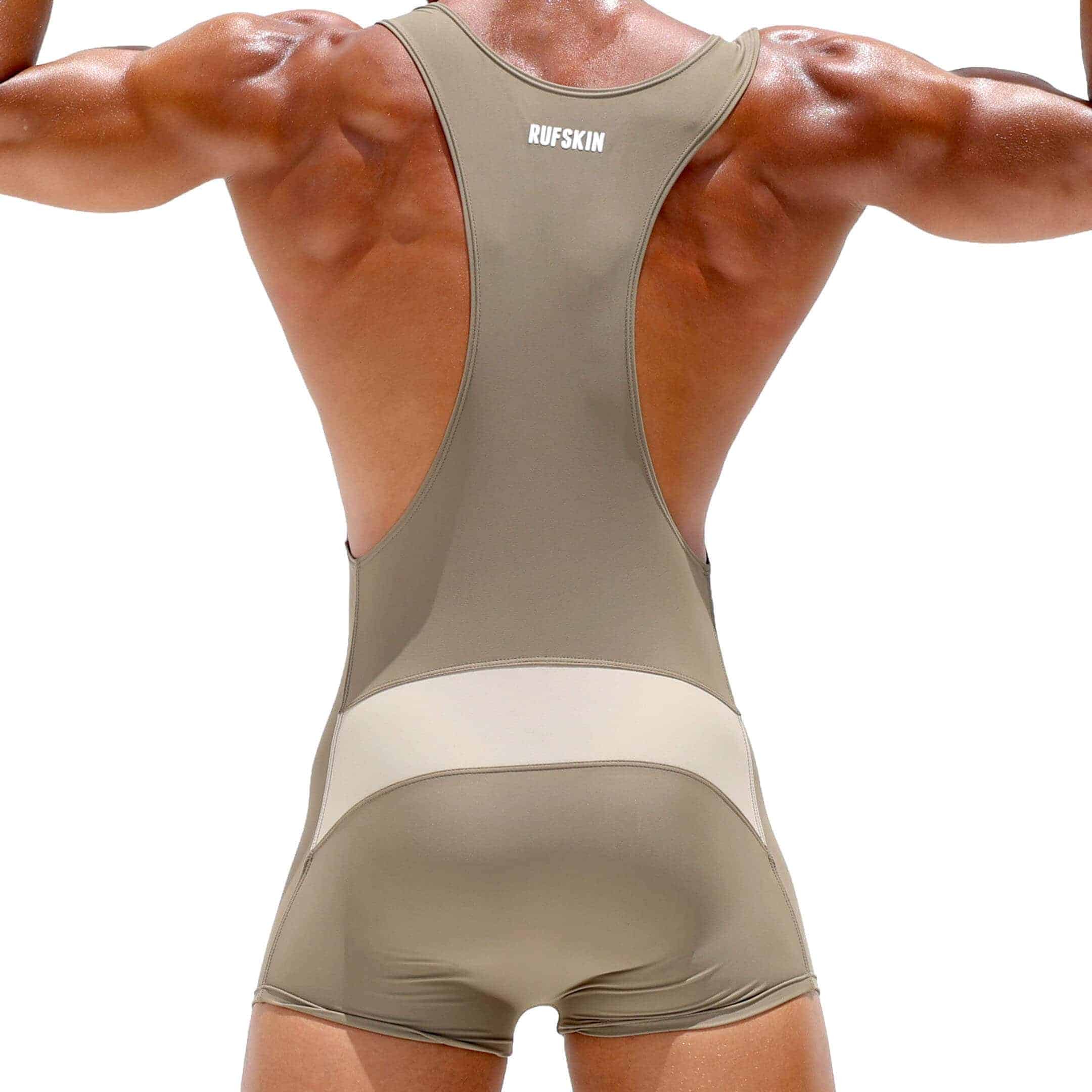 Body sport très ajusté en microfibre extensible de qualité supérieure. Tissu à mémoire de forme évacuant rapidement la transpiration. Bandes contrastées devant et en haut des fesses. Logo Rufskin dans le dos. Col en U plongeant et dos nageur. Fabriqué en Californie.