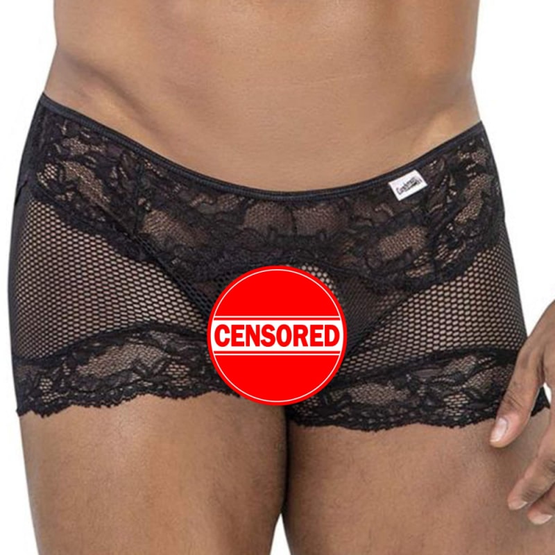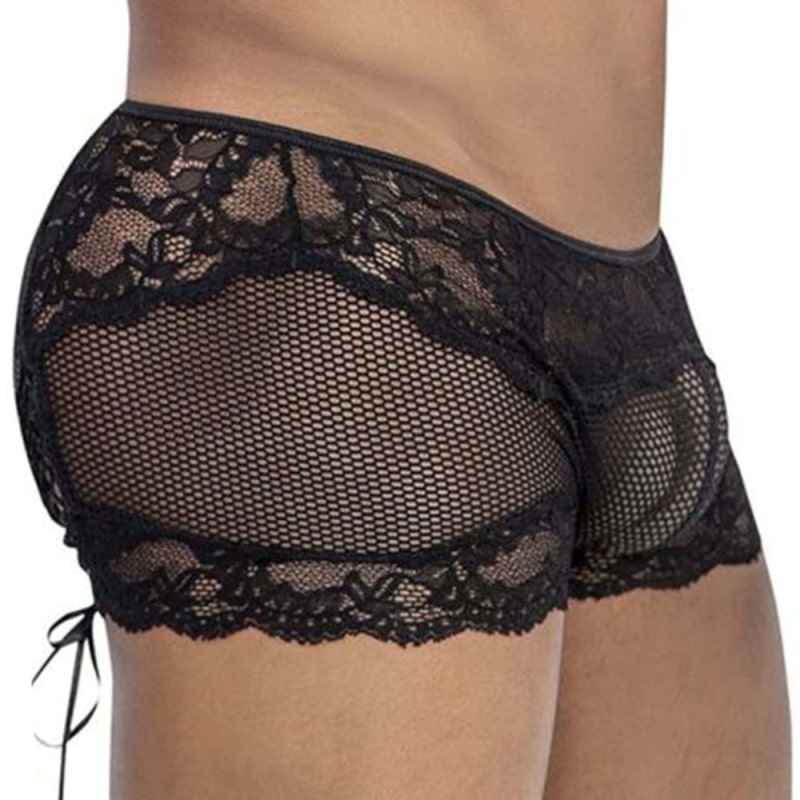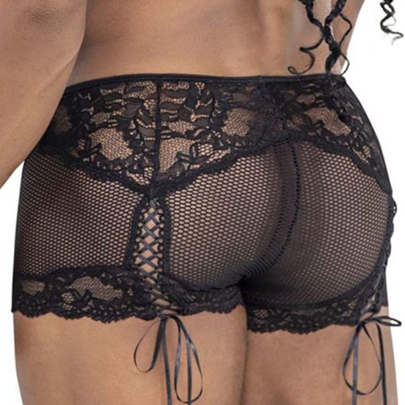 Boxer ultra sexy et provocant combinant résille transparente et dentelle florale. Laçage à l'arrière. Poche frontale non doublée.