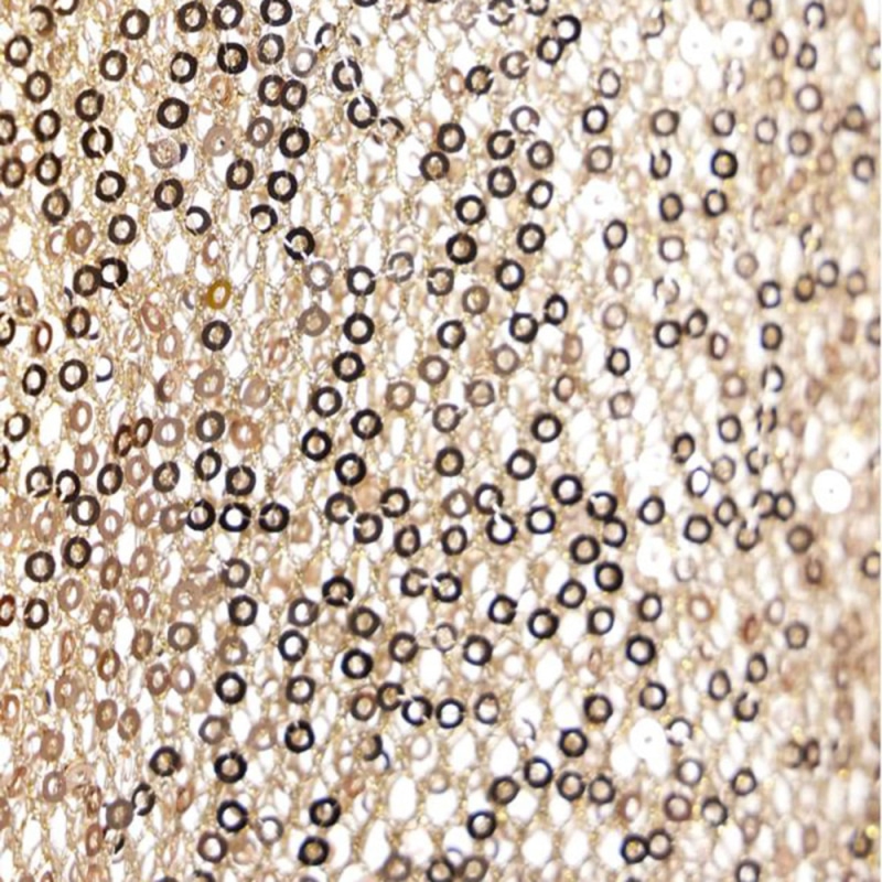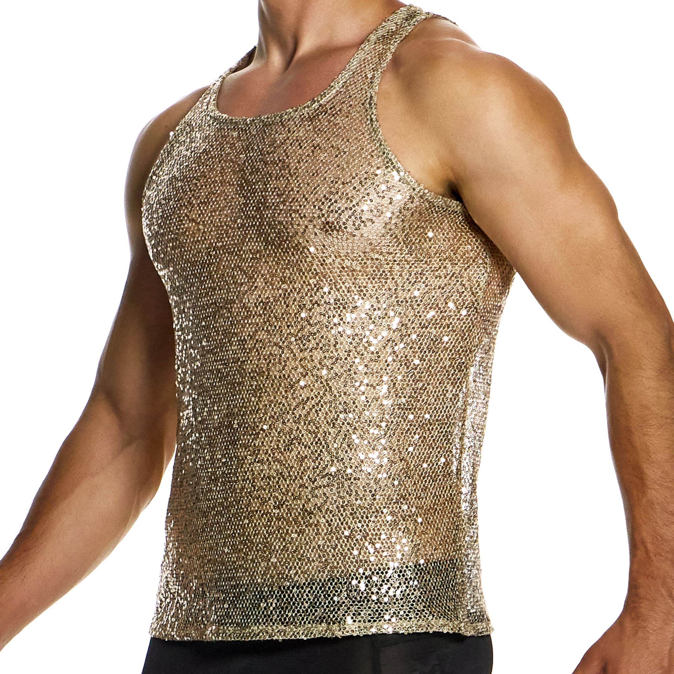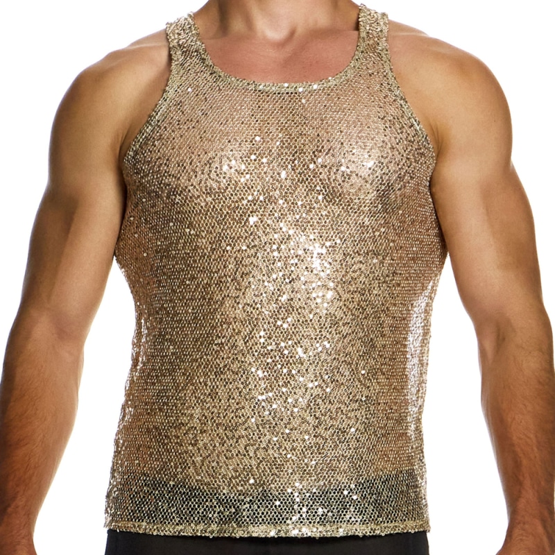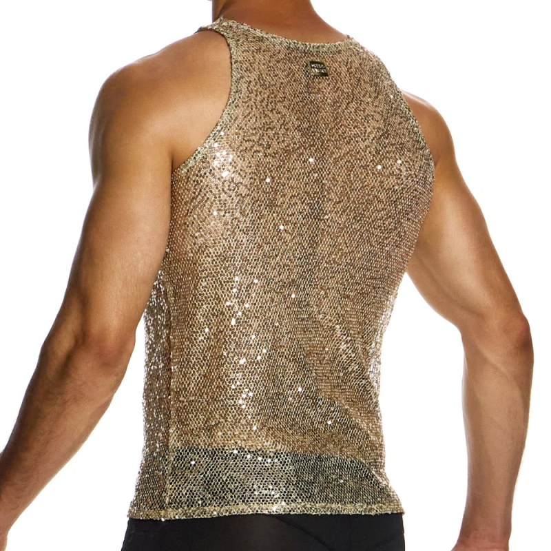 Débardeur glamour en résille extensible dorée recouverte de paillettes scintillantes. Col rond. Etiquette Modus Vivendi de couleur or en haut du dos.