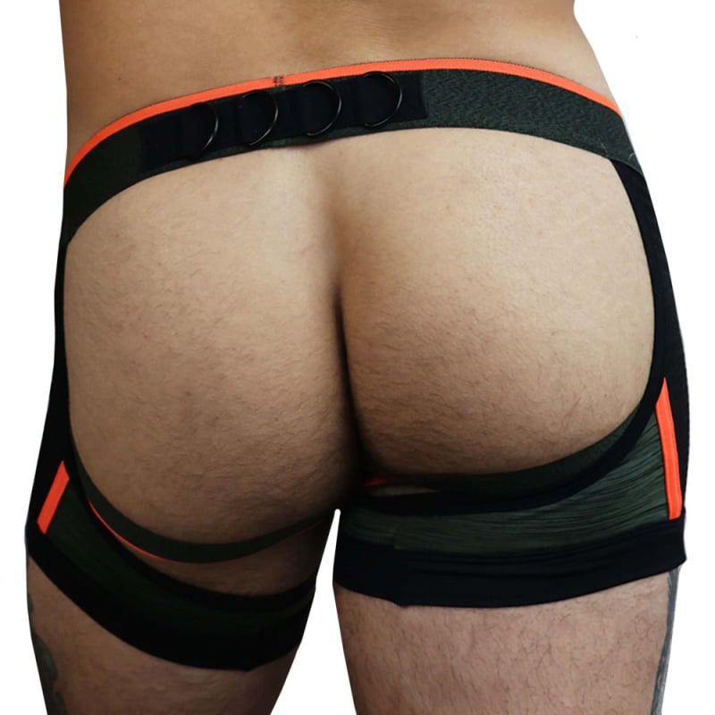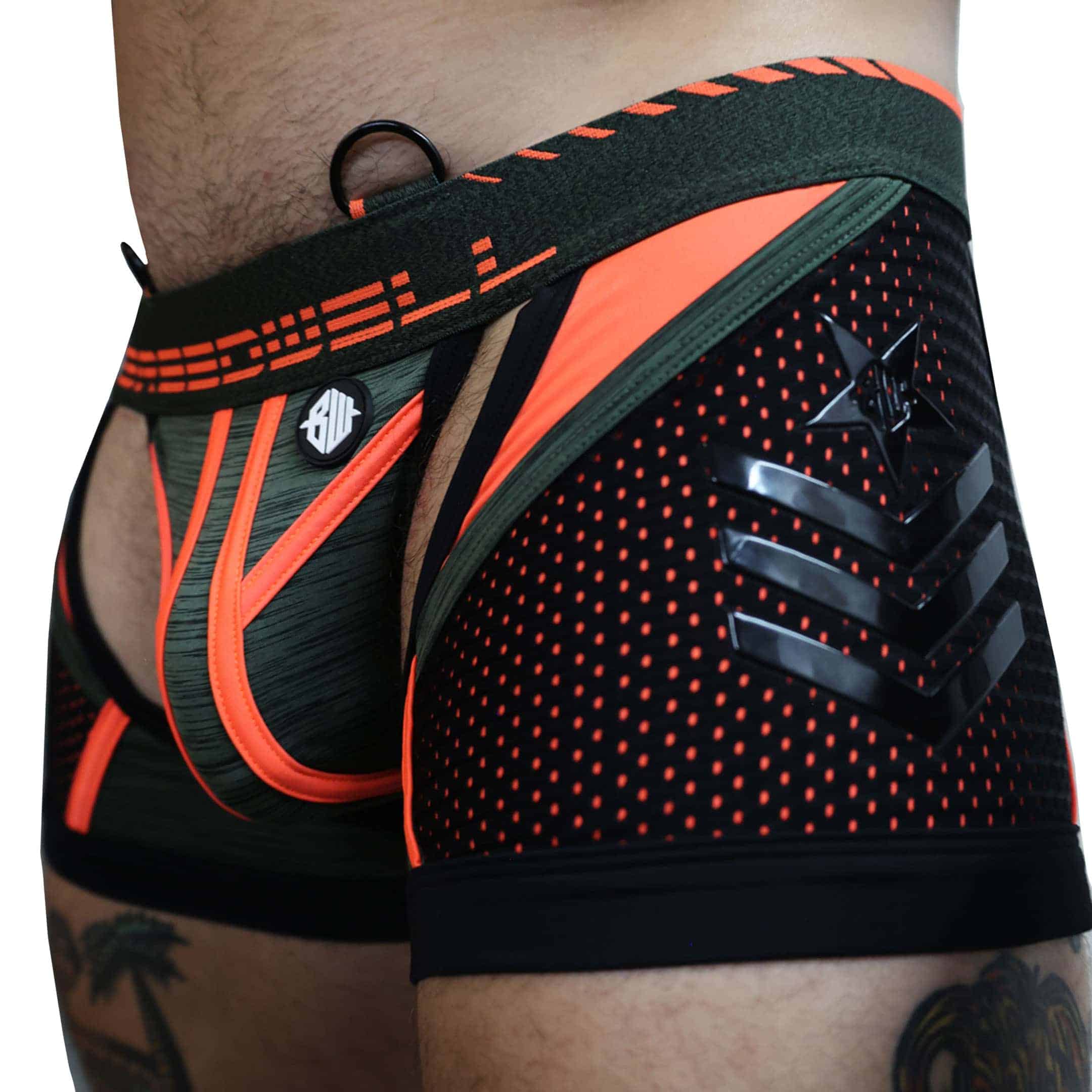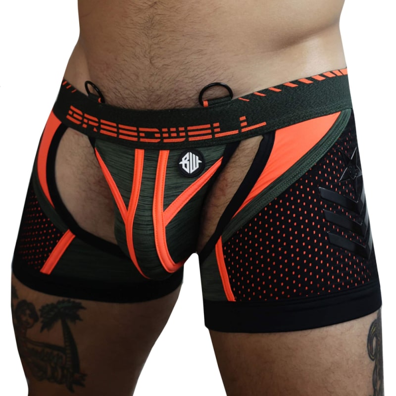 Sous-vêtement au design original et provocant combinant un jockstrap et un boxer. Conçu en microfibre chinée ultra douce, fine et légère. Poches latérales en mesh. Motif d'inspiration militaire en silicone sur la cuisse gauche. Bandes contrastées soulignant le volume de la poche frontale. Ceinture élastique dotées de 2 anneaux métalliques devant et 4 anneaux métalliques derrière. Patch Breedwell.