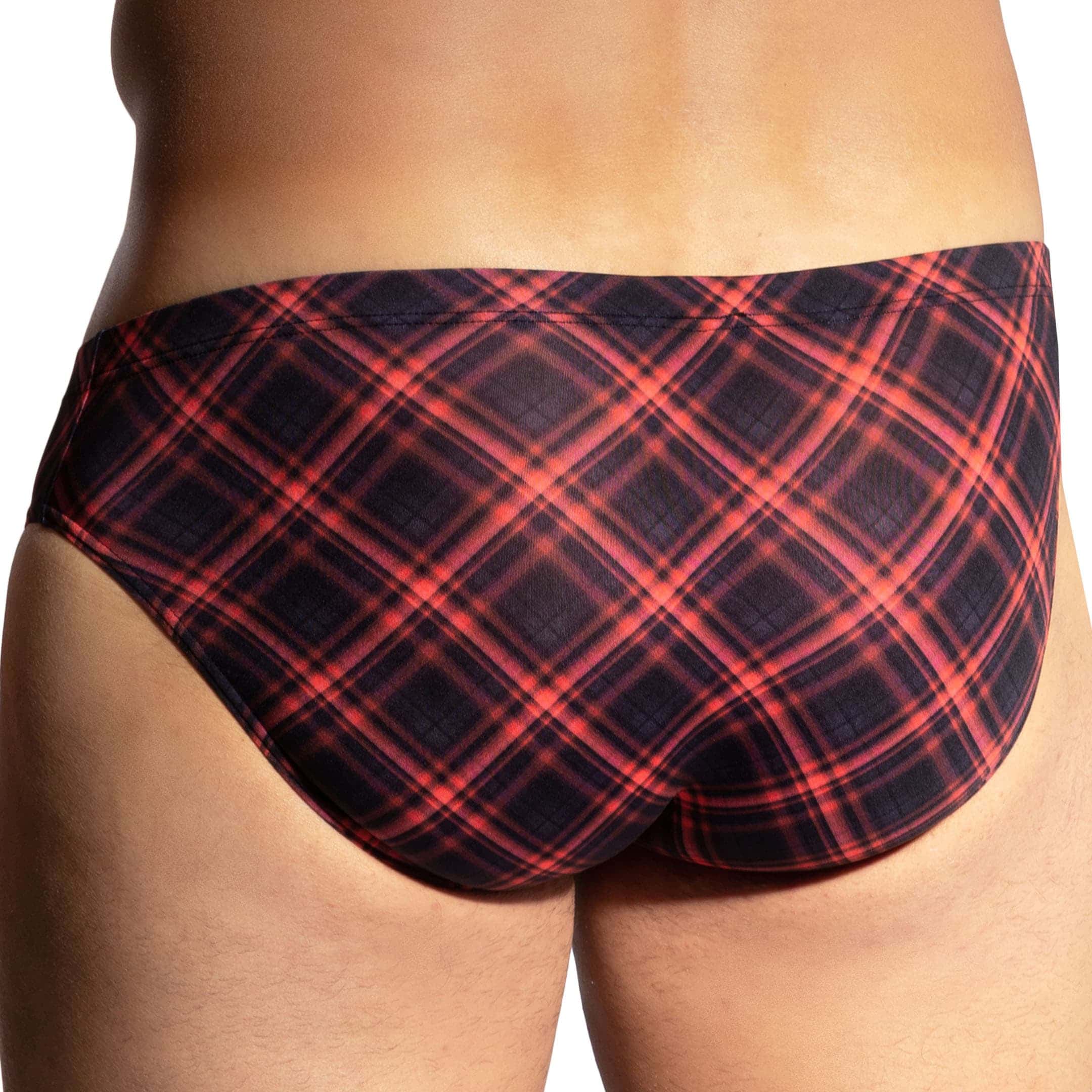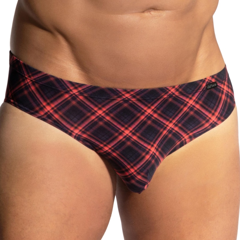 Slip en microfibre extensible, douce et confortable. Imprimé à carreaux façon tartan. Coupe simple, élégante et très confortable. Logo Olaf Benz cousu sur la fine ceinture élastique recouverte.