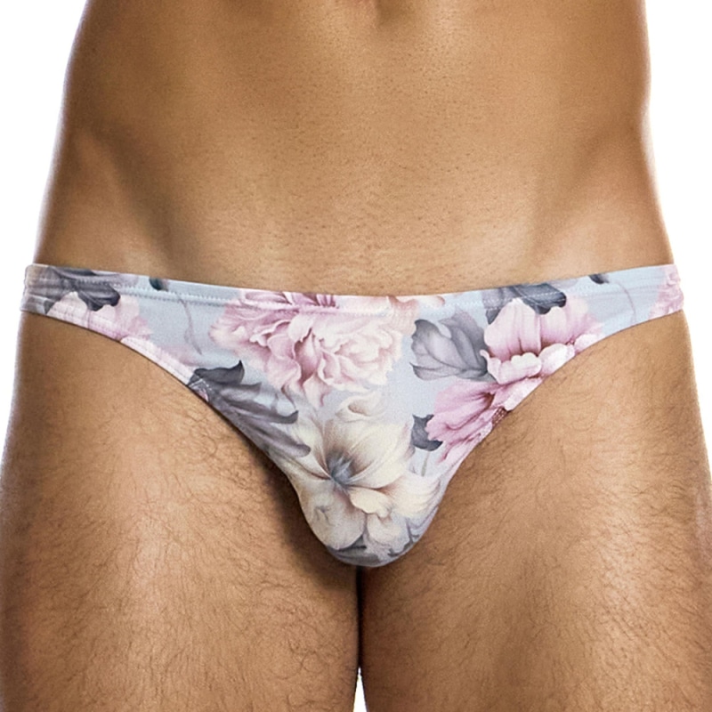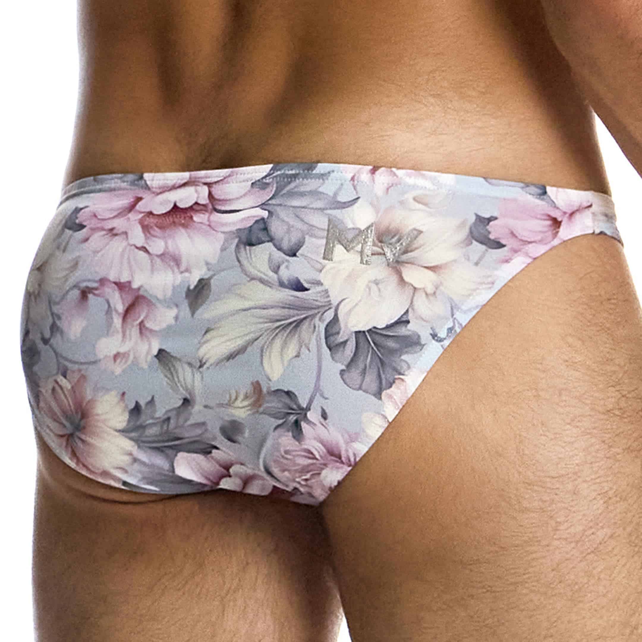 Slip sexy et élégant en microfibre extensible très douce et soyeuse. Imprimé floral romantique et délicat de couleur pâle. Coupe ultra taille basse, minimaliste et confortable. Poche frontale non doublée. Logo MV en silicone sur la fesse droite.