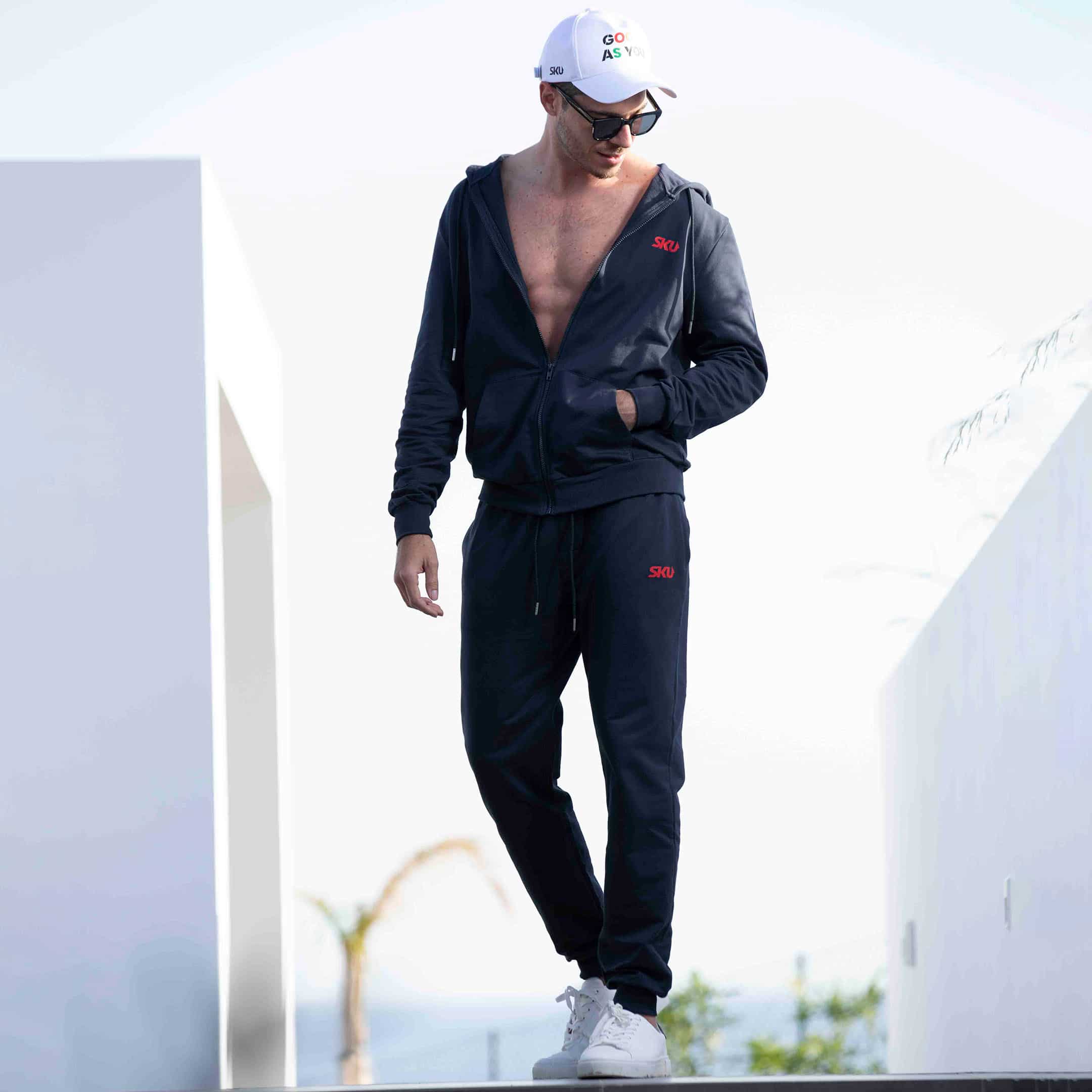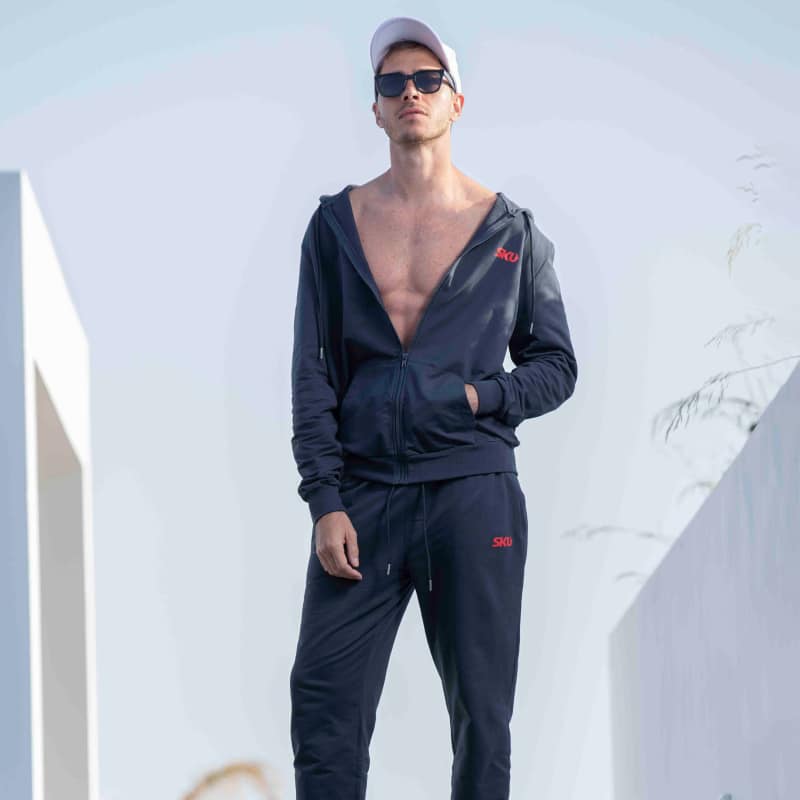 Pantalon sport en pur coton très doux et confortable. 2 poches. Ceinture élastique avec cordon de serrage. Bandes élastiquées au niveau des chevilles. Logo SKU de couleur contrastée sur la cuisse gauche. Veste vendue séparément.