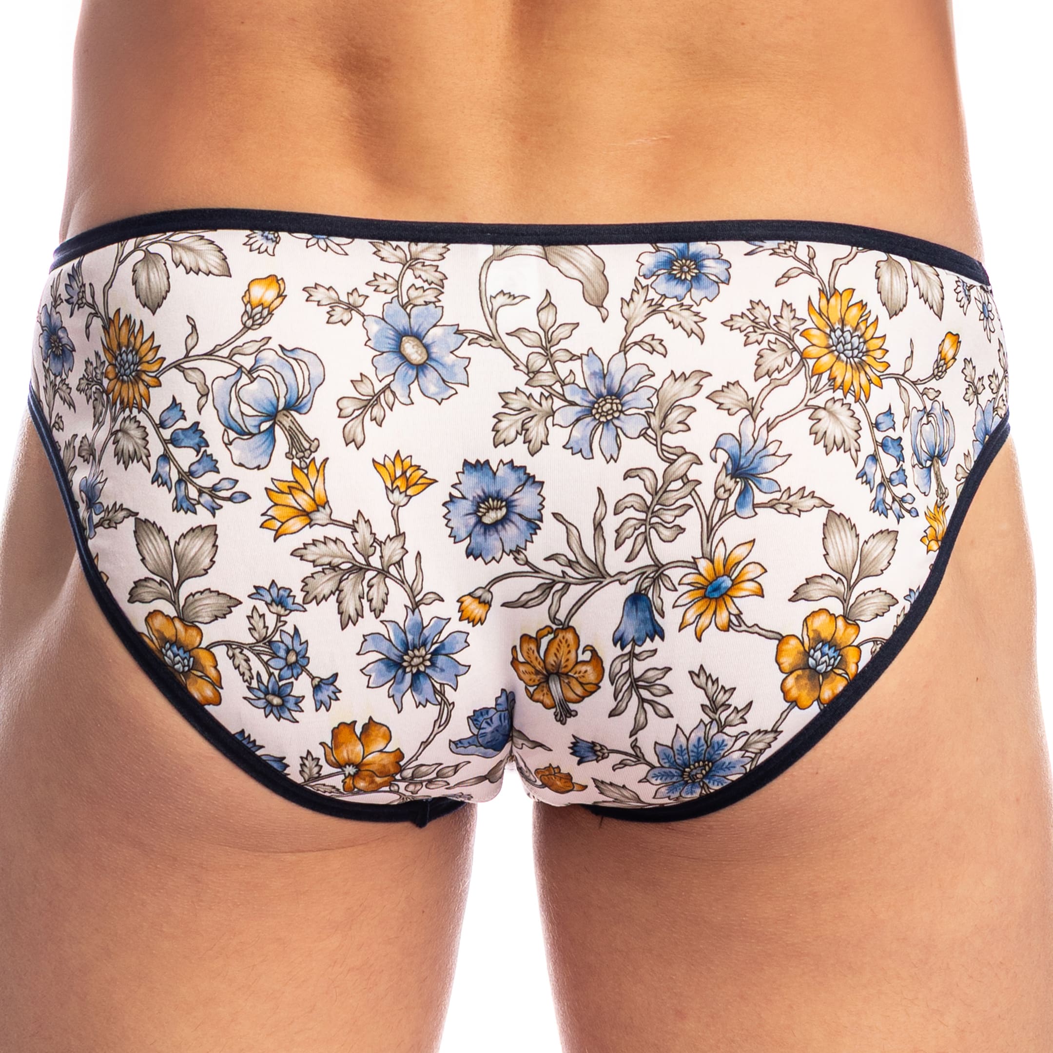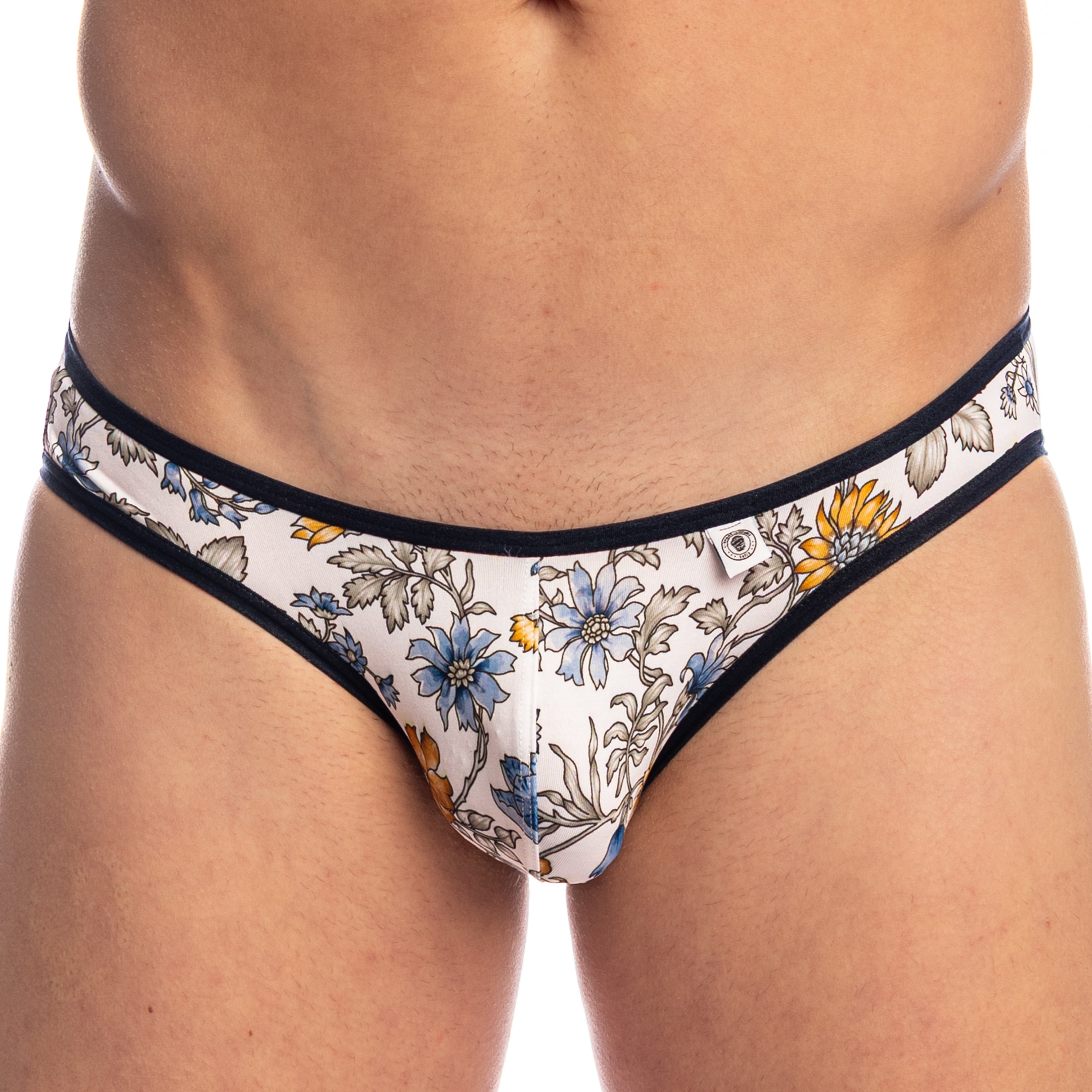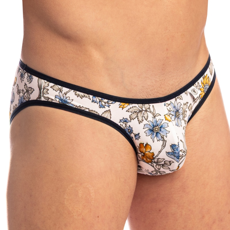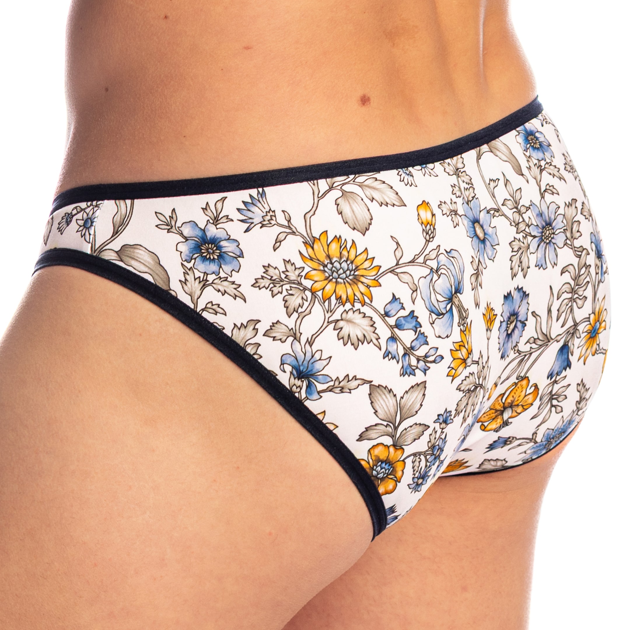Slip sensuel et élégant en microfibre extensible douce et confortable. Imprimé floral délicat inspiré de la porcelaine de Sèvres. Coupe minimaliste super taille basse. Poche frontale non doublée. Bordures de couleur contrastée. Fine ceinture élastique avec logo L'homme Invisible.