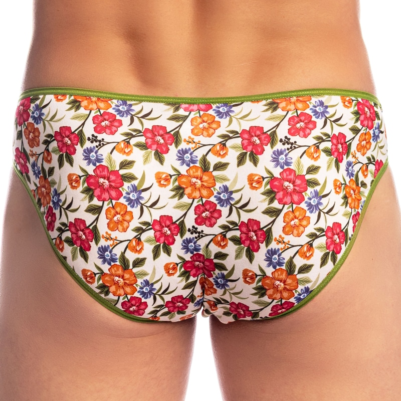 Slip très sensuel en microfibre extensible douce et confortable. Imprimé floral baroque et très coloré inspiré de la porcelaine de Rouen. Coupe minimaliste super taille basse. Poche frontale ergonomique, non doublée. Bordures de couleur contrastée. Fine ceinture élastique avec logo L'homme Invisible.