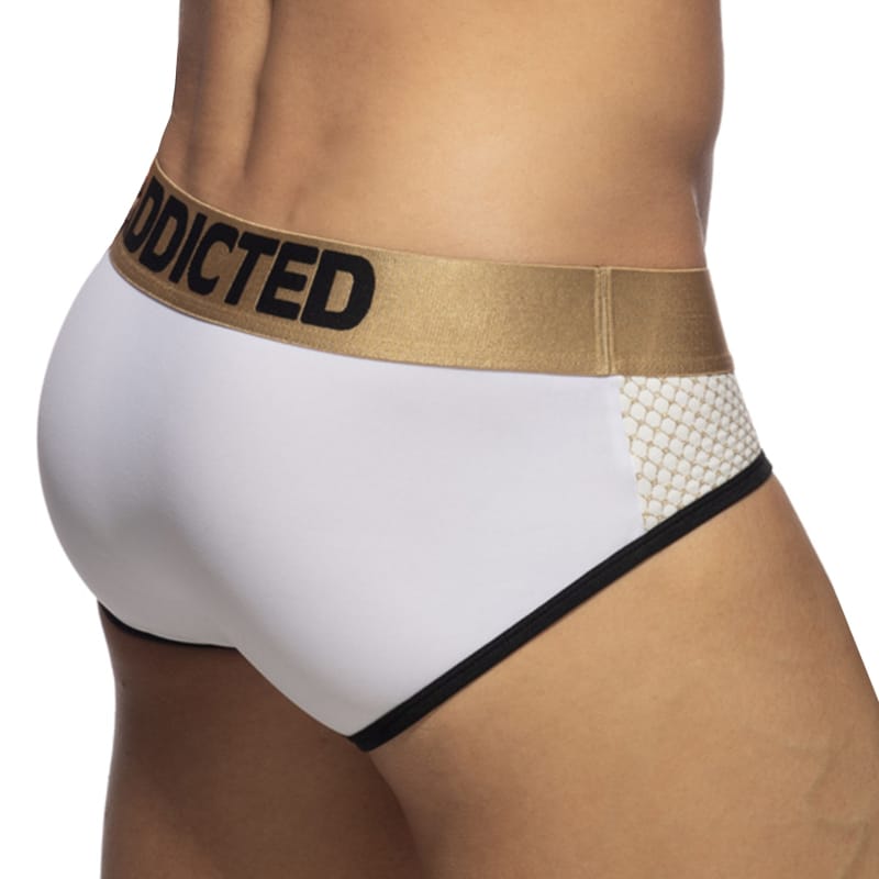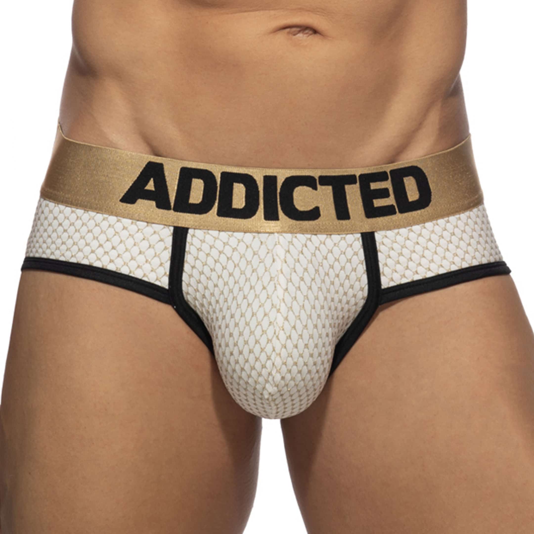 Slip 2 en 1 qui peut être porté en tant que sous-vêtement ou maillot de bain. Microfibre luxueuse recouverte de fils métallisés Lurex pour un effet cotte de maille à l'avant. Matière et design innovants qui assurent un confort maximal sous un pantalon comme dans l'eau. Coupe taille basse très ajustée. Ceinture élastique dorée signée Addicted.