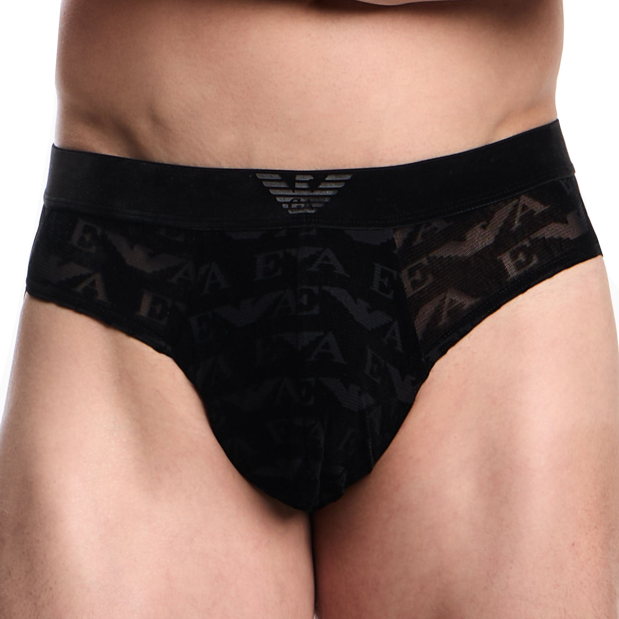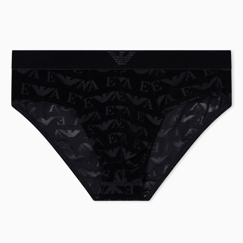 Slip luxueux et élégant en velours dévoré orné de logos iconiques pour un subtil jeu de transparence. Coupe taille basse, simple et élégante. Poche frontale doublée. Ceinture élastique signée Emporio Armani. Edition spéciale Noël : livré dans une superbe boîte métallique noire.