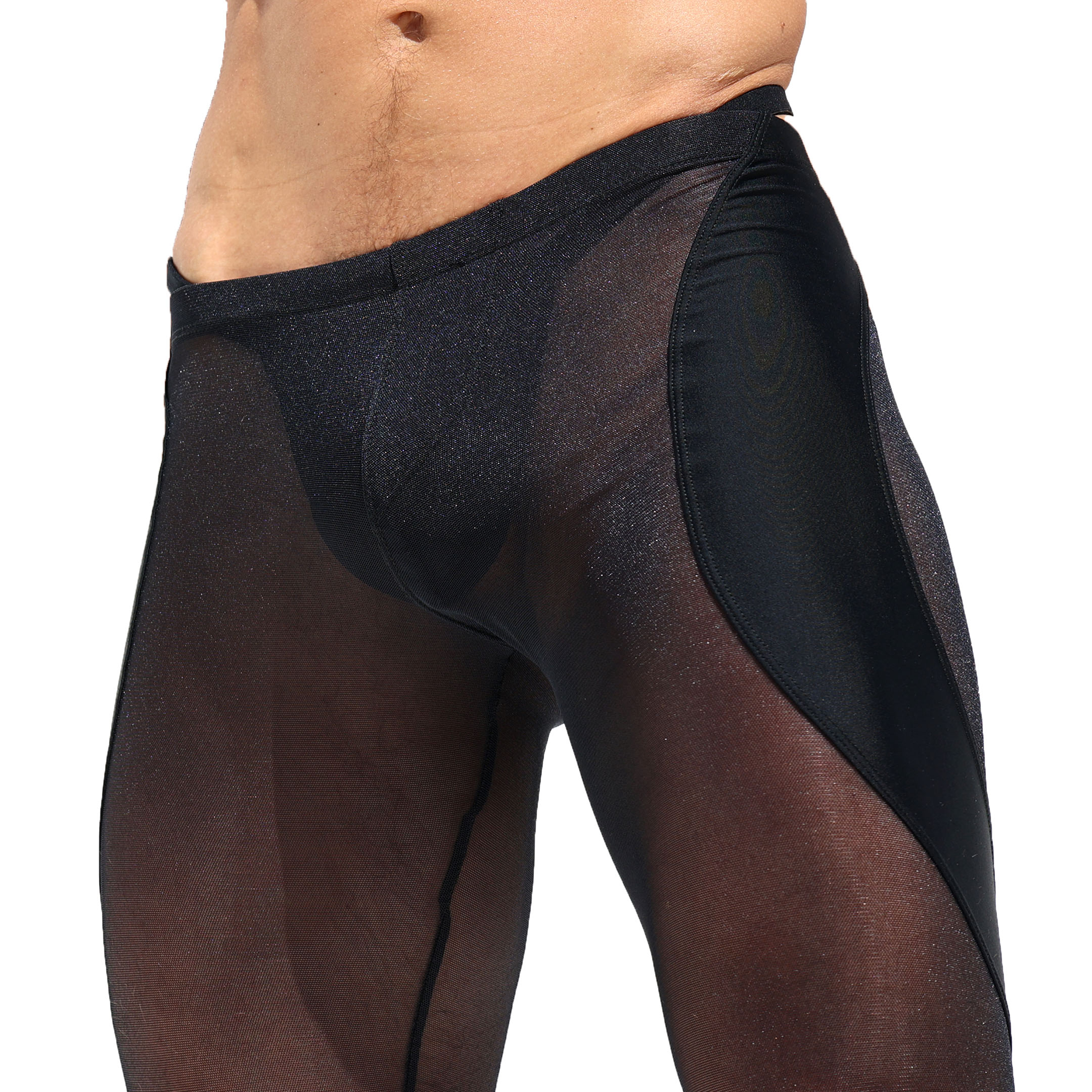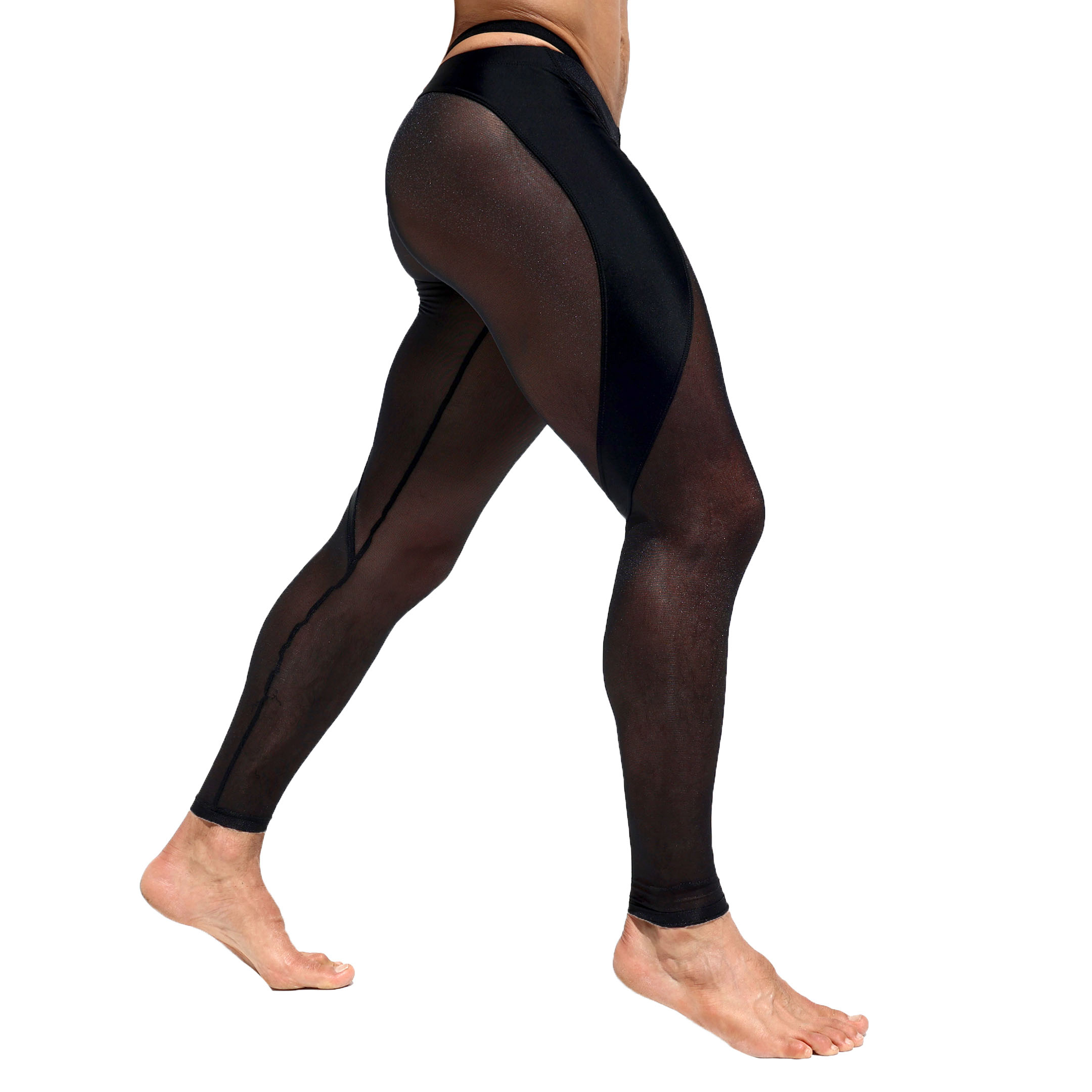 Legging en résille extensible, fine et transparente. Bandes latérales opaques le long des jambes. Braguette factice. Ceinture élastique recouverte agrémentée d'un rivet métallique signé Rufskin. Le modèle en photo porte un string sans ficelle Ruggero vendu séparément.