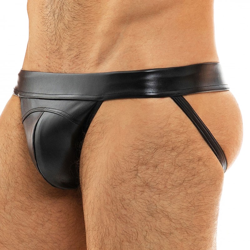Sexy low-cut jock made from luxurious microfiber with the look of leather. Lined pouch. Metallic brand logo on the back. Covered elastic waistband.
