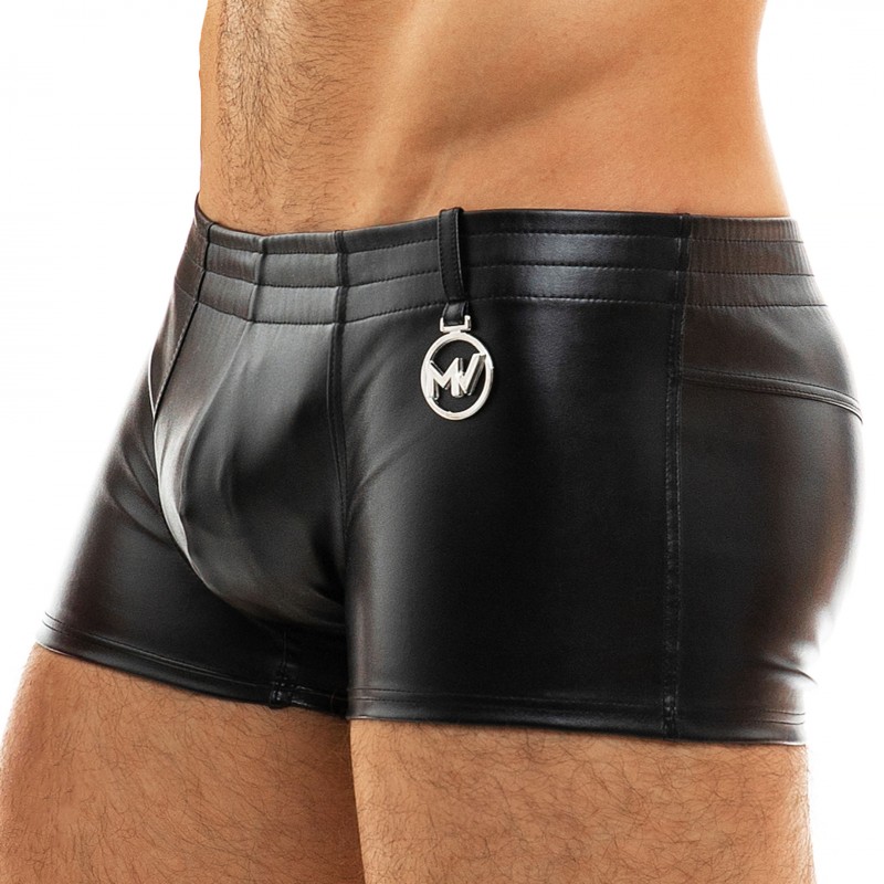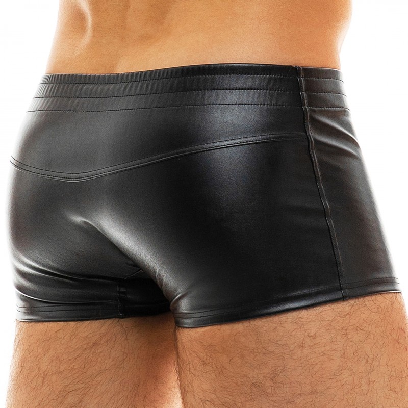 Sexy low-cut trunk made from luxurious microfiber with the look of leather. Lined pouch. Metallic brand logo on the side. Covered elastic waistband.