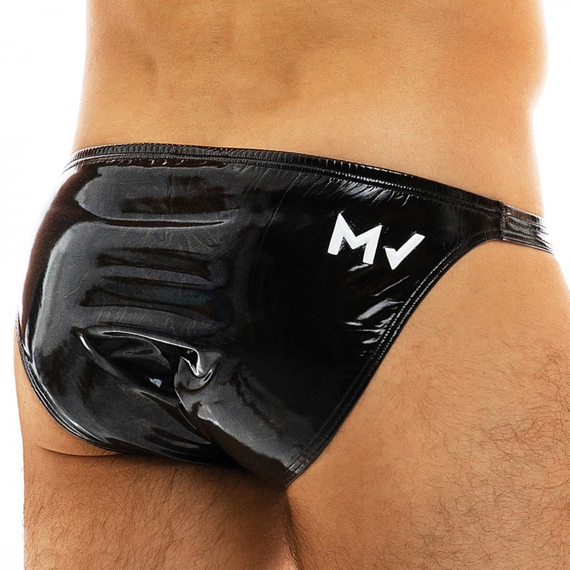 Super low-cut brief made from glossy vinyl for a fetish look. Thin covered elastic waistband. MV embossed logo on the front and back.