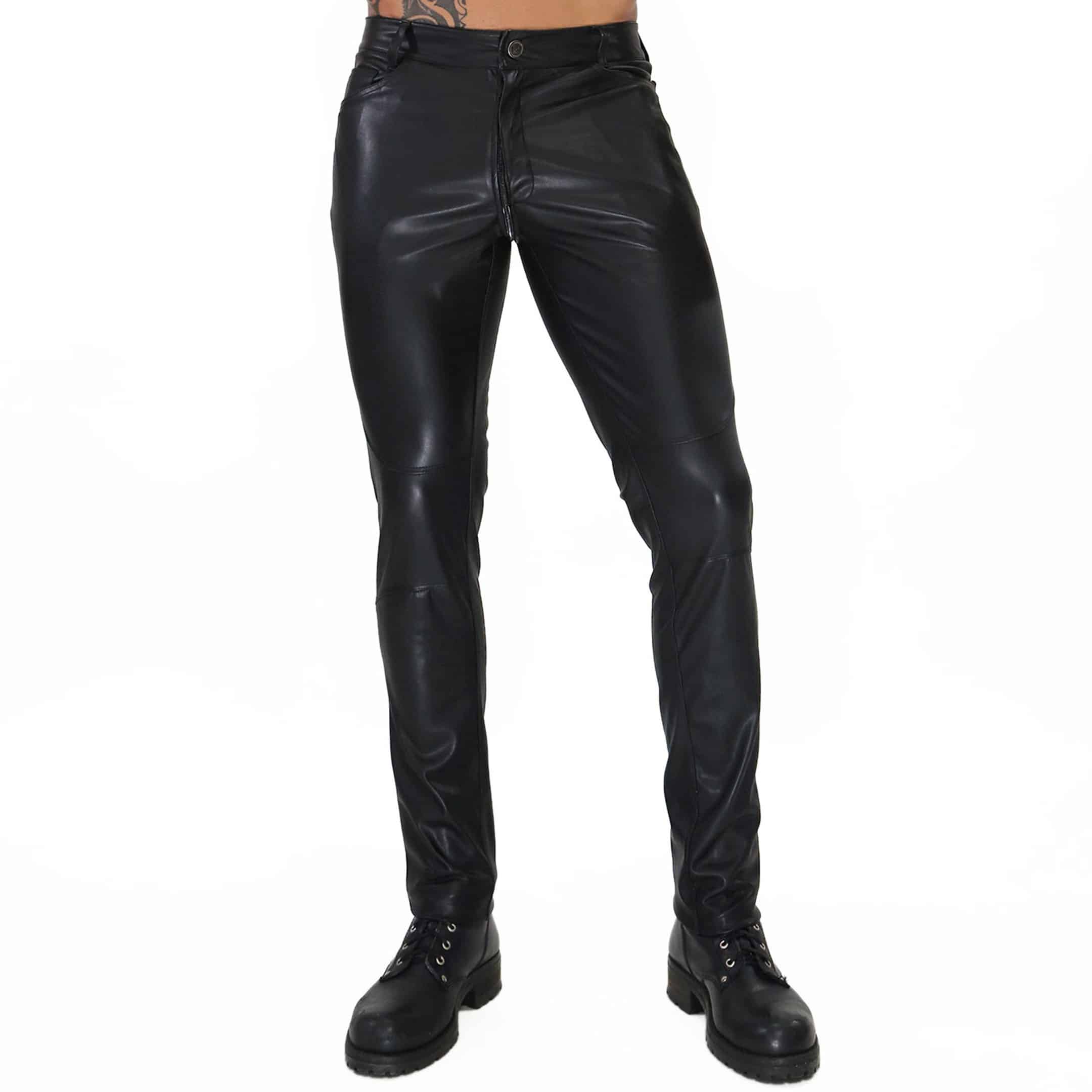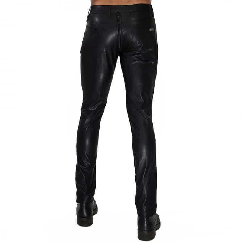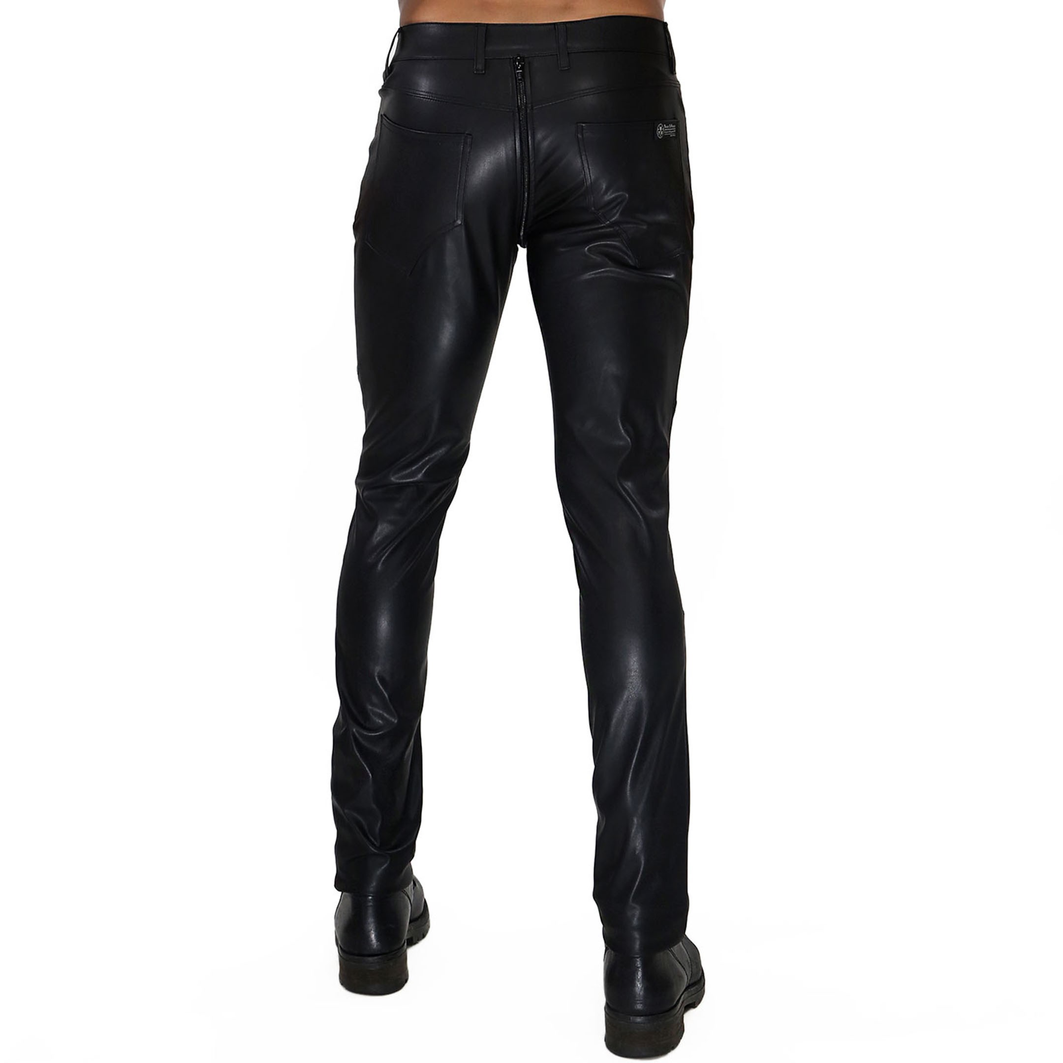 Low-rise fitted pants made from mat stretch microfiber perfectly imitating leather, for a very fetish look. Double-slider zipper and anti-pinch protection, for full opening without risk. Soft suede lining. 5 pockets. Belt loops. Made in France.