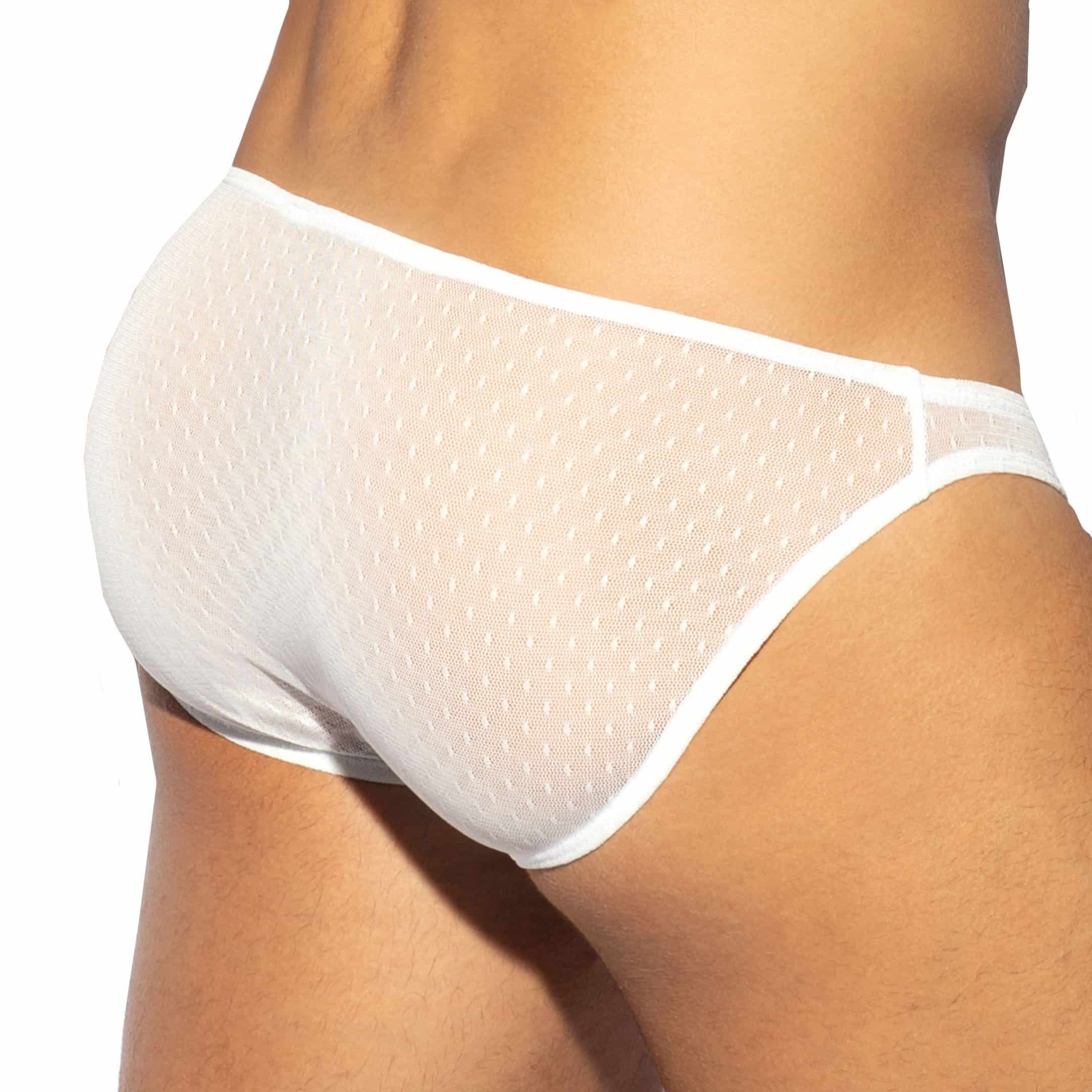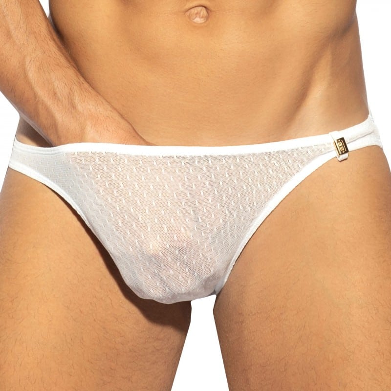 Ultra sexy brief made from see-through mesh. Low-rise mini cut. Elastic waistband with golden metallic logo.