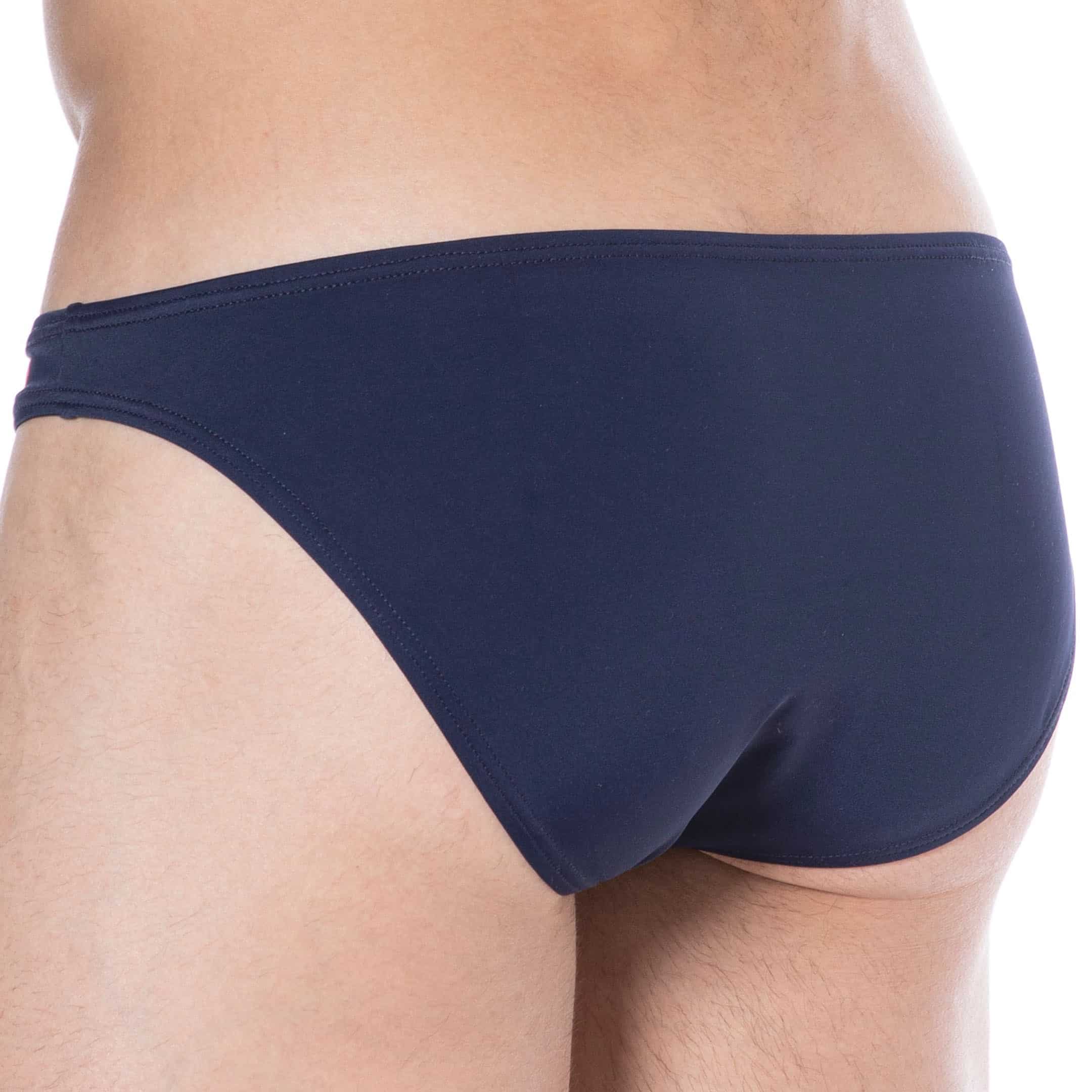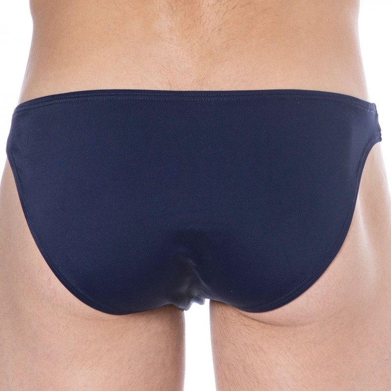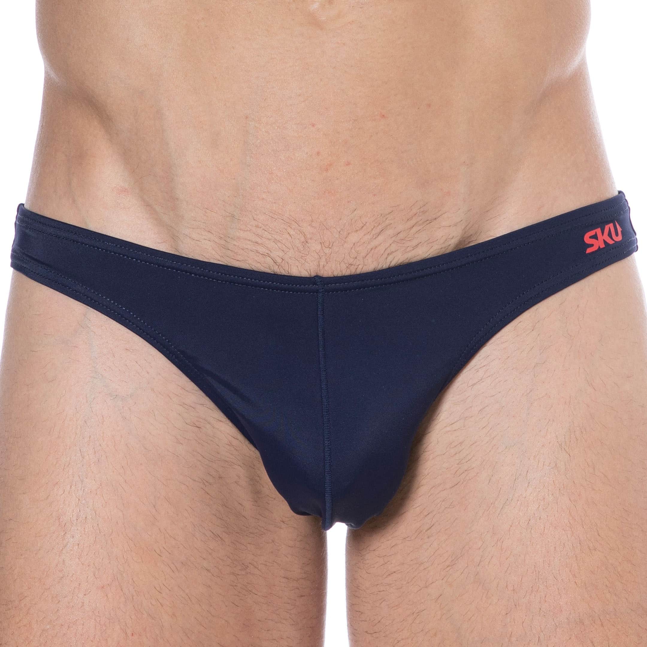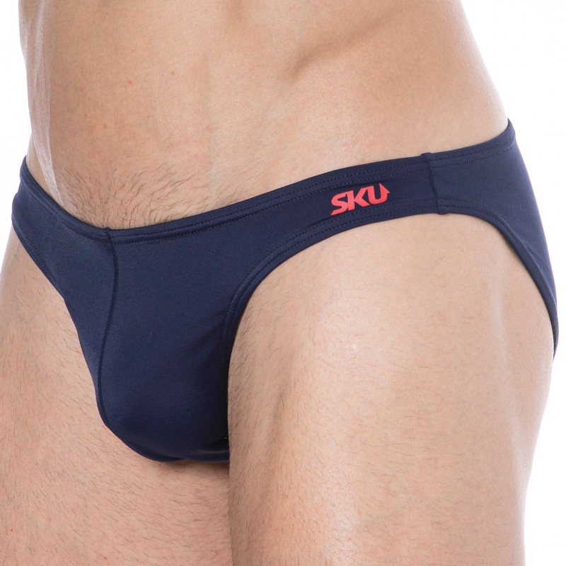 Mini swim brief made from quick-drying microfiber. Low-rise and fitted cut. Unlined front pouch. SKU logo print ont the left hip. Thin elastic waistband.