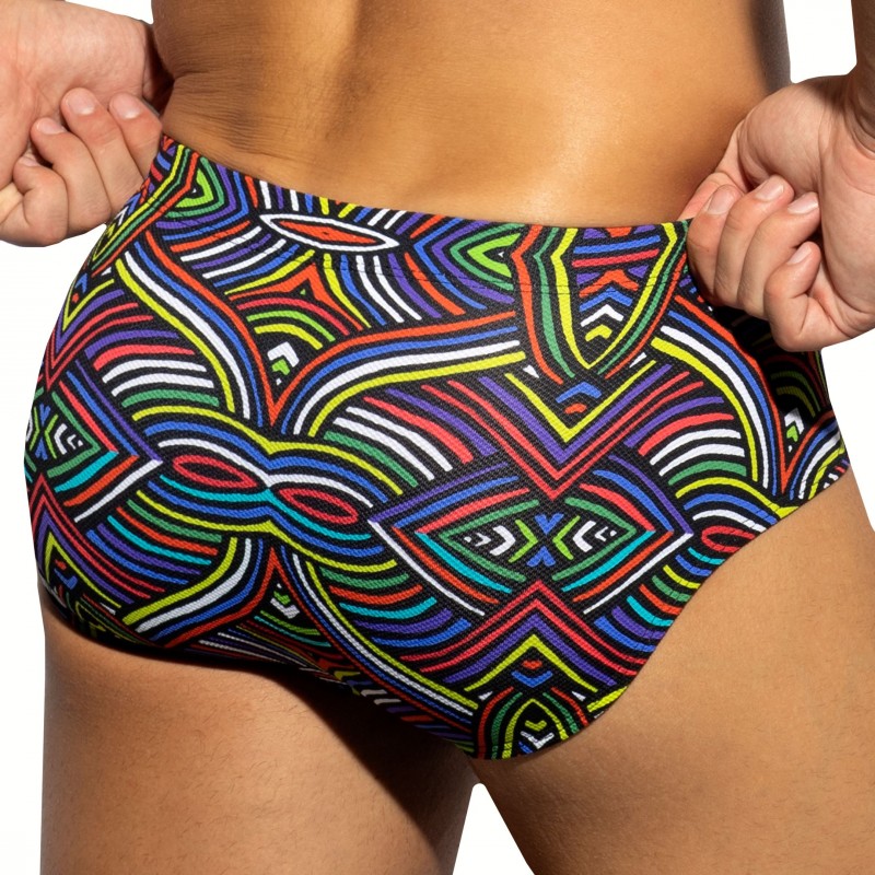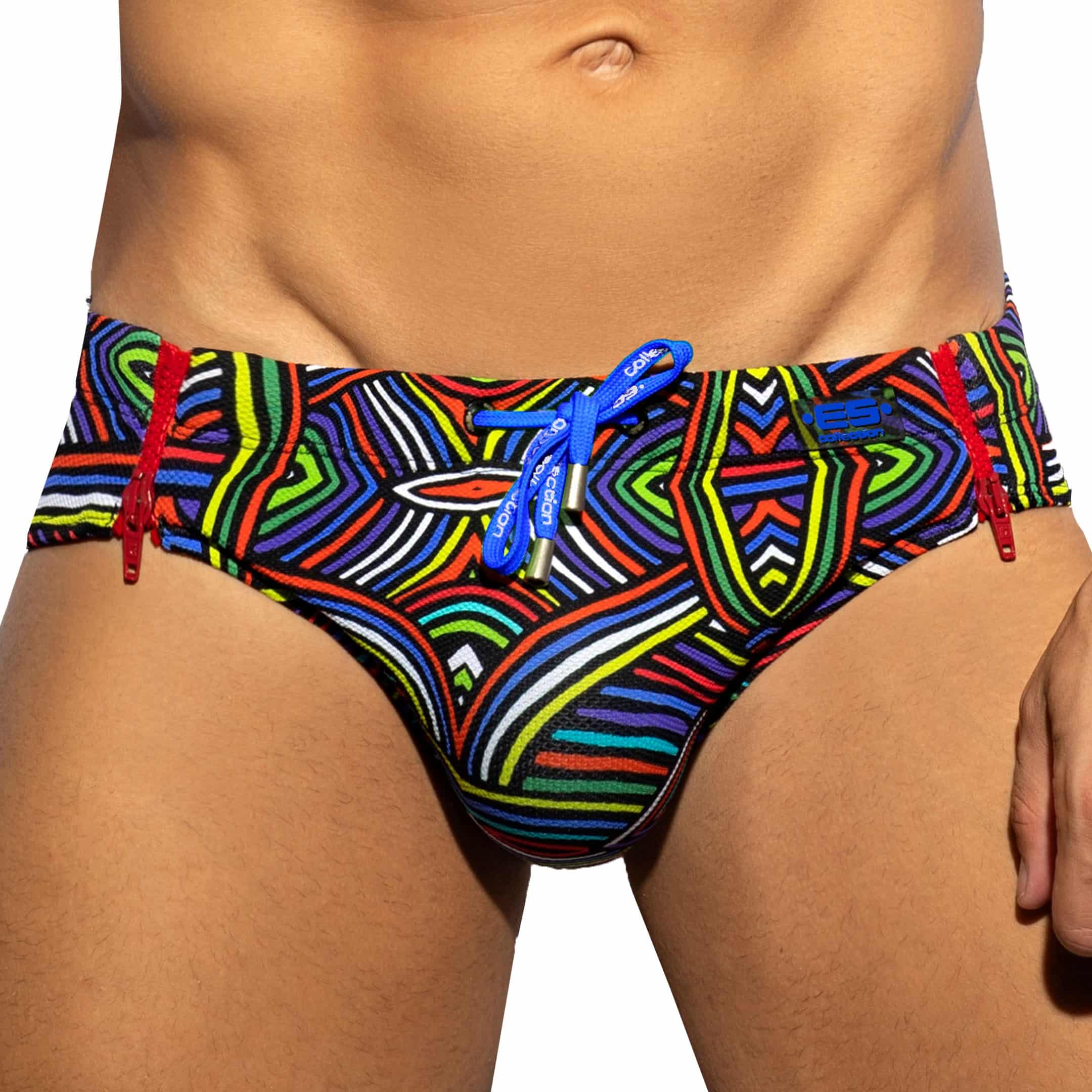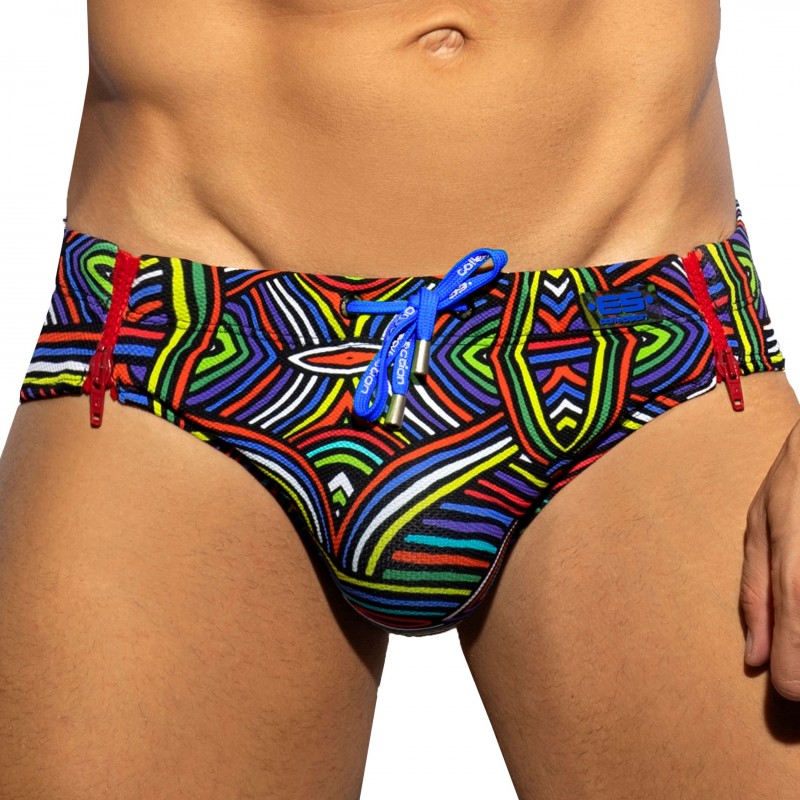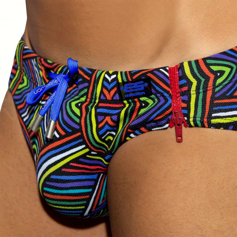 Low-rise swim brief made from pique microfiber. Ecowave fabric recycled from plastic bottles. Funny and colorful labyrinth print. Original design with 2 functional side zippers. Removable Pack Up foam system to enhance your manhood. ES Collection silicone logo on the left hip. Elastic waistband with drawstring.