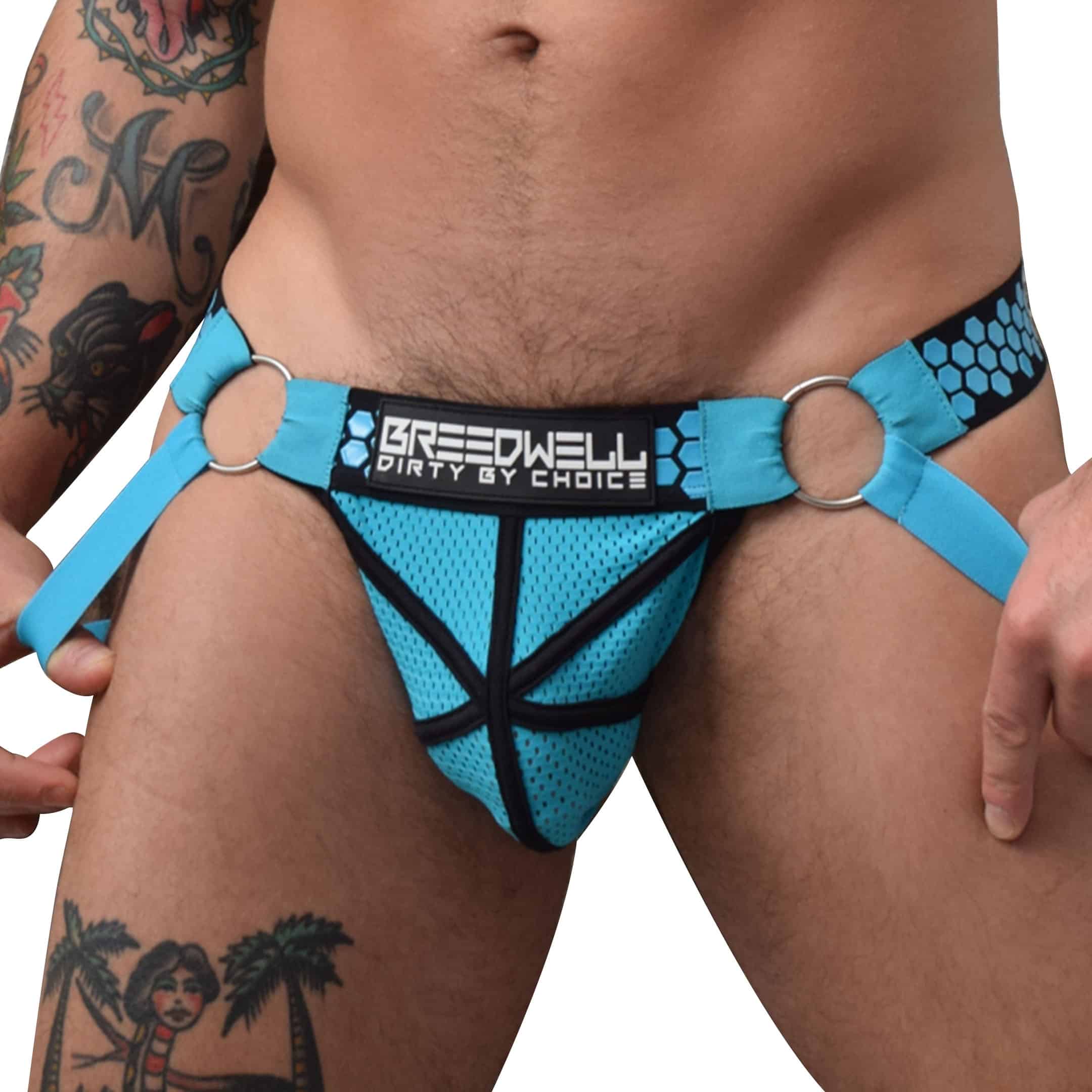 Ultra sexy jockstrap made from stretch sports mesh. Crisscrossing stripes highlight the pouch. Elastic waistband covered with shiny silicone hexagons. Straps connected by metal rings. Breedwell patch on front and back.