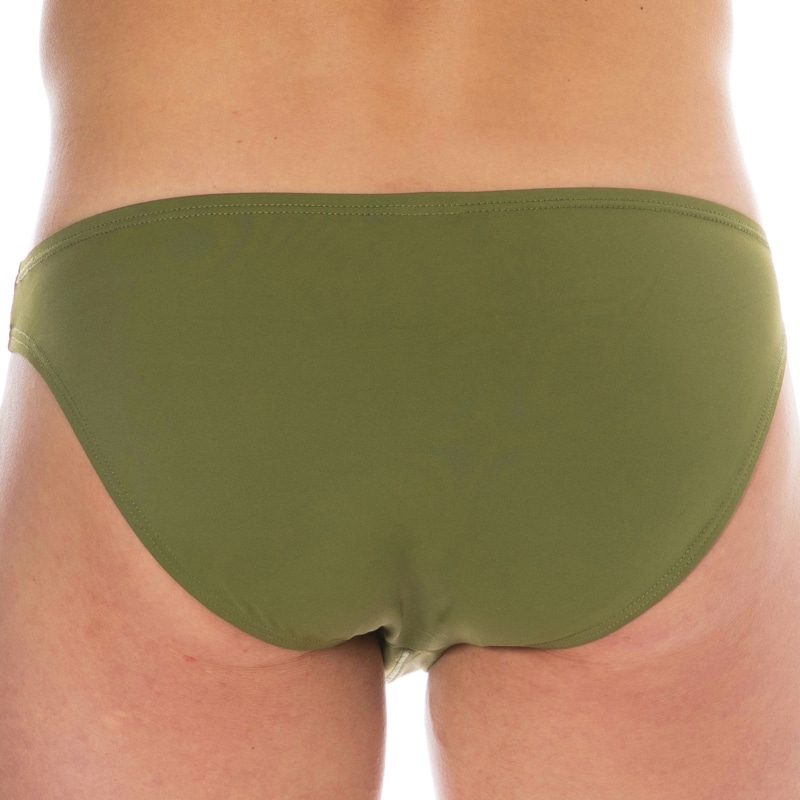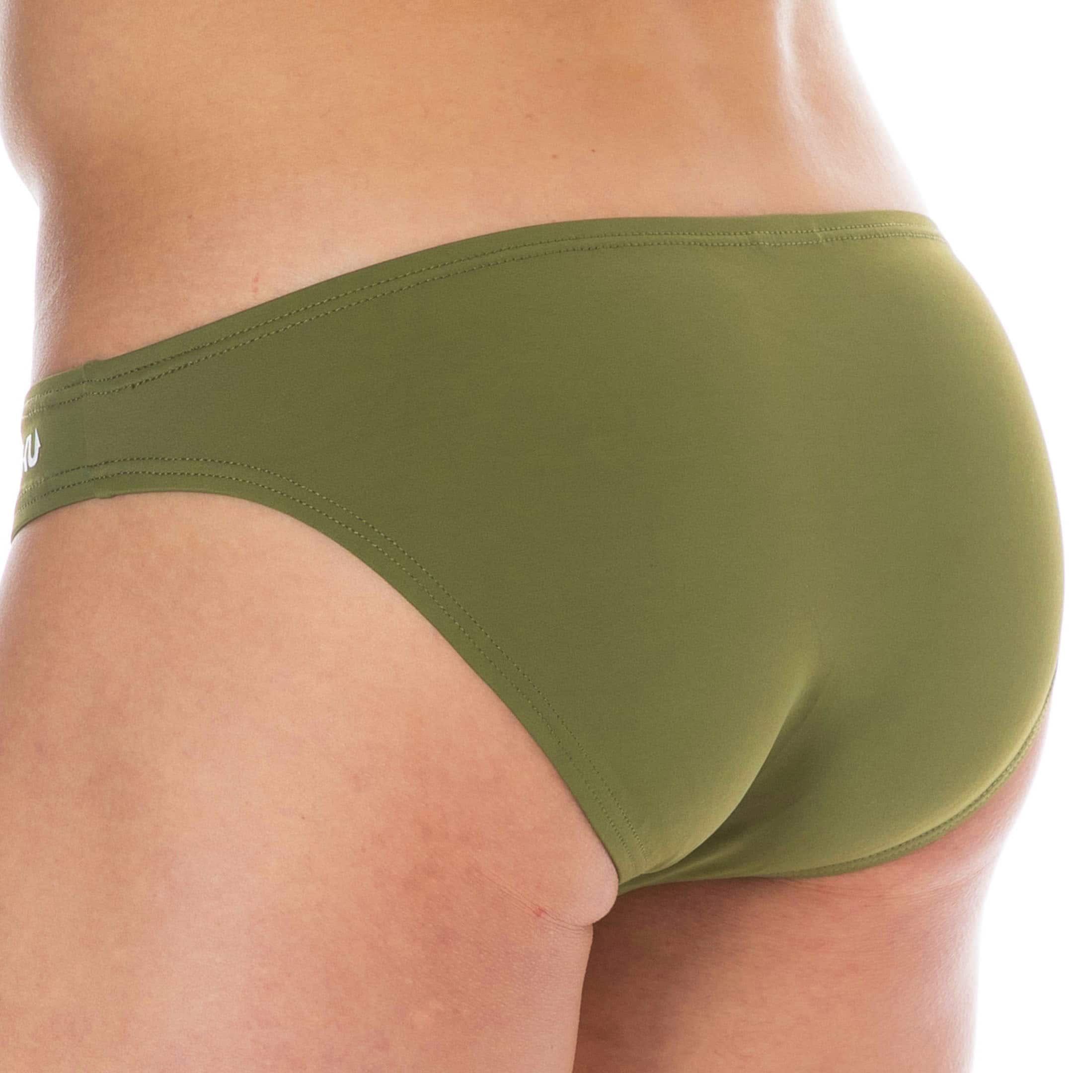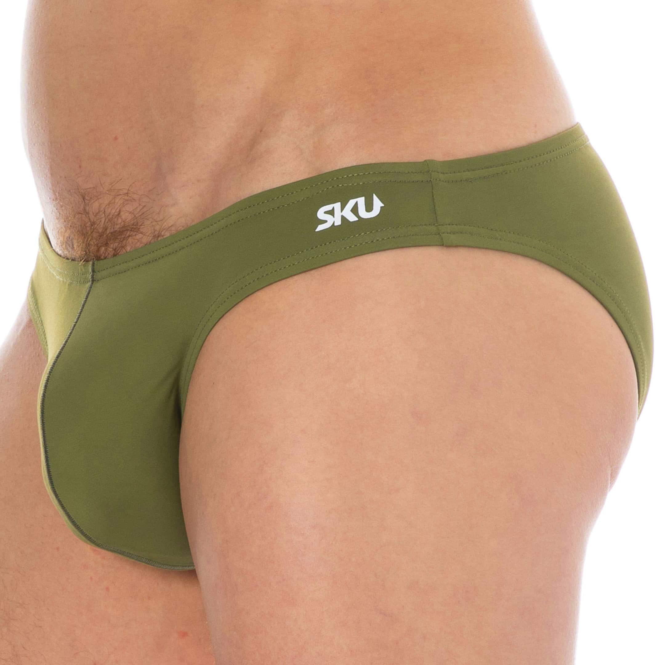Mini swim brief made from quick-drying microfiber. Low-rise and fitted cut. Unlined front pouch. SKU logo print ont the left hip. Thin elastic waistband.