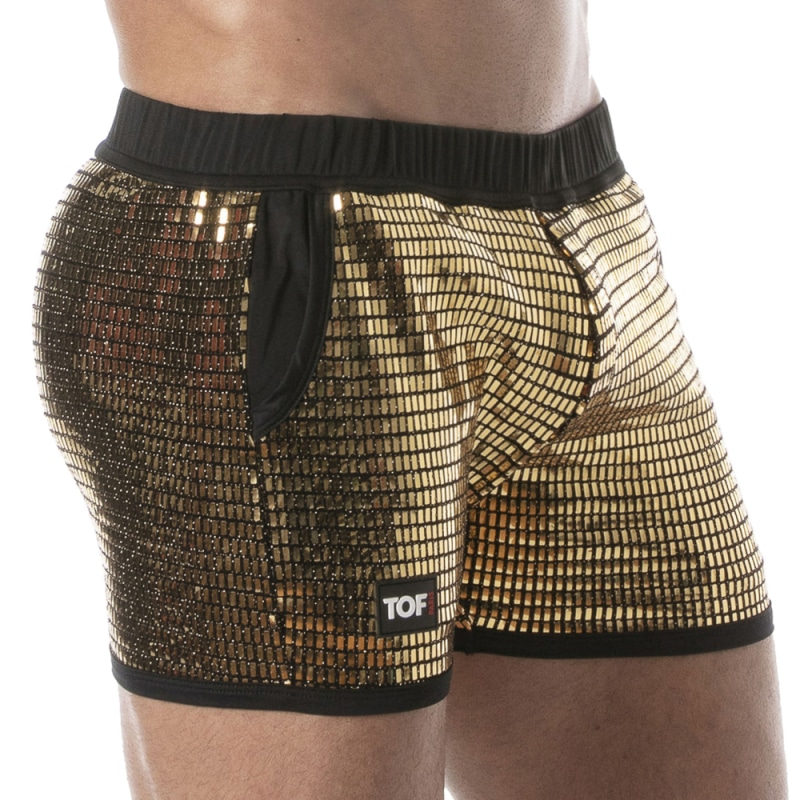 Short made from microfiber covered with glittering squares for a disco ball effect. Side pockets. Contrast trim. TOF silicone label on the right leg. Covered elastic waistband. Made in France. Care tips: handwash only, do not bleach, do not tumble dry, do not iron.