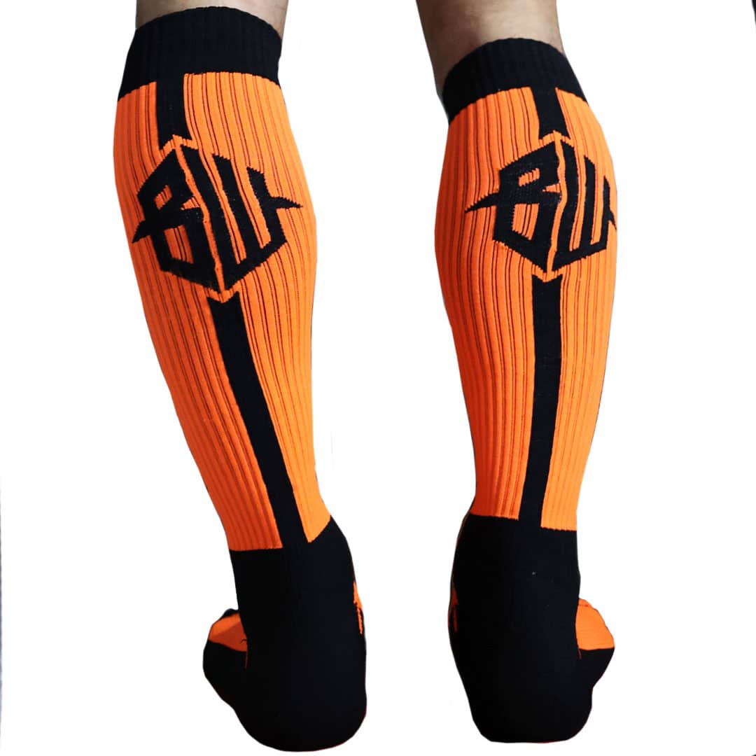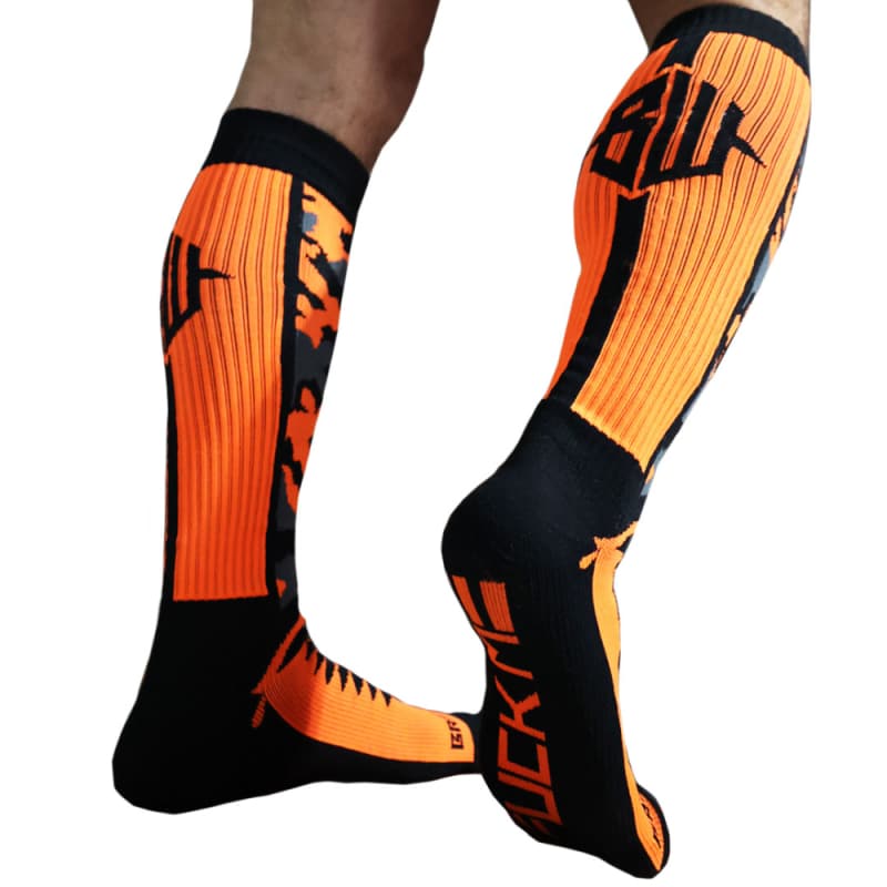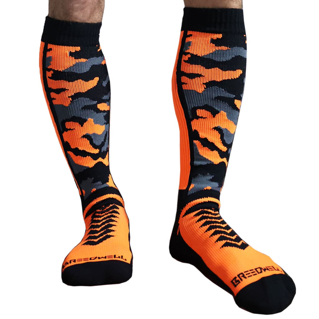Knee high socks in stretch rib fabric. Camouflage-inspired graphic pattern. Breedwell logo on calf and toe. FUCK ME lettering under the foot. One size fits all.