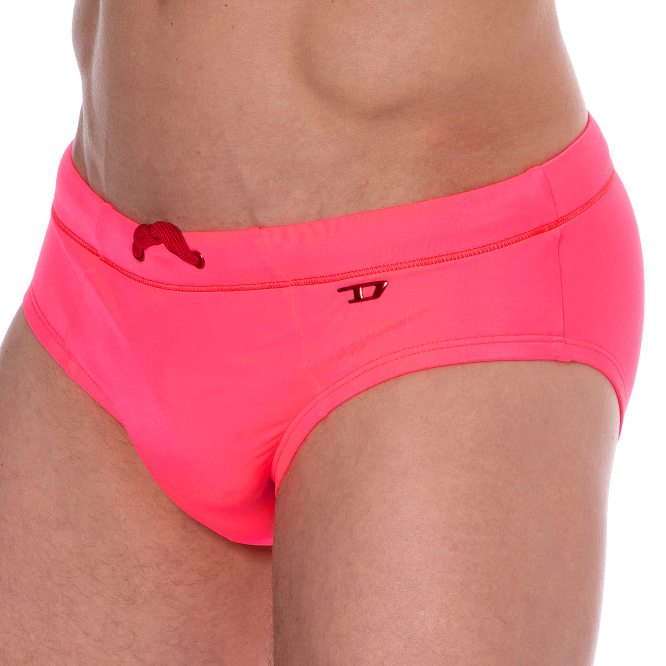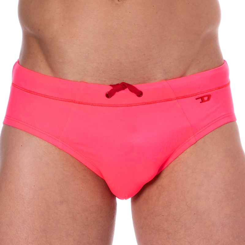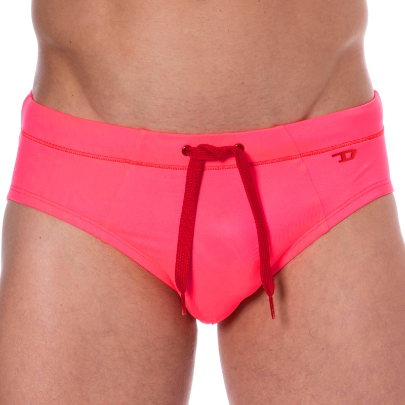 Swim brief made from quick-drying microfiber in neon color. Fully lined. Contrast embossed Diesel logo on the left hip. Covered elastic waistband with drawstring.