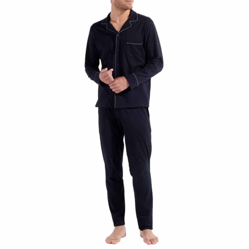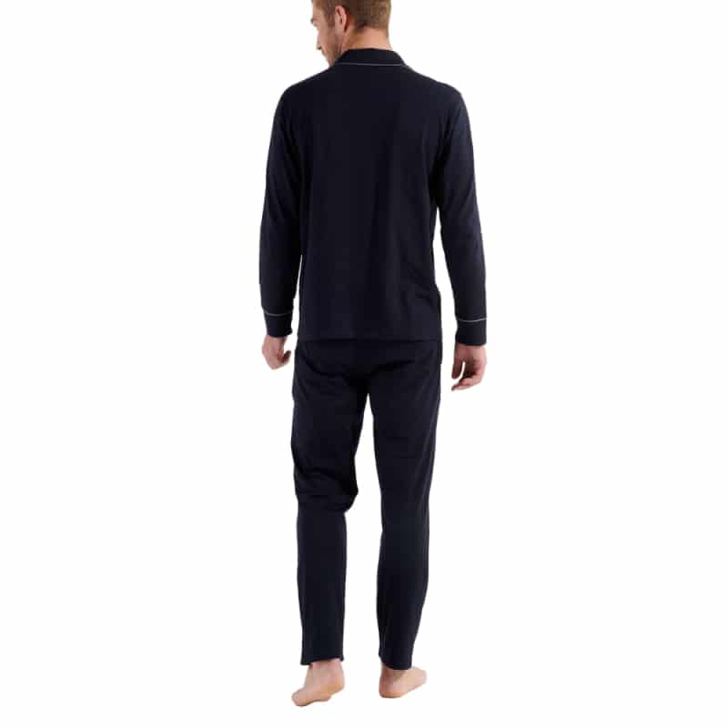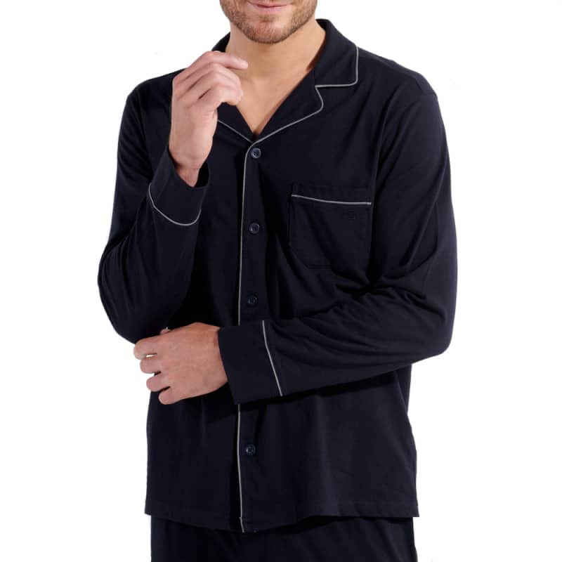 Elegant and comfortable pyjama set in pure cotton. High-quality Oeko-Tex-certified fabric. Top with long sleeves, shirt collar, button closure, chest pocket and contrast piping. Pants with drawstring waistband.
