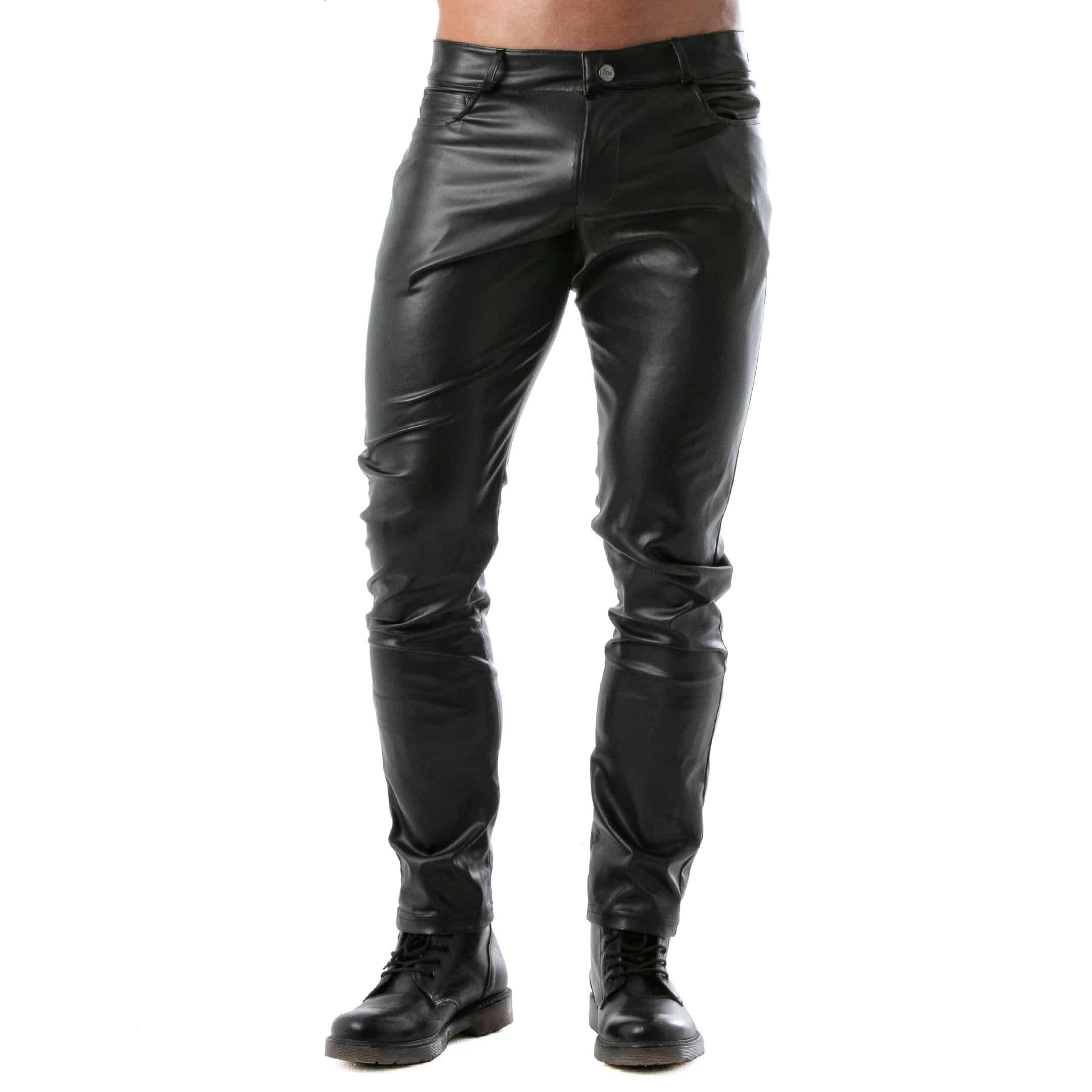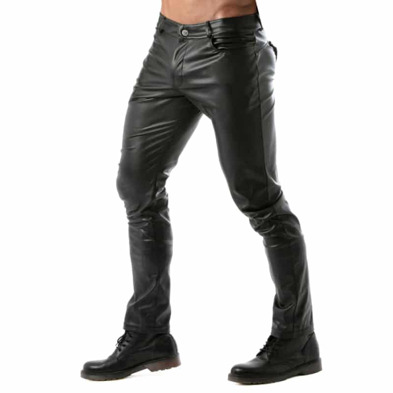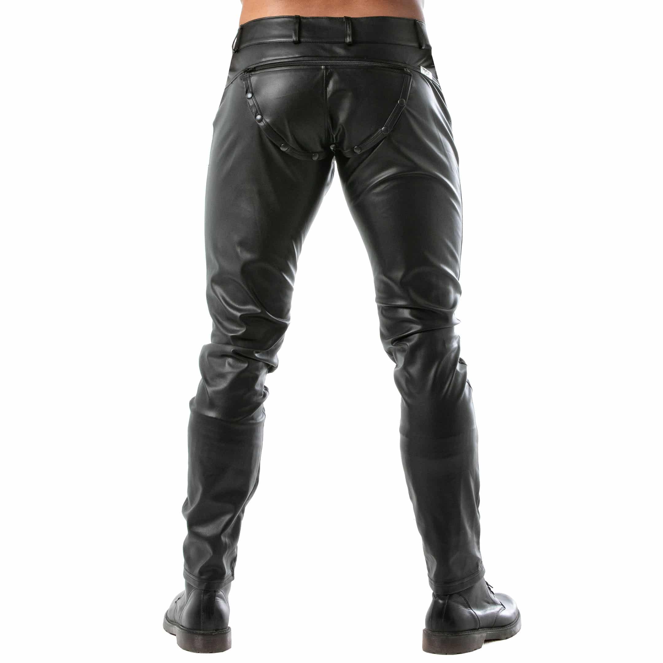 Sexy pants in stretchy faux leather for a fetish look. Removable back yoke to reveal your buttocks thanks to zipper and press studs. 3 pockets. Button fly with zipper. Belt loops. Made in France.