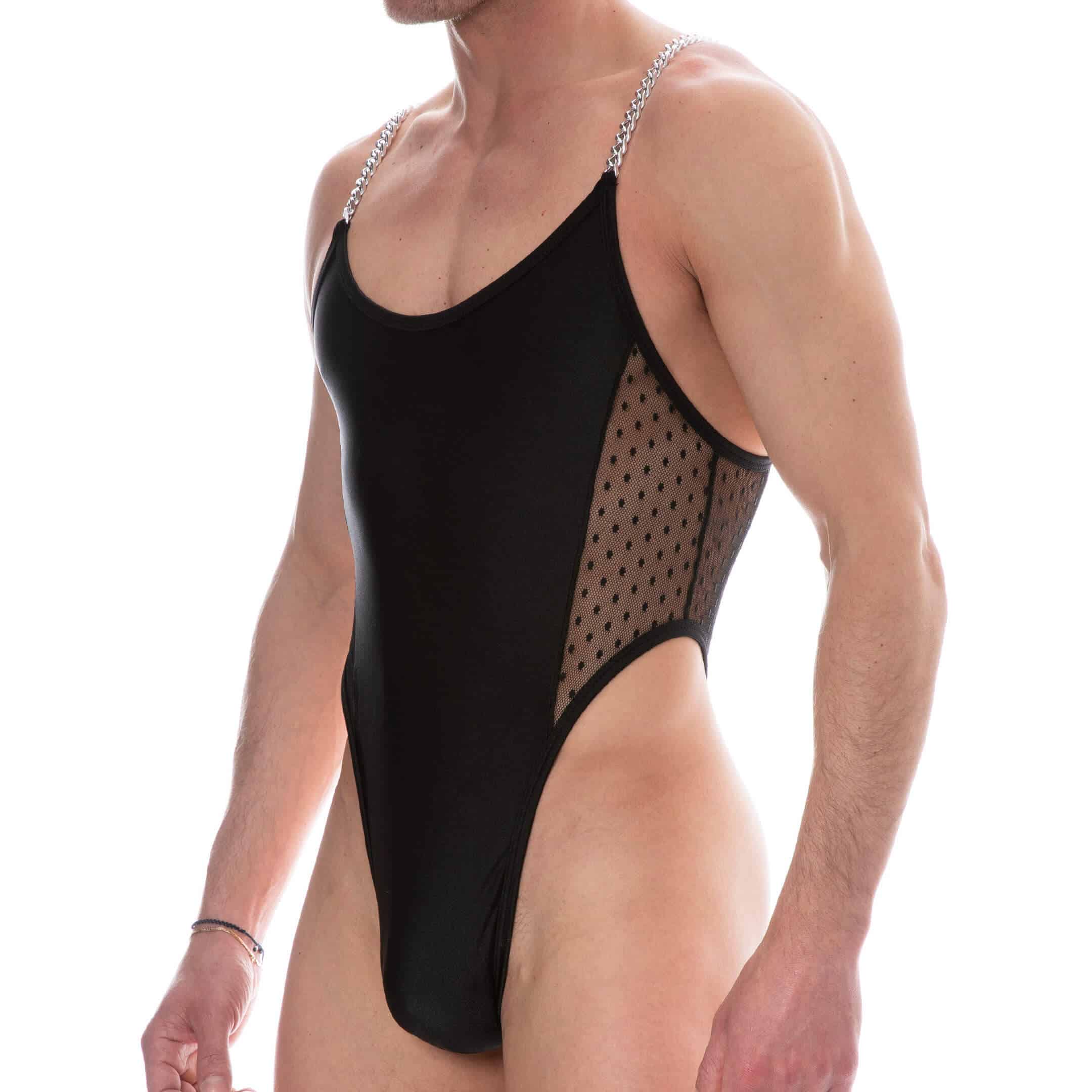 Thong bodysuit made from soft and comfortable microfiber. Original model with high scoops on the hips. Silver chain as shoulder straps. Transparent mesh side panels with polka-dot embellishments. Omohonia silicone label on the upper back.