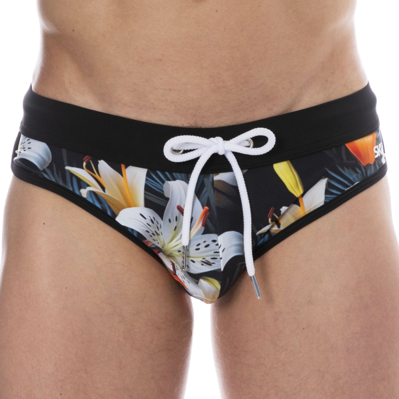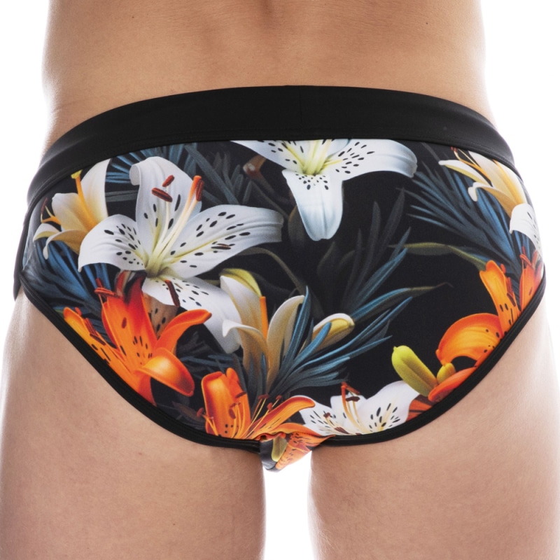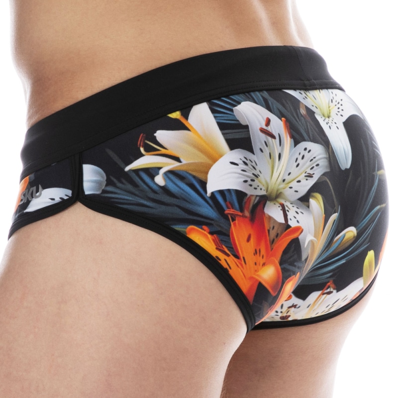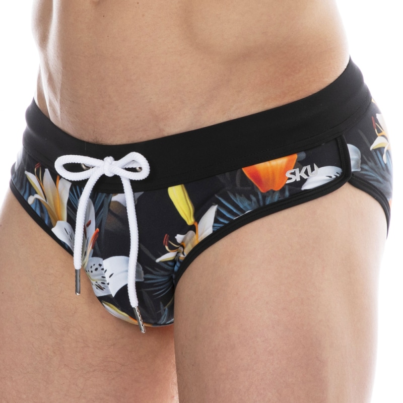 Sporty swim brief made from quick-drying microfiber. Superb, original and intense tropical print. Low-rise and fitted cut. Lined front pouch. Contrast trim. SKU silver logo print ont the left hip. Elastic waistband with drawstring.