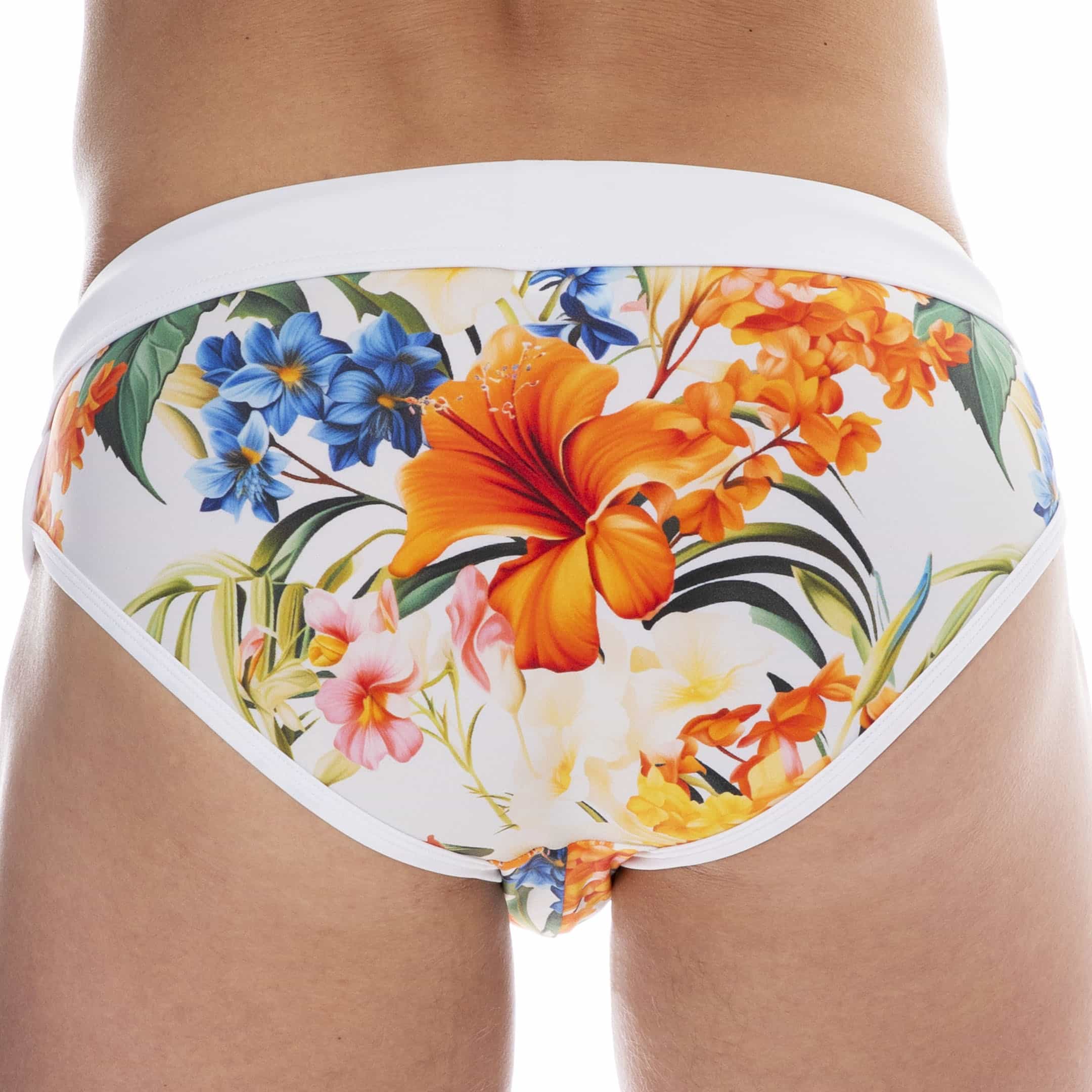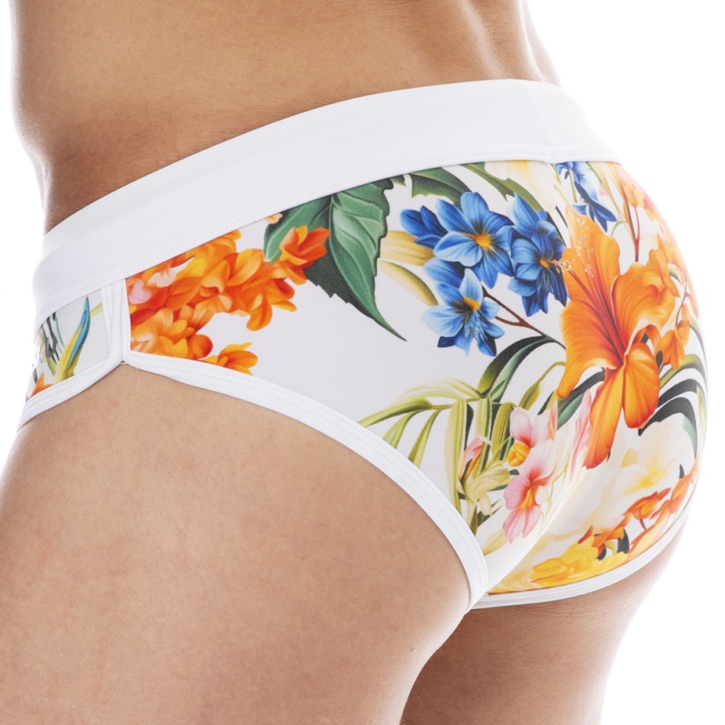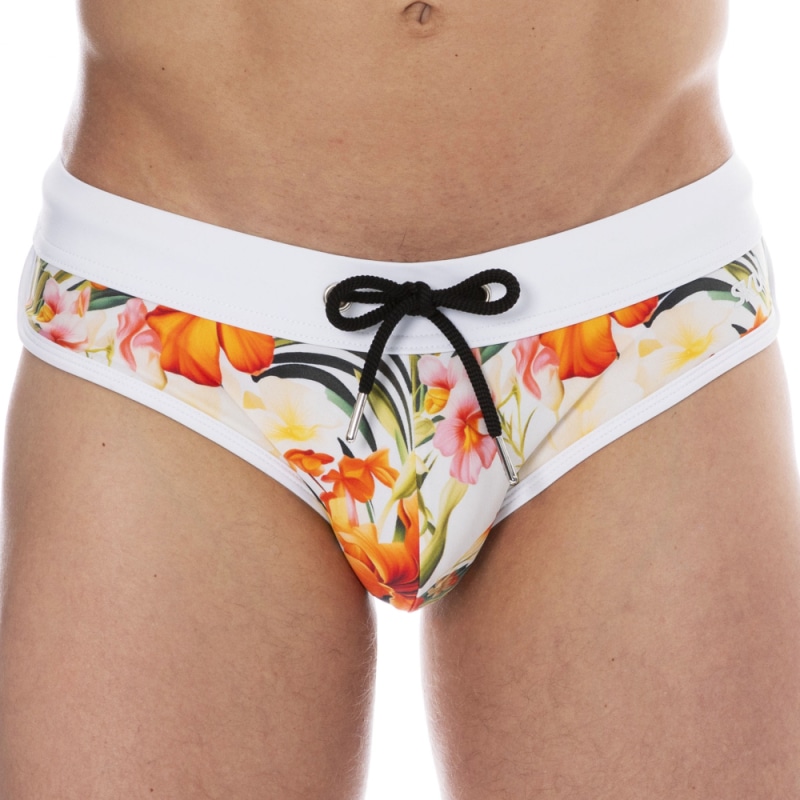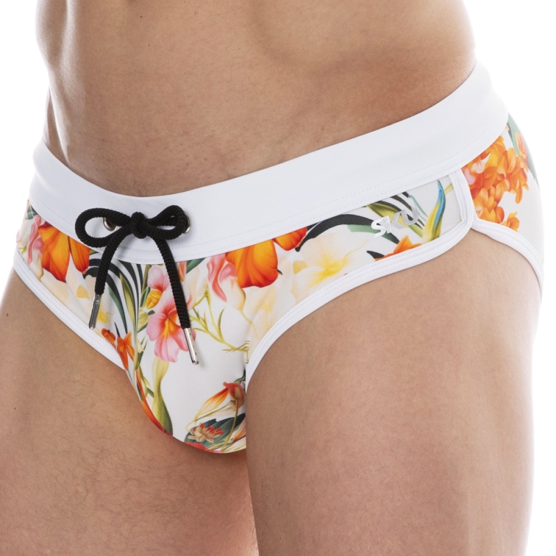Sporty swim brief made from quick-drying microfiber. Superb, original and intense tropical print. Low-rise and fitted cut. Lined front pouch. Contrast trim. SKU silver logo print ont the left hip. Elastic waistband with drawstring.