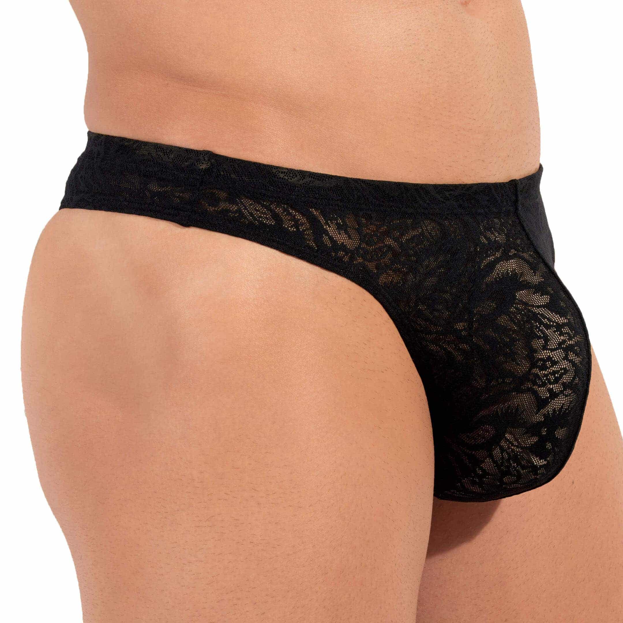 Chic, sensual thong in beautiful fine sheer lace. Cashmere-inspired pattern. Clean-cut fabric for comfort and discretion. Fitted low-rise cut. Unlined front pouch. Thin elastic waistband with HOM label sewn on the left hip.