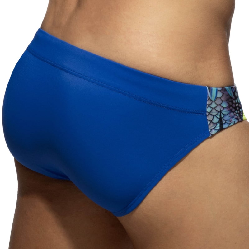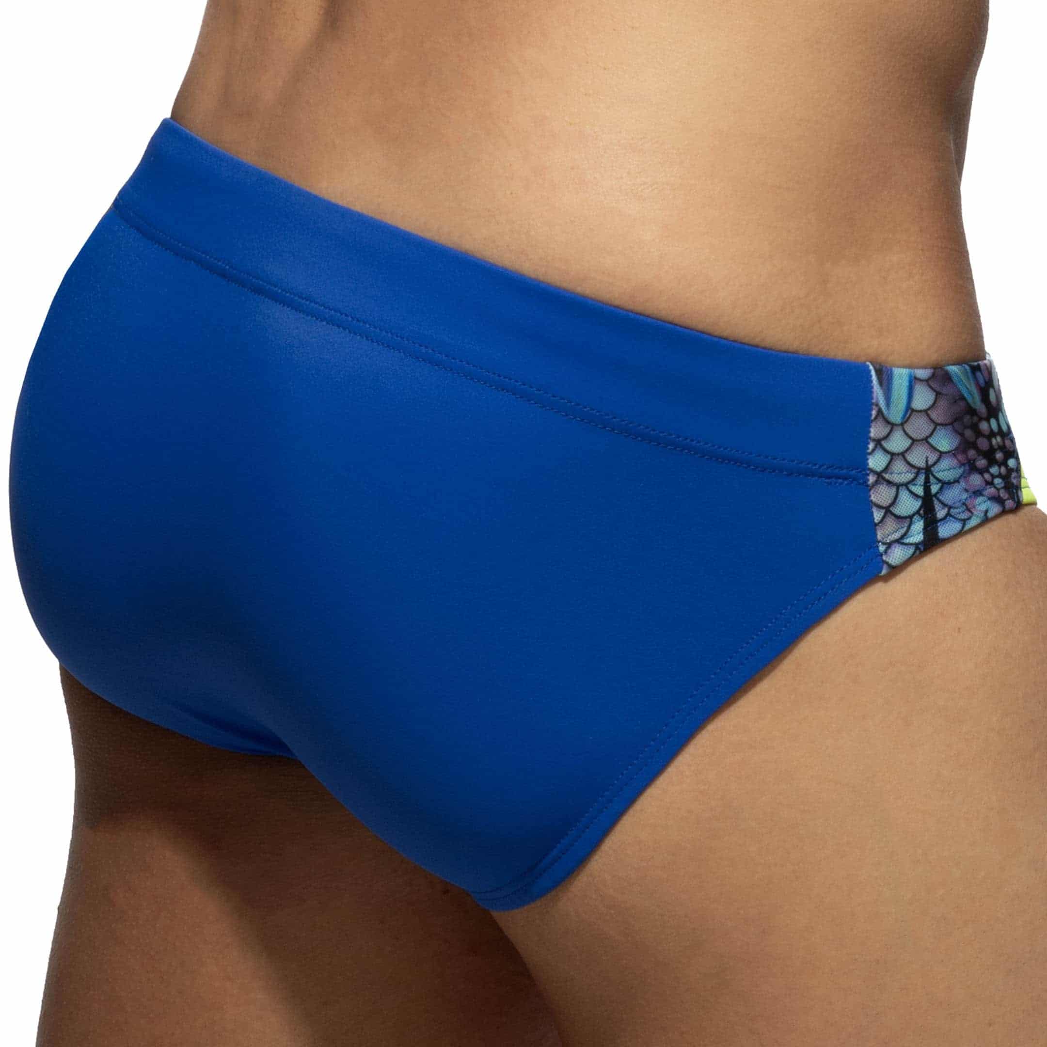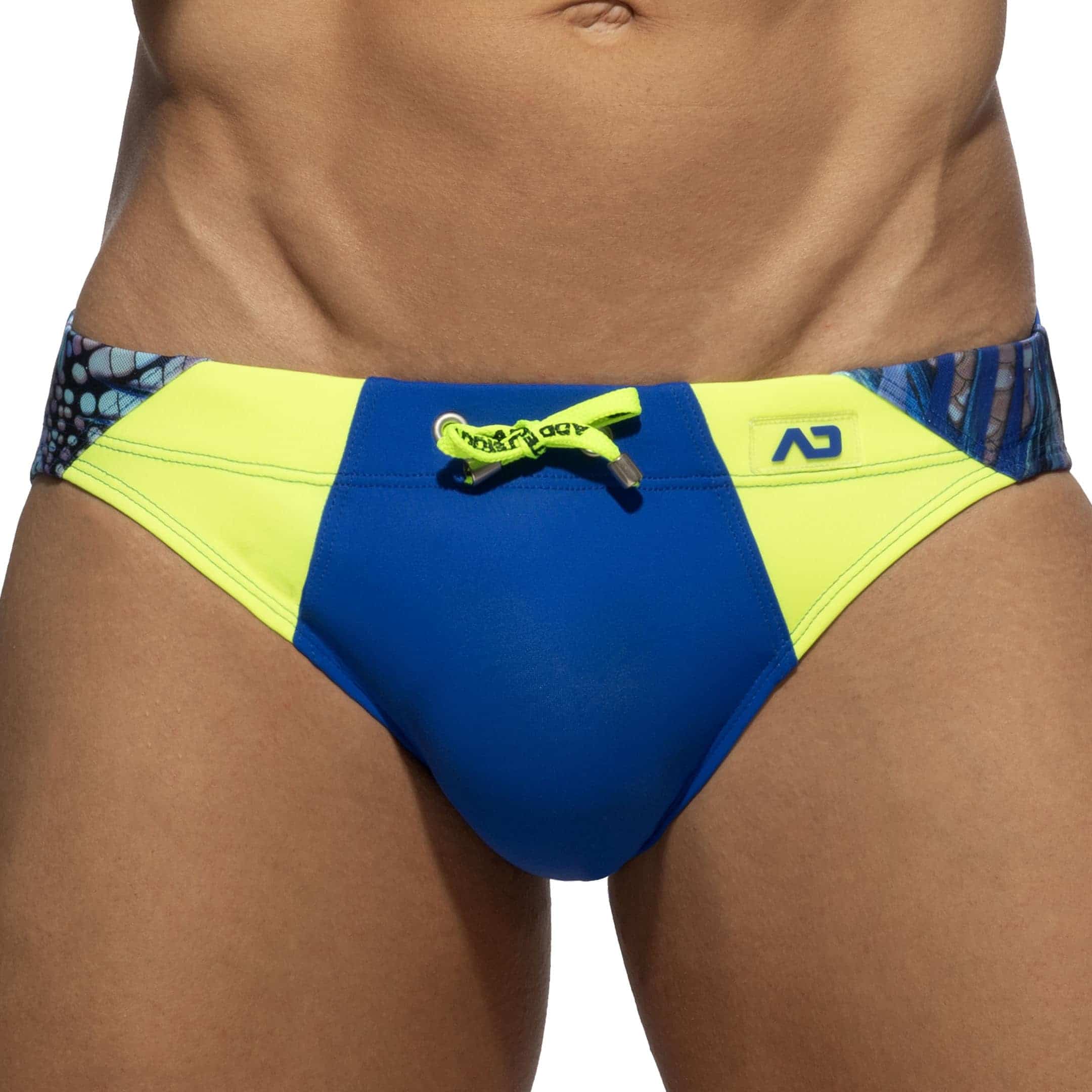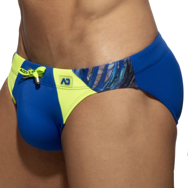 Sexy swim brief made from lightweight and breathable stretch microfiber. Fitted, low-rise cut. Contrast side inserts. Elastic waistband with drawstring. Seamless, molded front pouch for optimum comfort. Removable Pack Up foam system to enhance your masculinity. AD silicone label on the left hip.