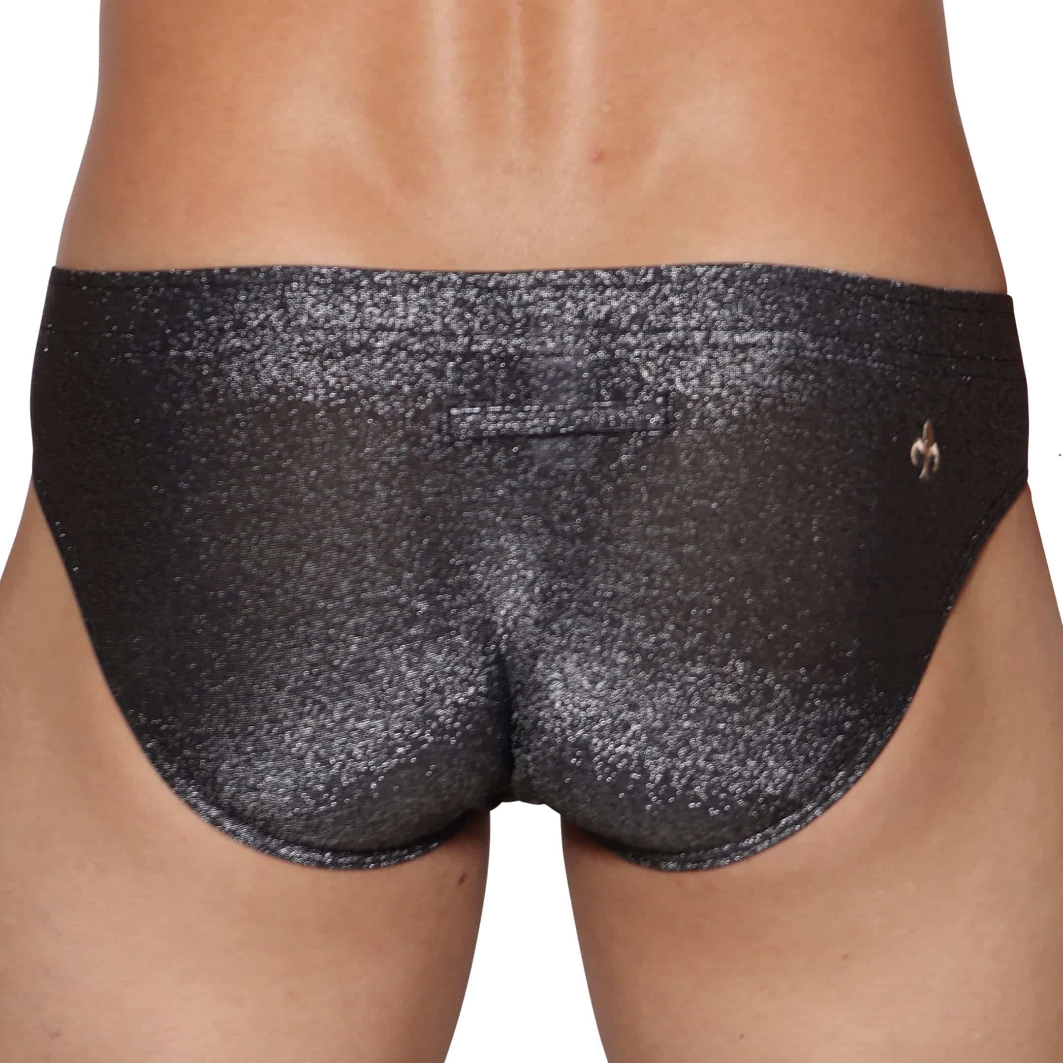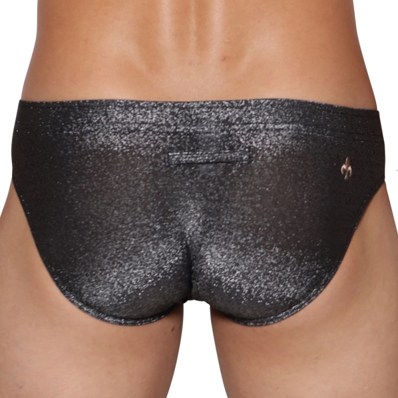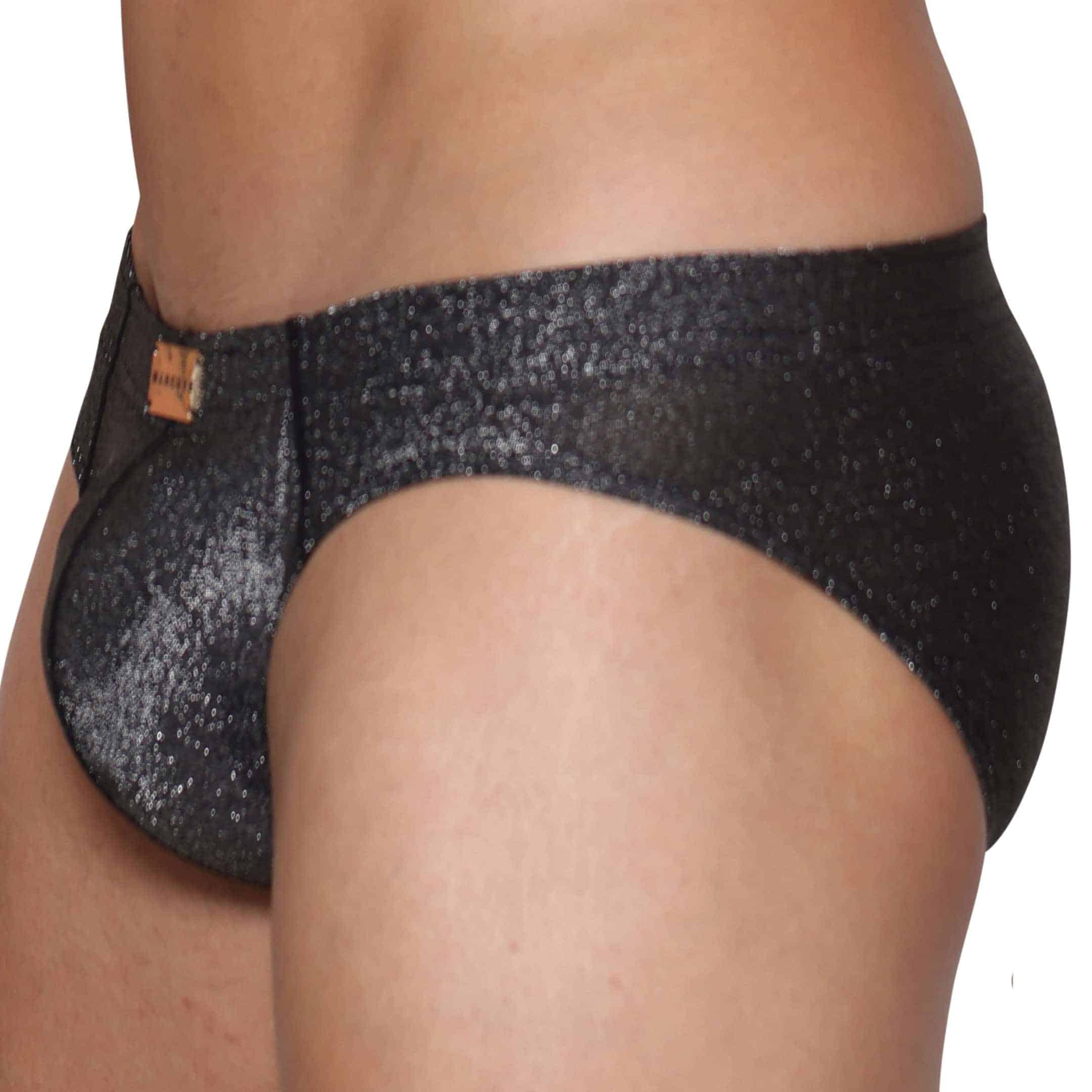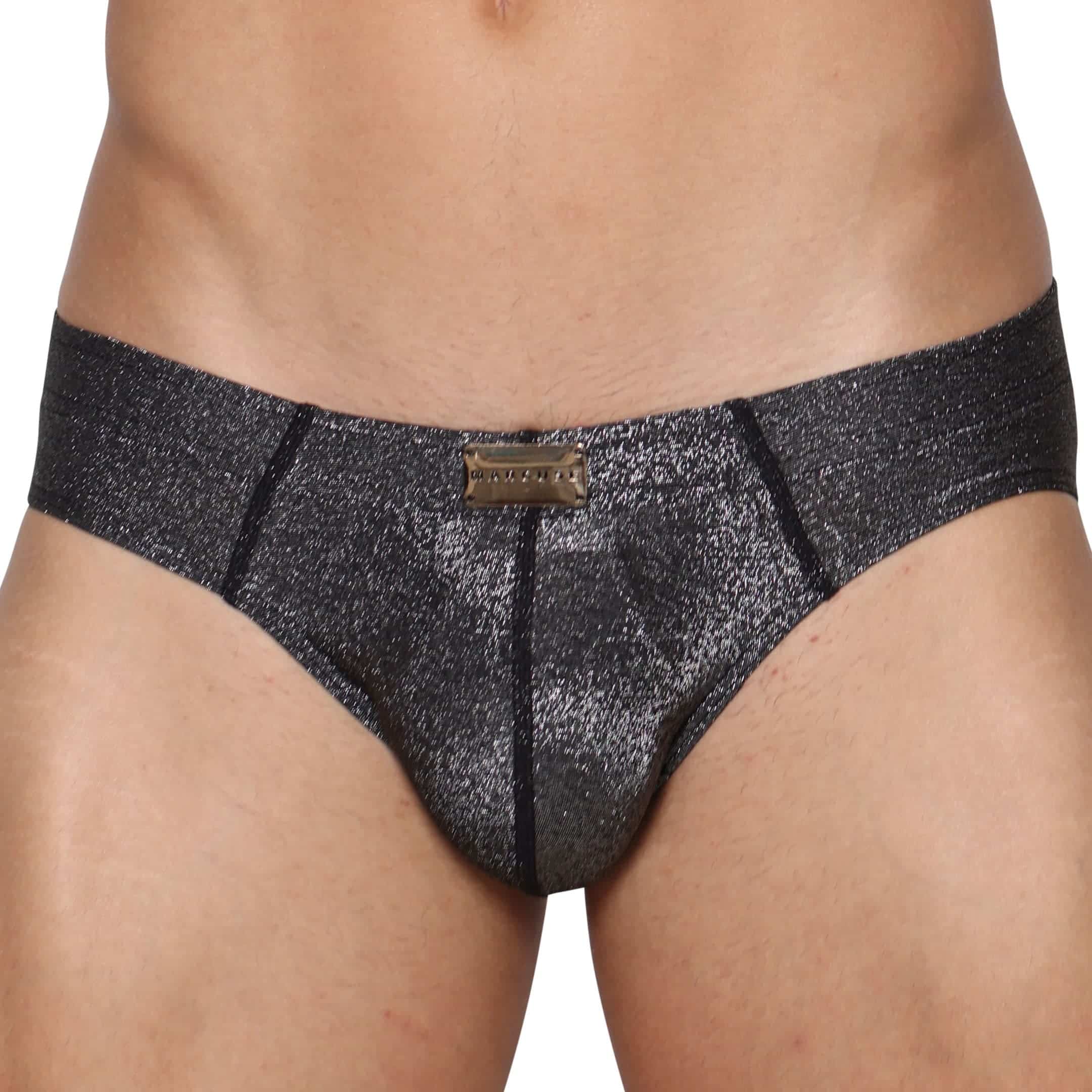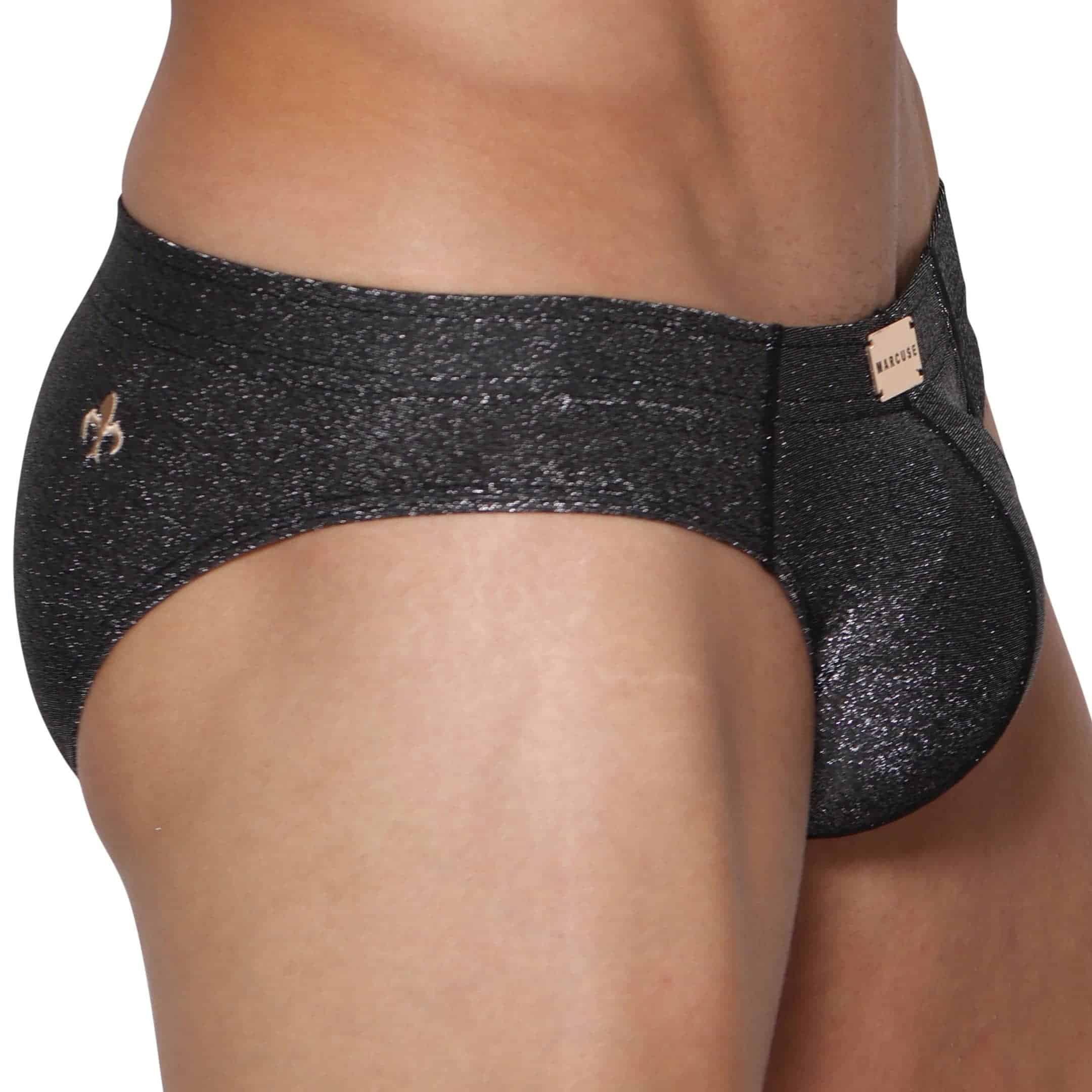 Sexy brief made from lightweight, comfortable stretch microfiber. Metallic yarn for a shiny glitter effect. Fitted low-rise cut. 3D lined pouch featuring a removable front pad. Covered elastic waistband with Marcuse gold plate. Embroidered logo on back.