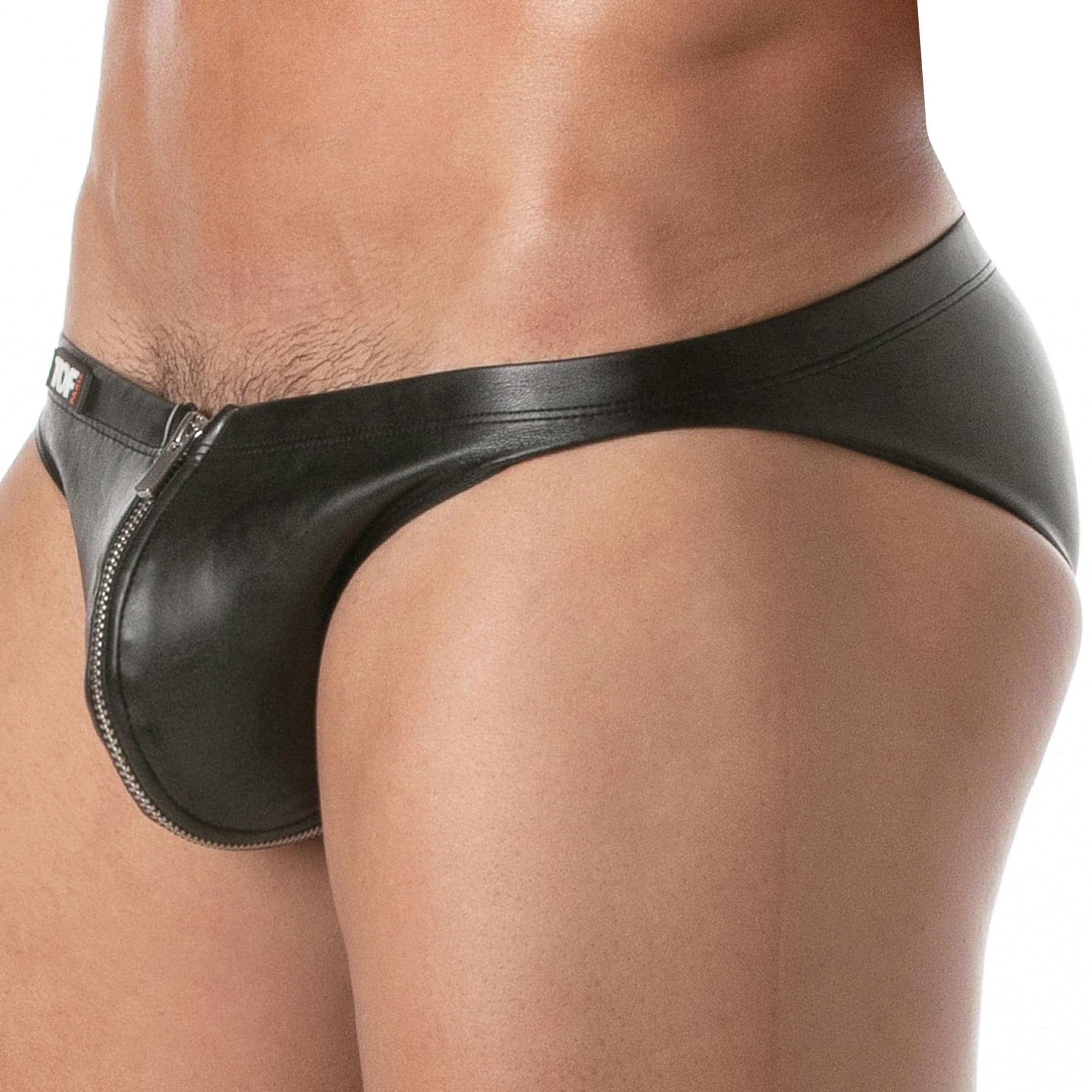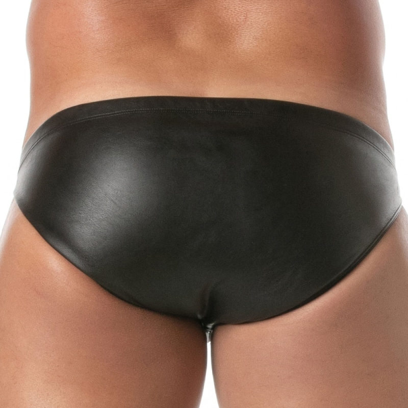 Sexy, provocative brief made from stretchy faux leather for a fetish look. Minimalist low-rise cut. Unlined shaped pouch with functional front zipper. TOF Paris label on the covered elastic waistband. Made in France. Care instructions: machine wash at 30°, do not tumble dry, do not iron.