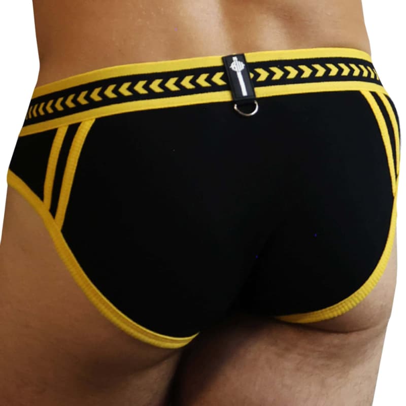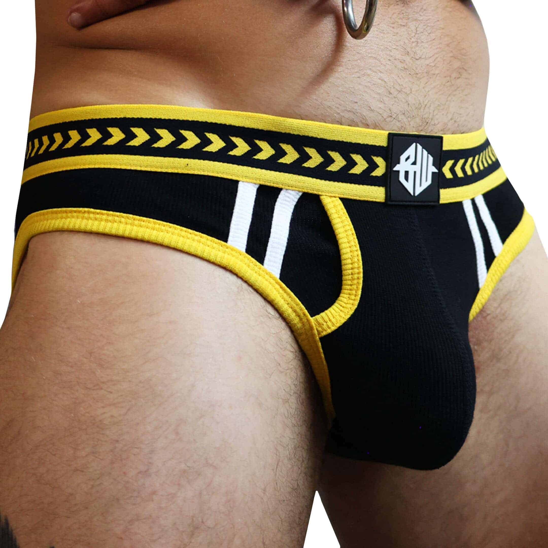 Sporty, sexy brief made from soft and comfortable ribbed stretch cotton. Back metallic ring. Contrast detailing. Unlined front pouch with fly opening on the right side for easy access. Herringbone elastic waistband with Breedwell patch on front and back.