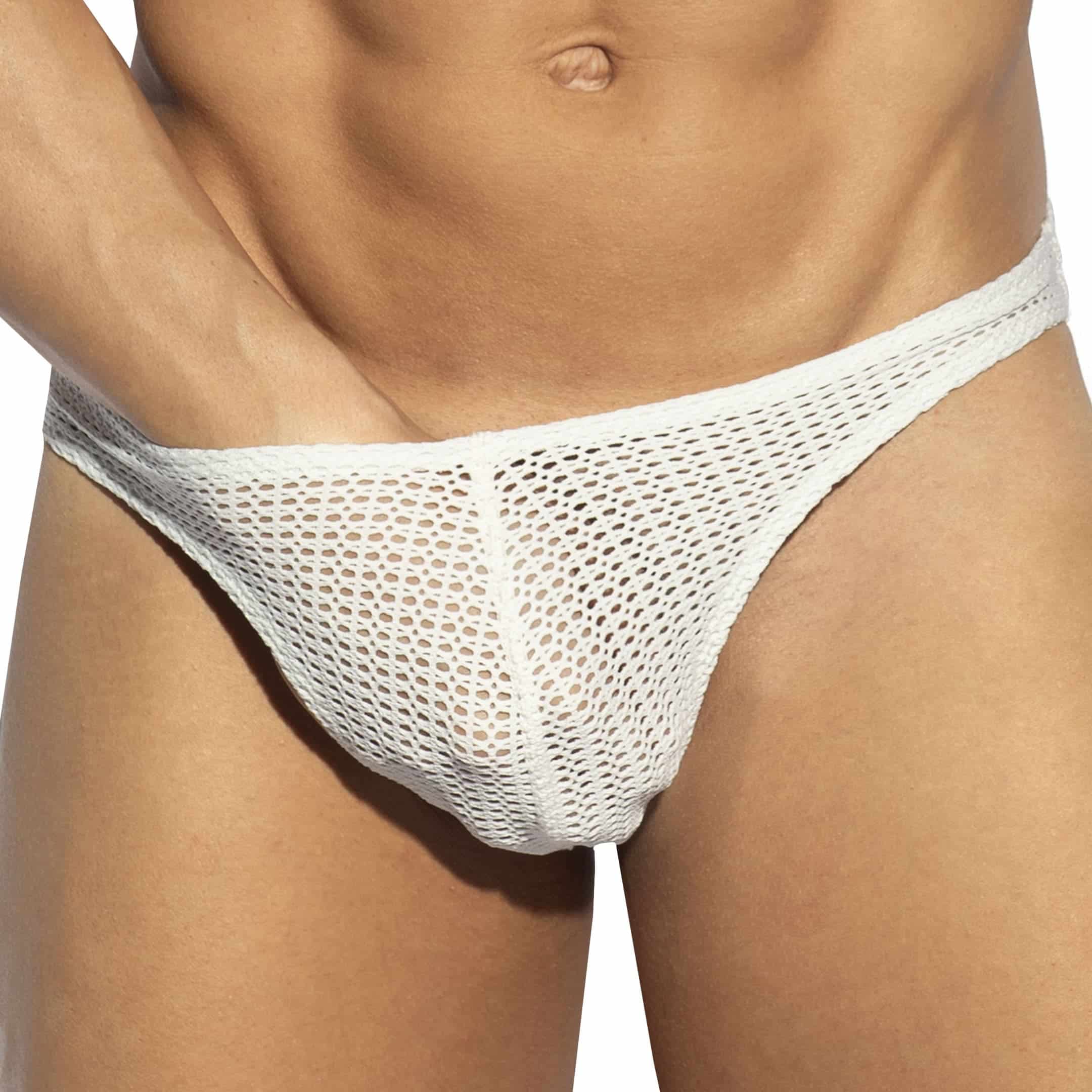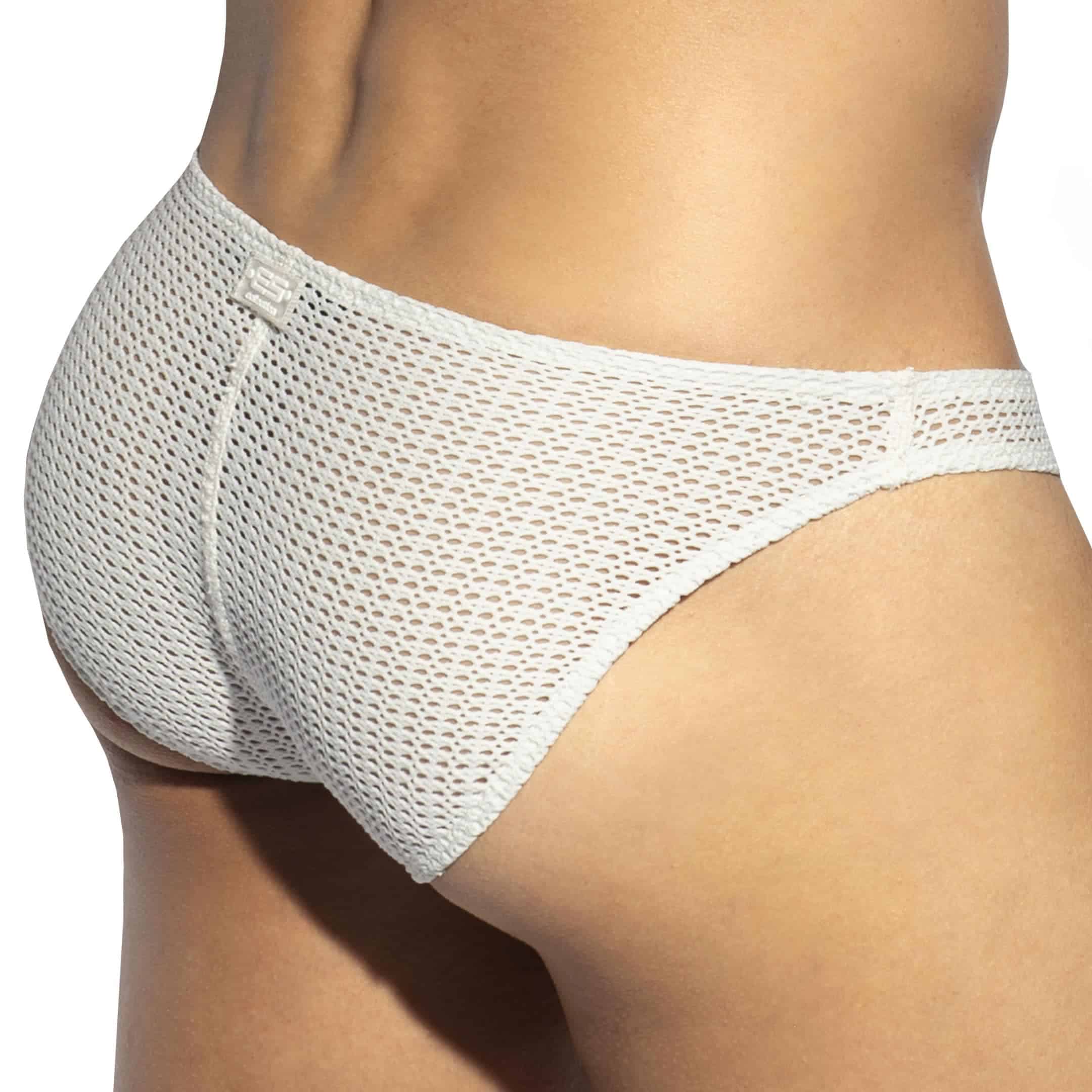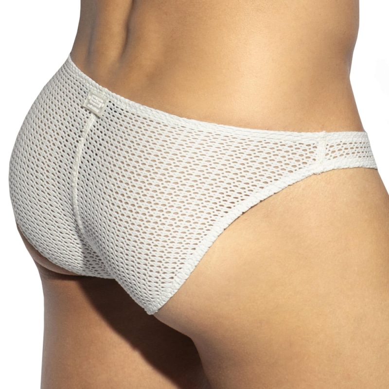 Comfortable, sexy brief made from wide-mesh fishnet for a bohemian chic look. Fabric recycled from plastic bottles. Unlined for total transparency. Minimalist and fitted cut. ES silicone label at the top of the buttocks.