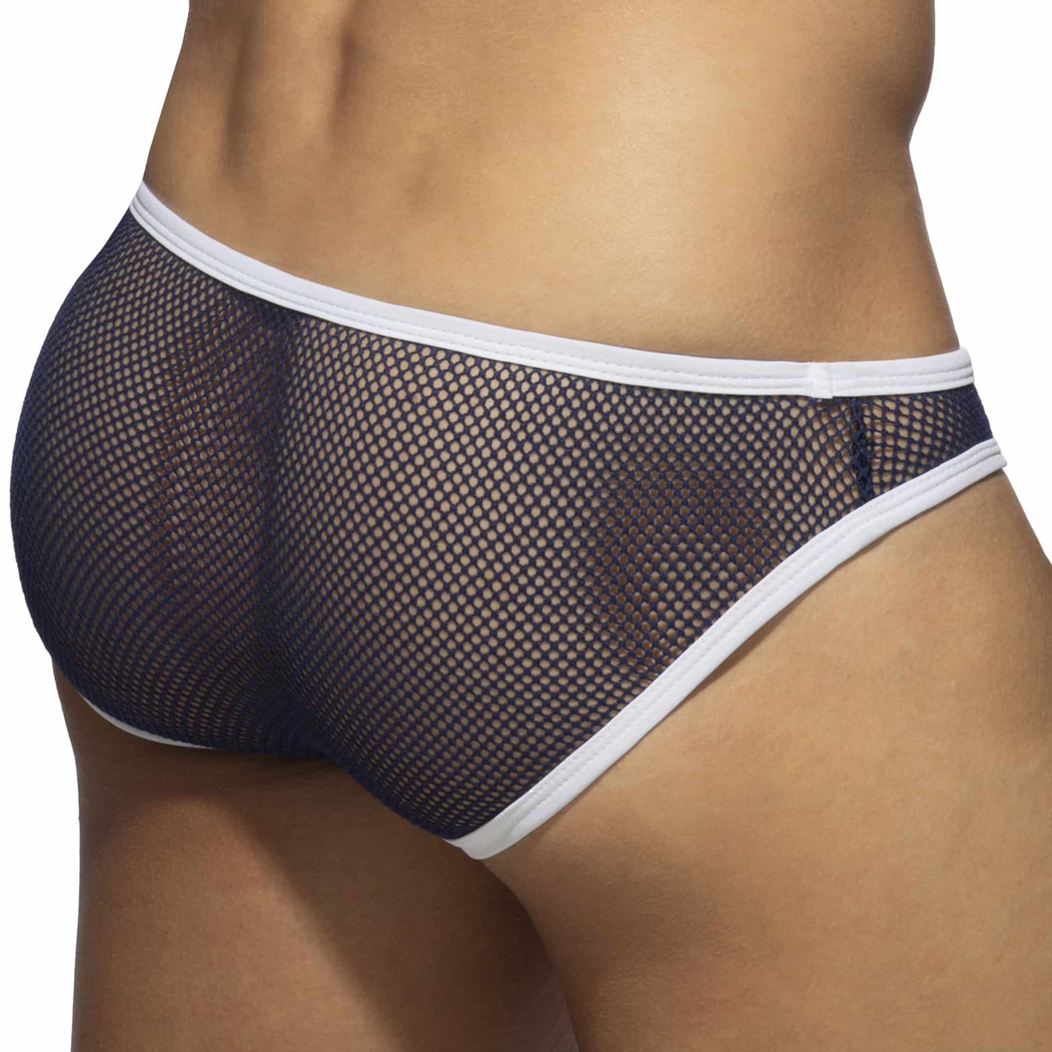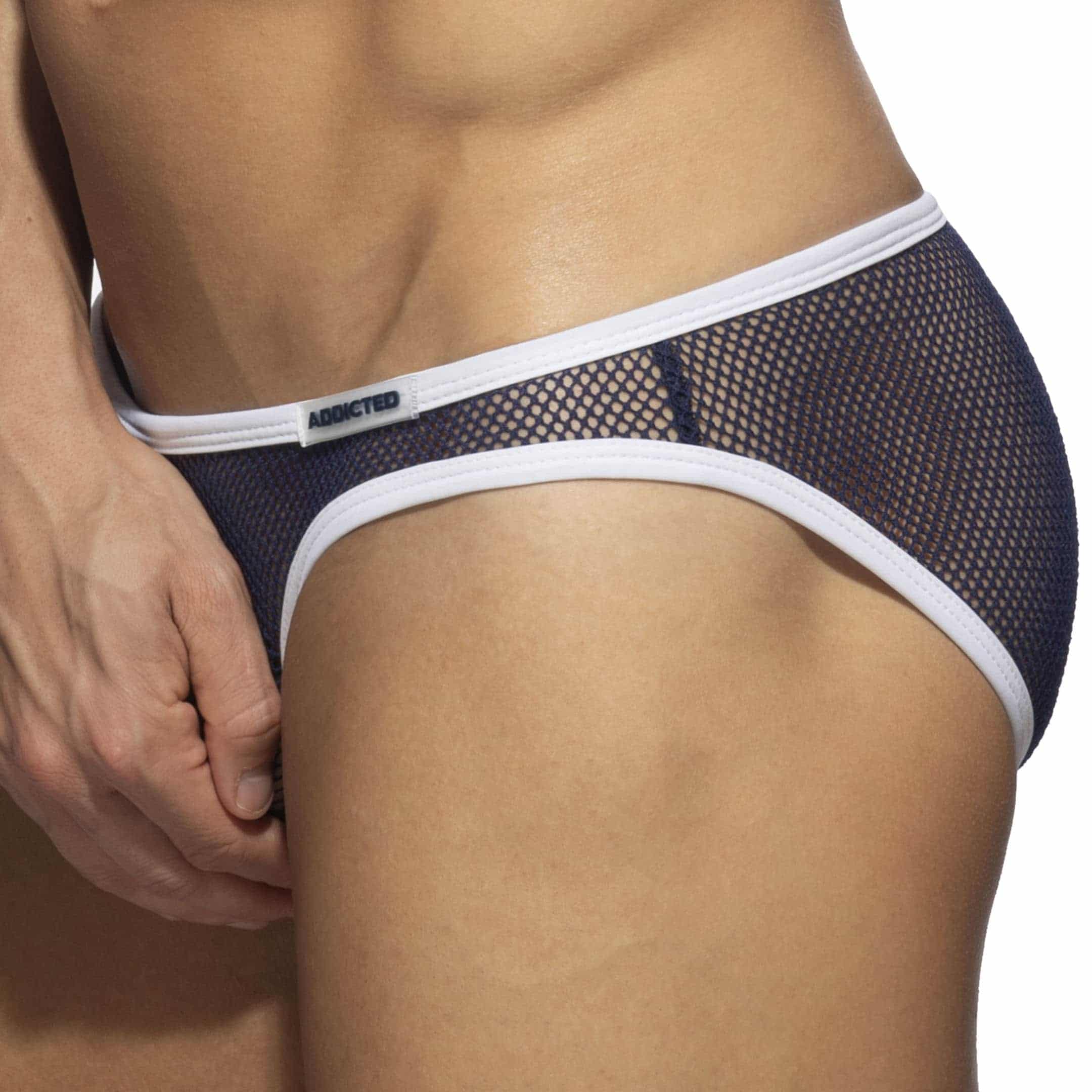 Provocative brief made from see-through mesh fabric. Minimalist, body-hugging low cut. Molded seamless pouch for best comfort. Contrast trim. Addicted silicone logo on thin elastic waistband.